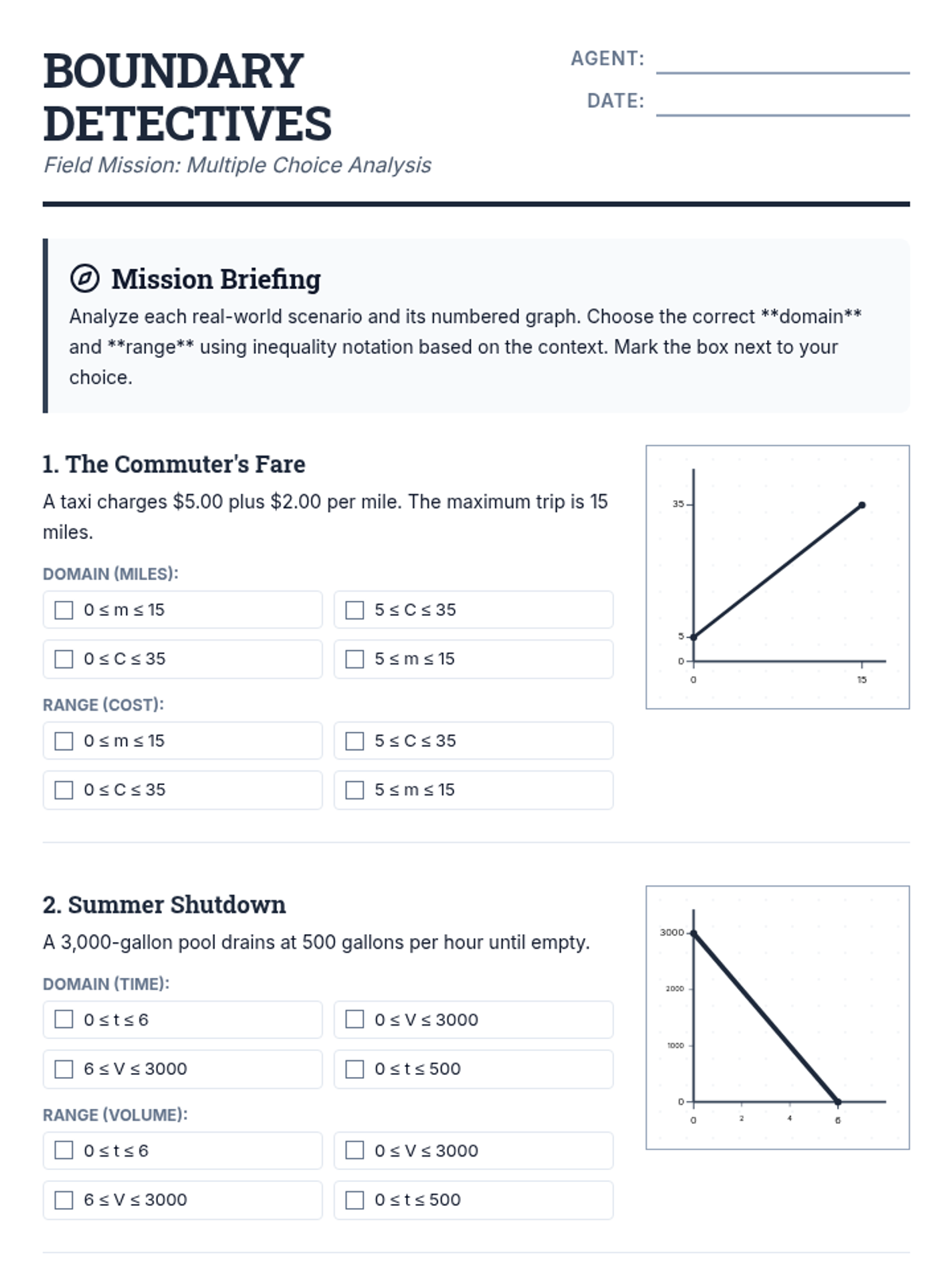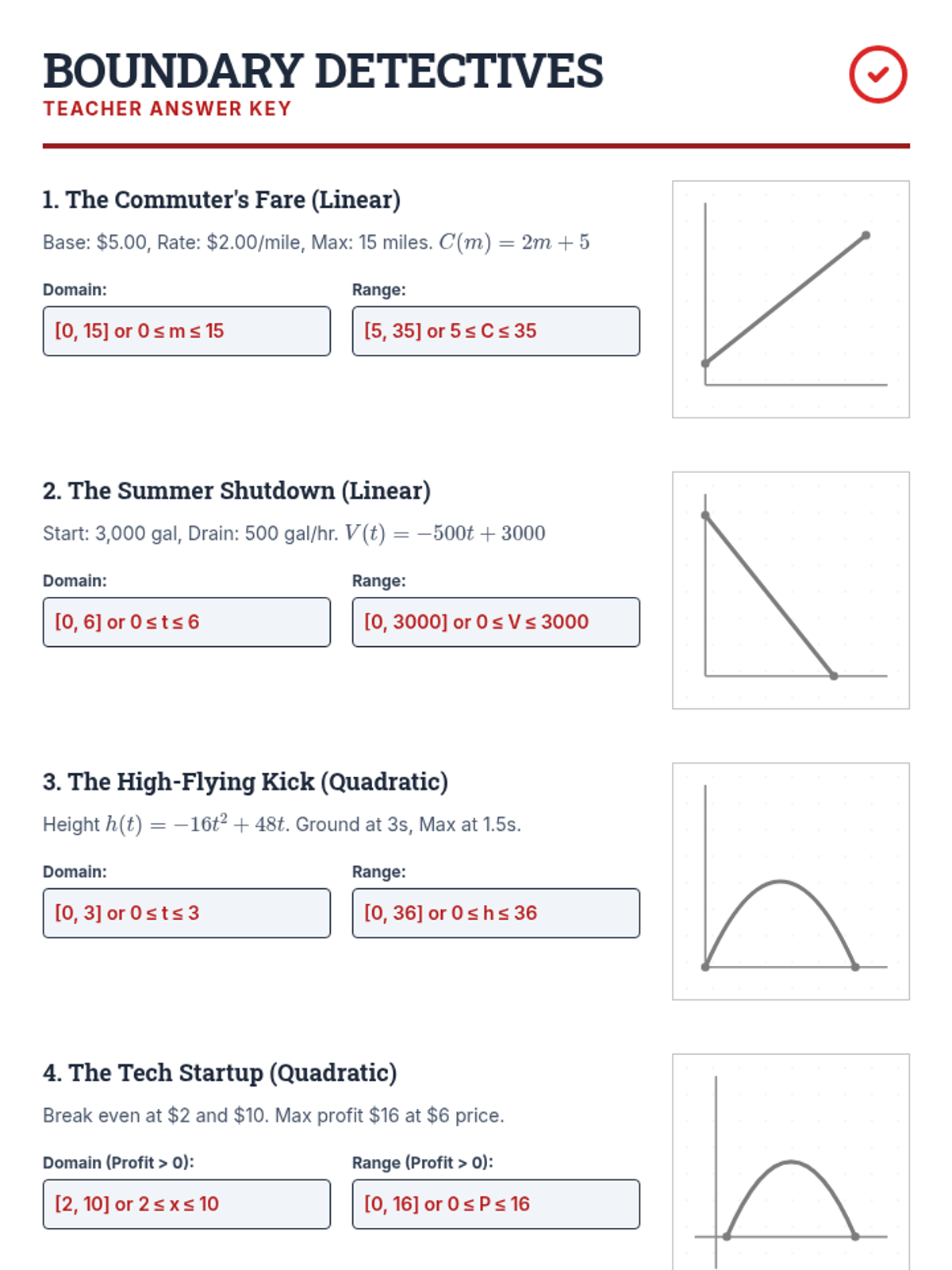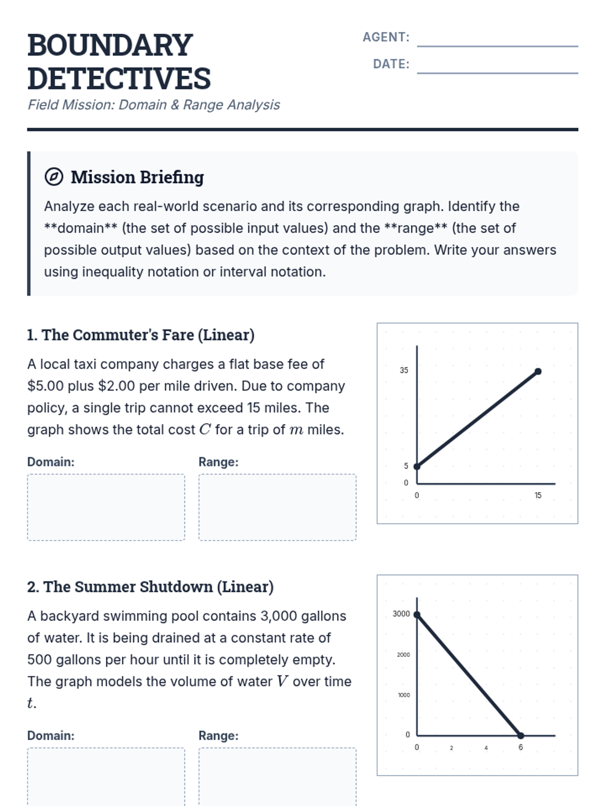 A lesson focused on identifying the domain and range of real-world scenarios using linear, quadratic, and exponential graphs. Students will analyze situational constraints to determine the appropriate sets of input and output values.