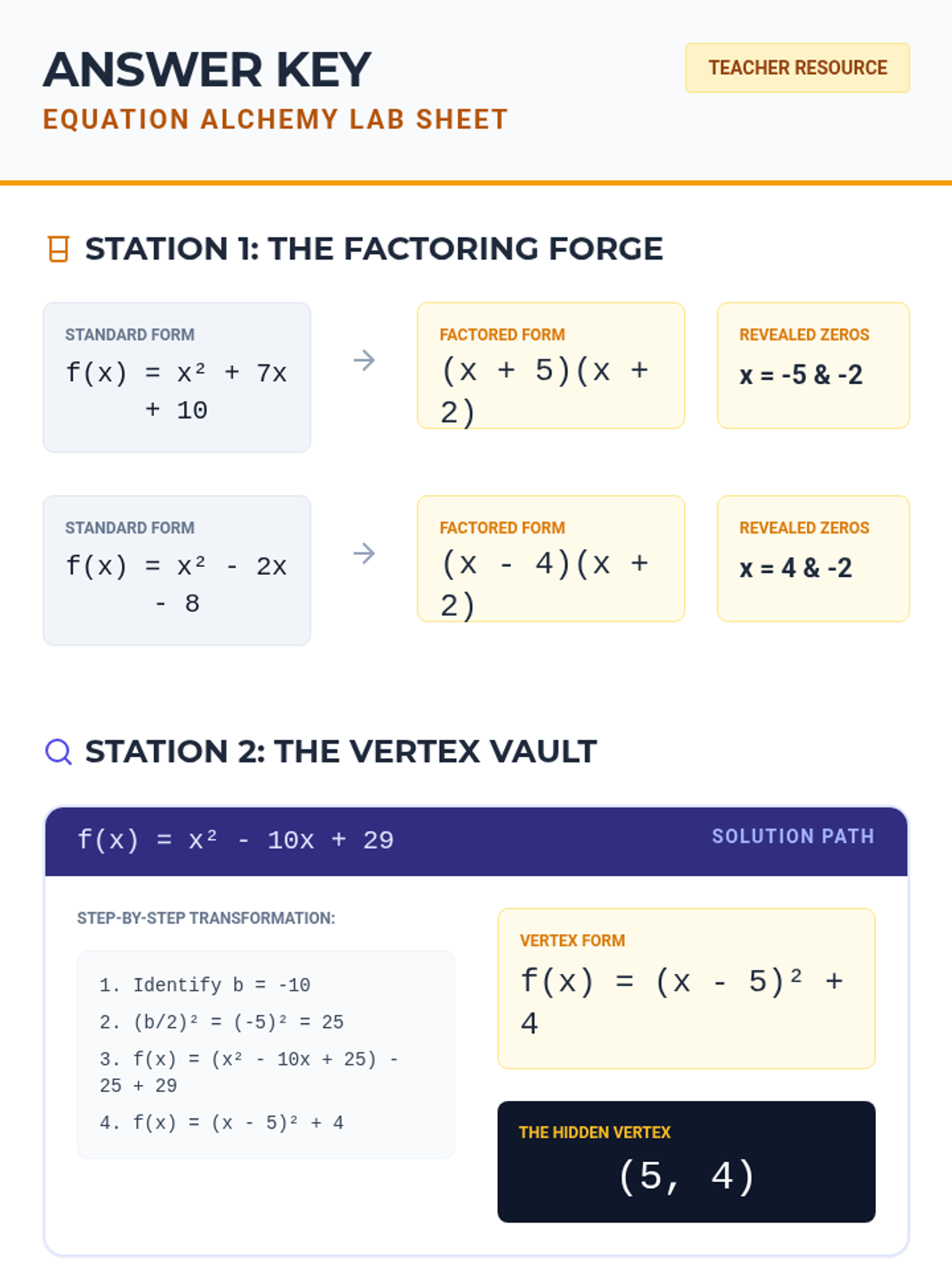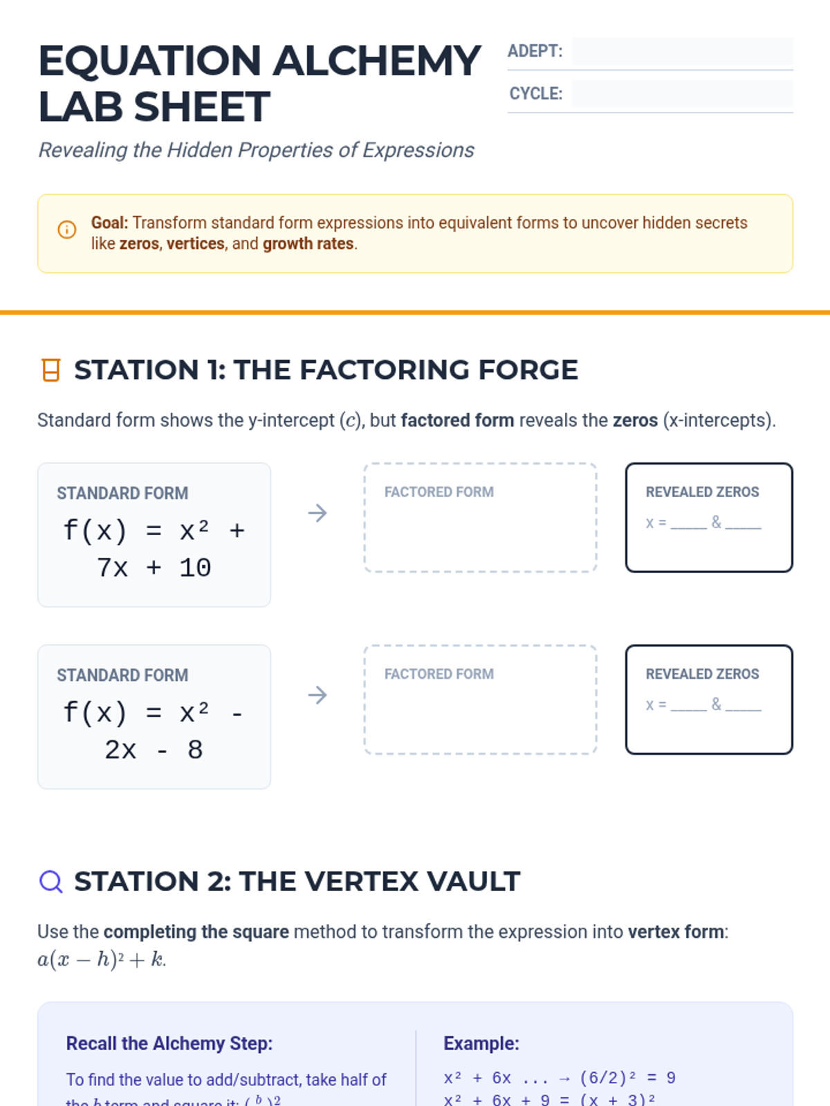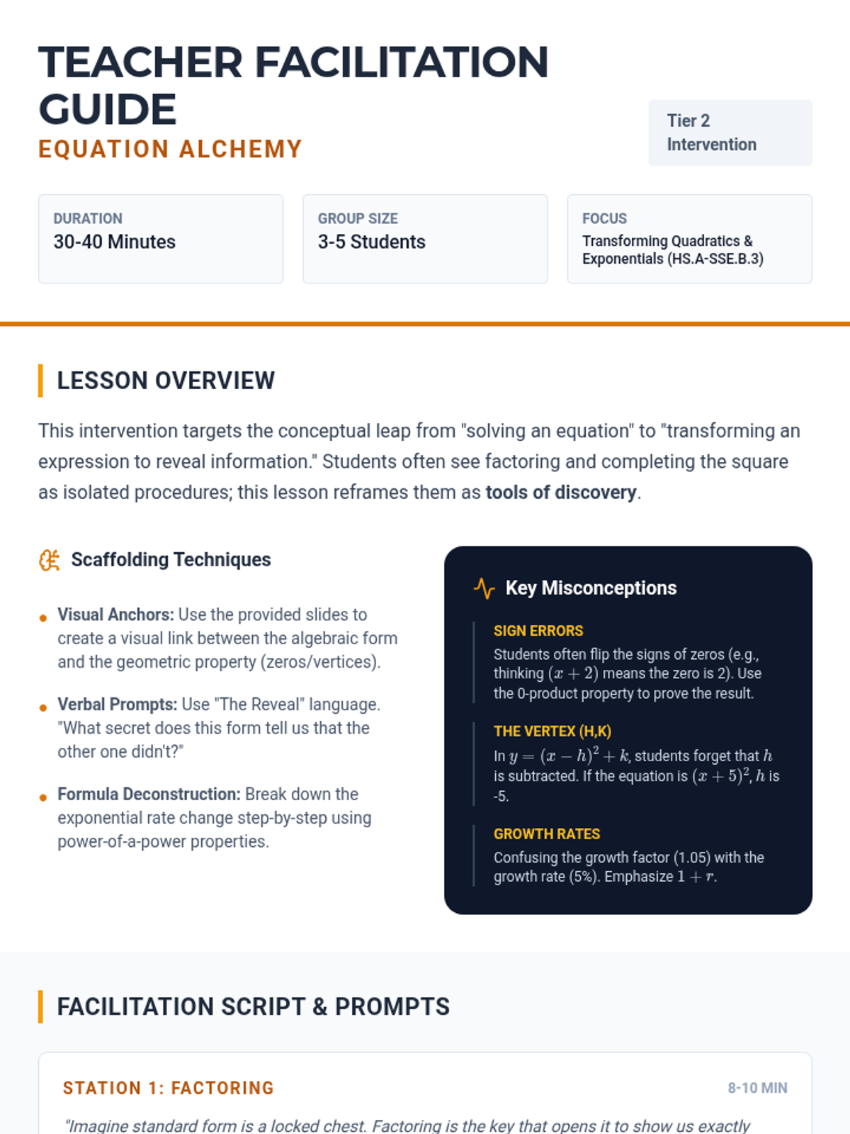A Tier 2 small group intervention focused on transforming quadratic and exponential expressions to reveal key mathematical properties like zeros, vertices, and growth rates. Includes scaffolded instruction, multi-method practice, and formative assessment.