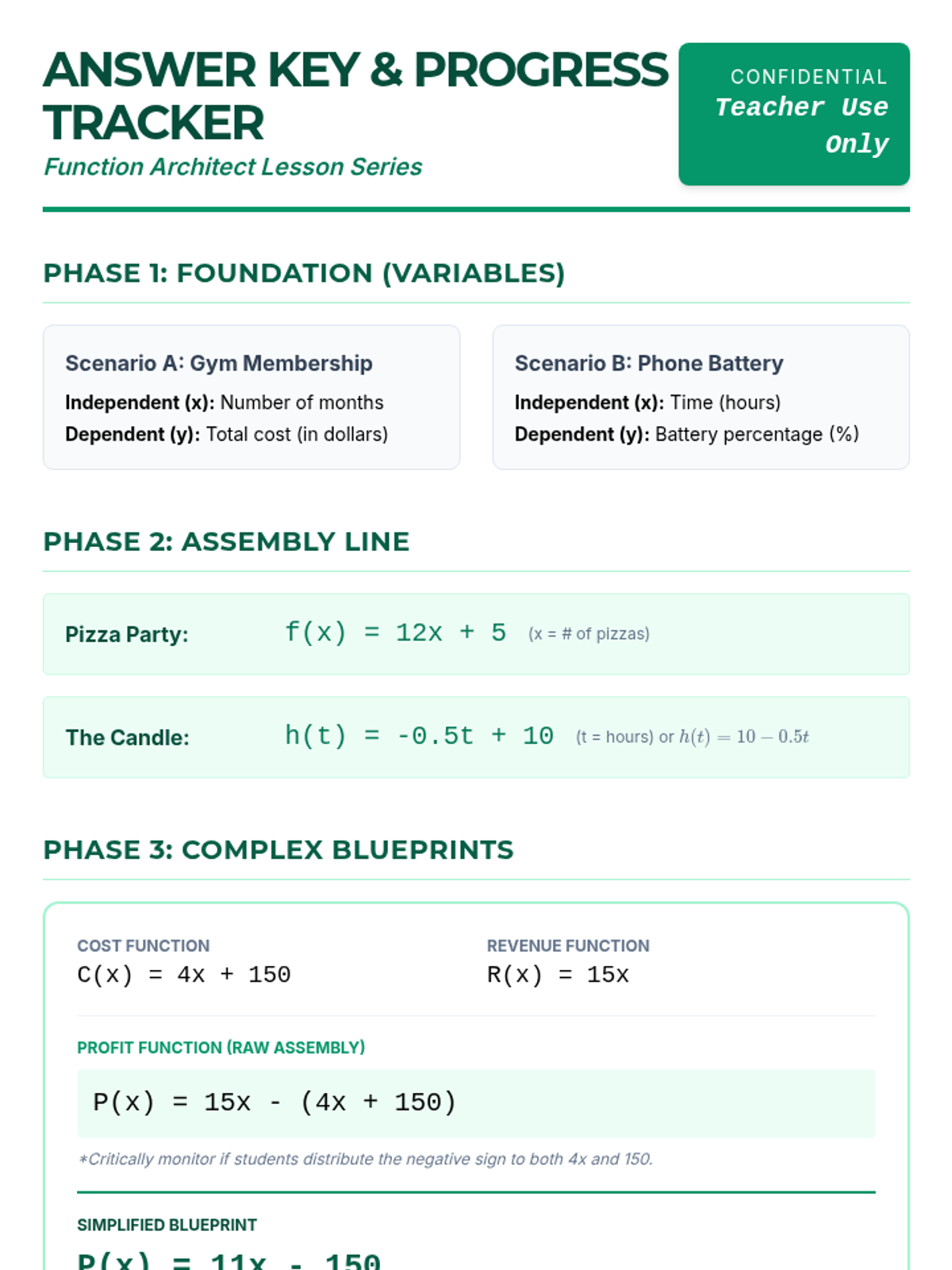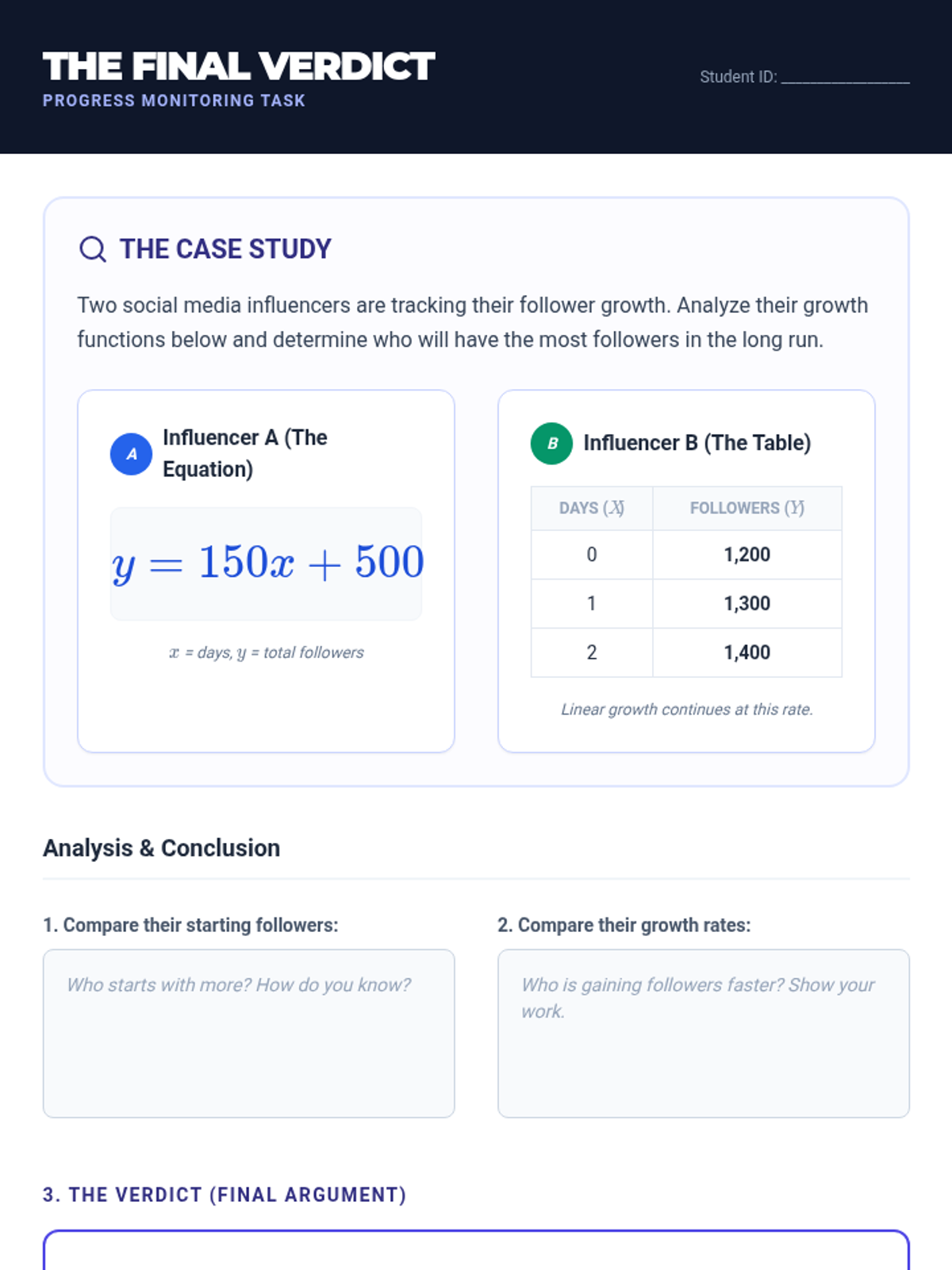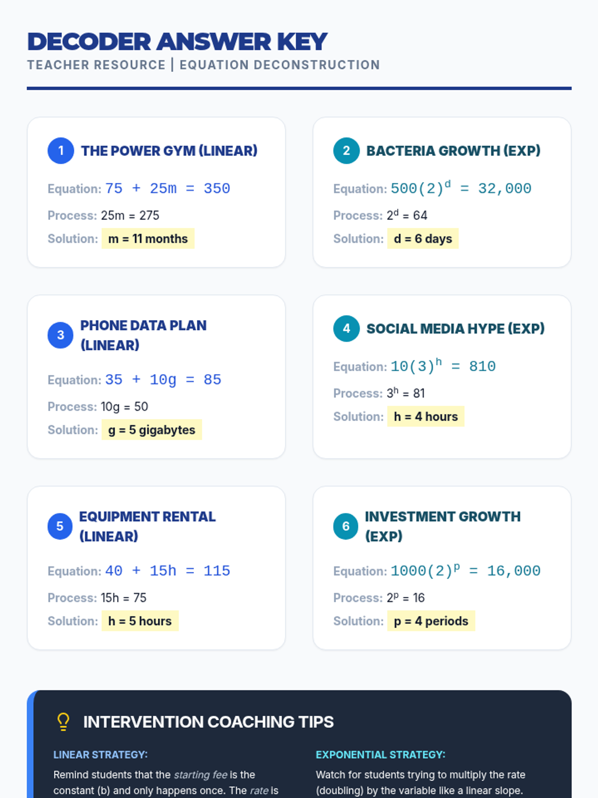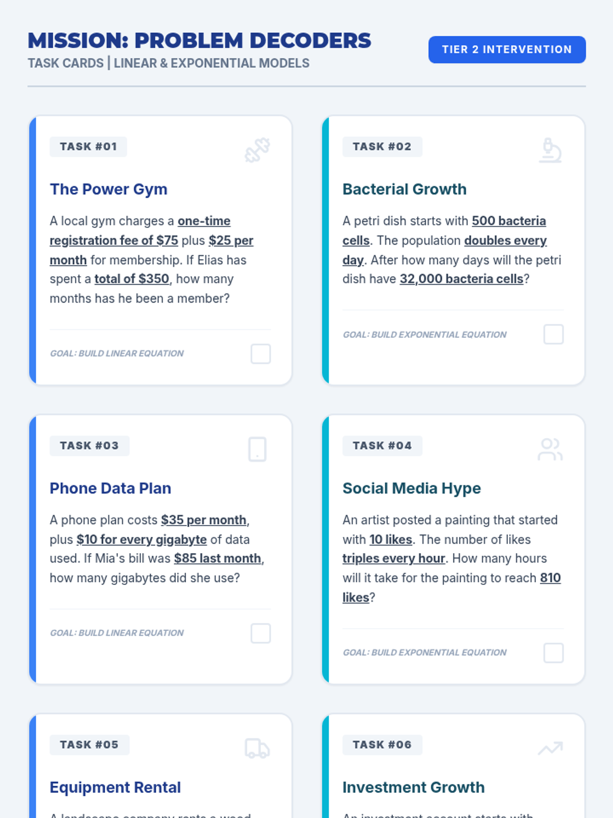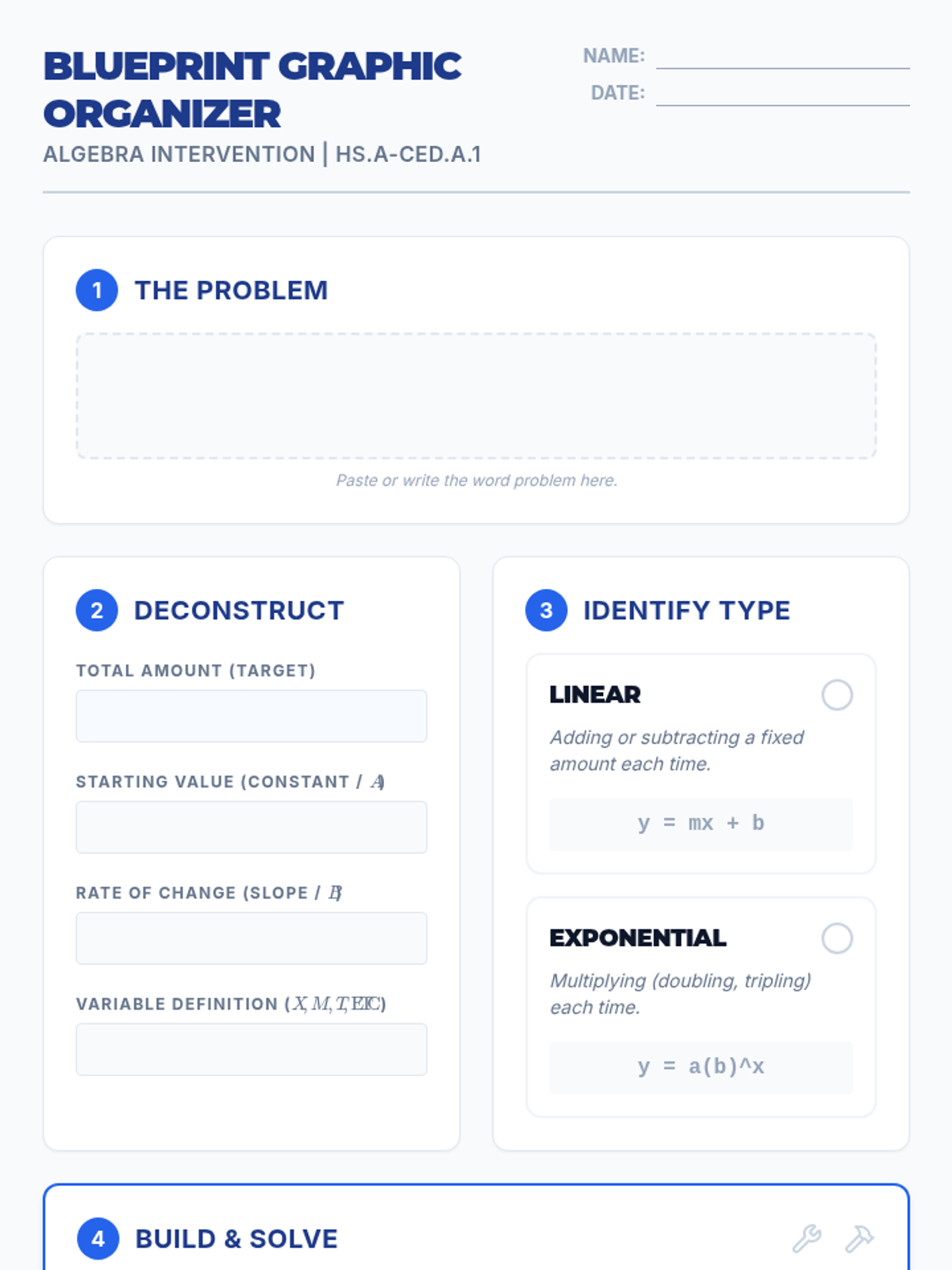 A targeted intervention lesson focused on breaking down complex word problems into solvable algebraic equations. Students use a structured graphic organizer to identify variables, constants, and relationships across linear and exponential contexts.