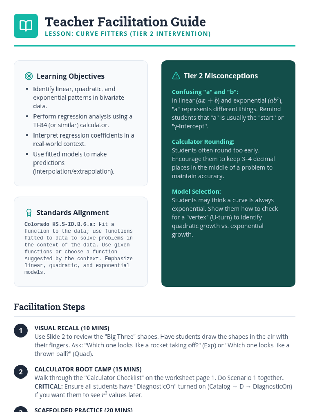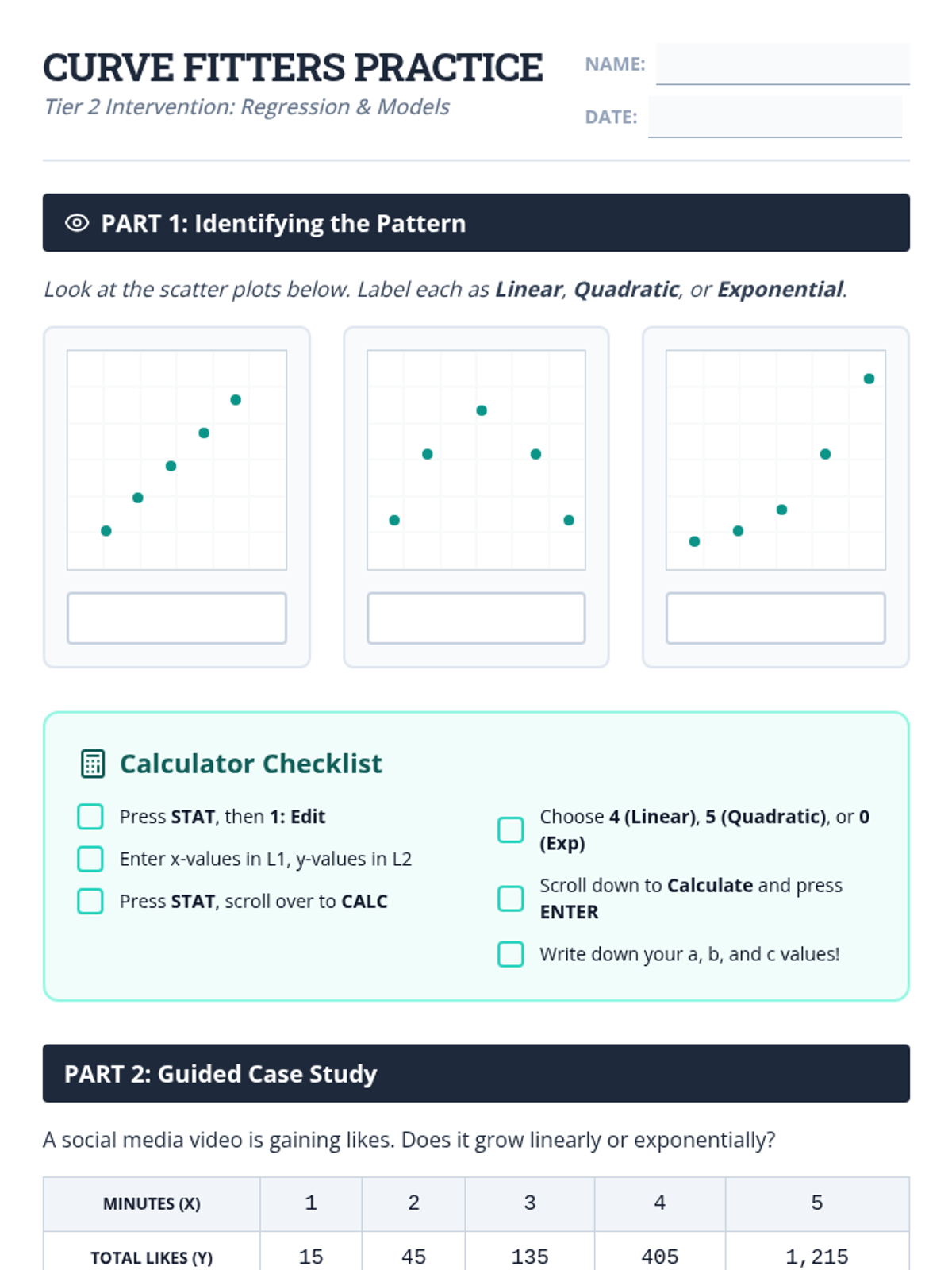 A targeted Tier 2 intervention lesson for high school statistics students on selecting and fitting linear, quadratic, and exponential models to bivariate data. The lesson focuses on calculator procedures and real-world interpretation.