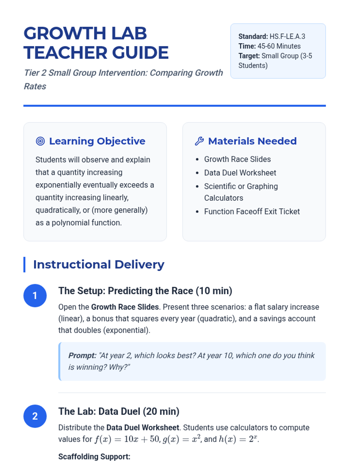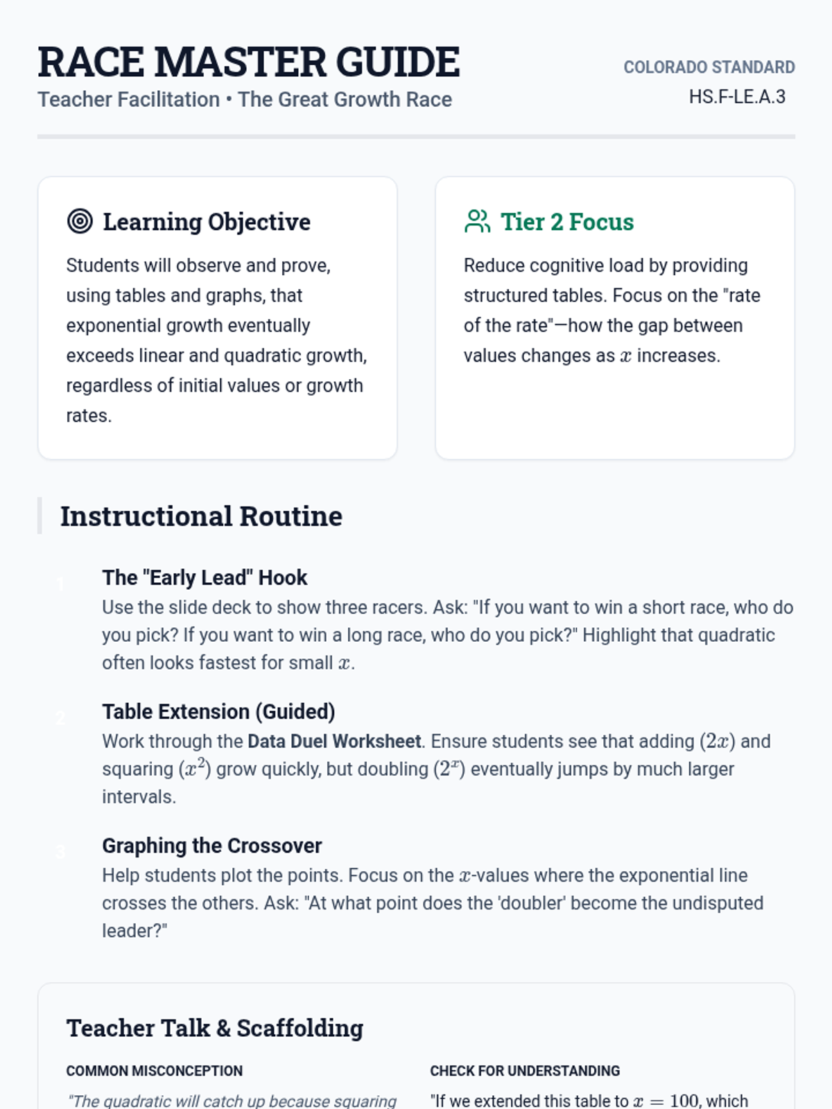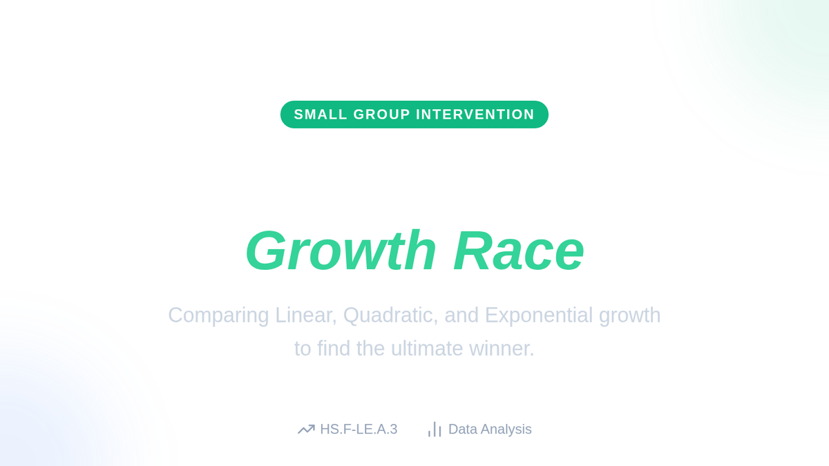 A Tier 2 small group intervention focused on comparing linear, quadratic, and exponential growth. Students use tables and graphs to discover that exponential functions eventually surpass all others, specifically targeting Colorado Standard HS.F-LE.A.3.
