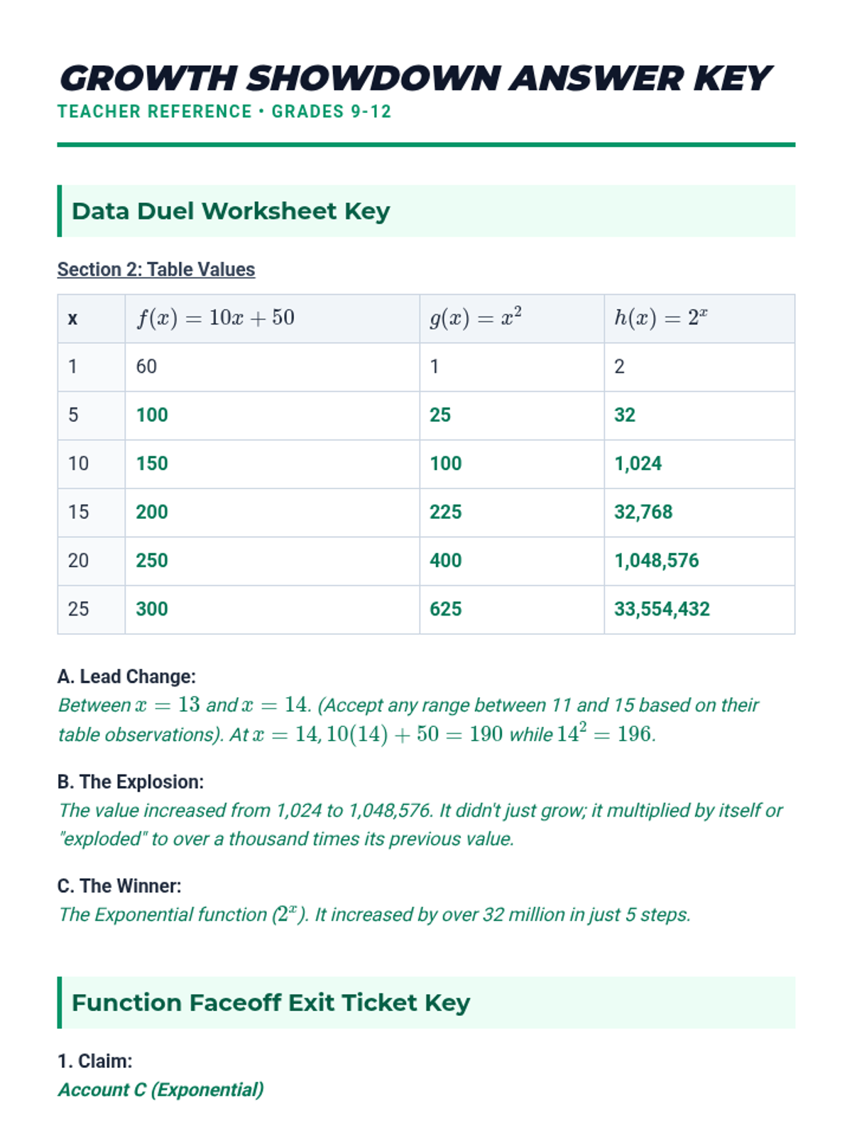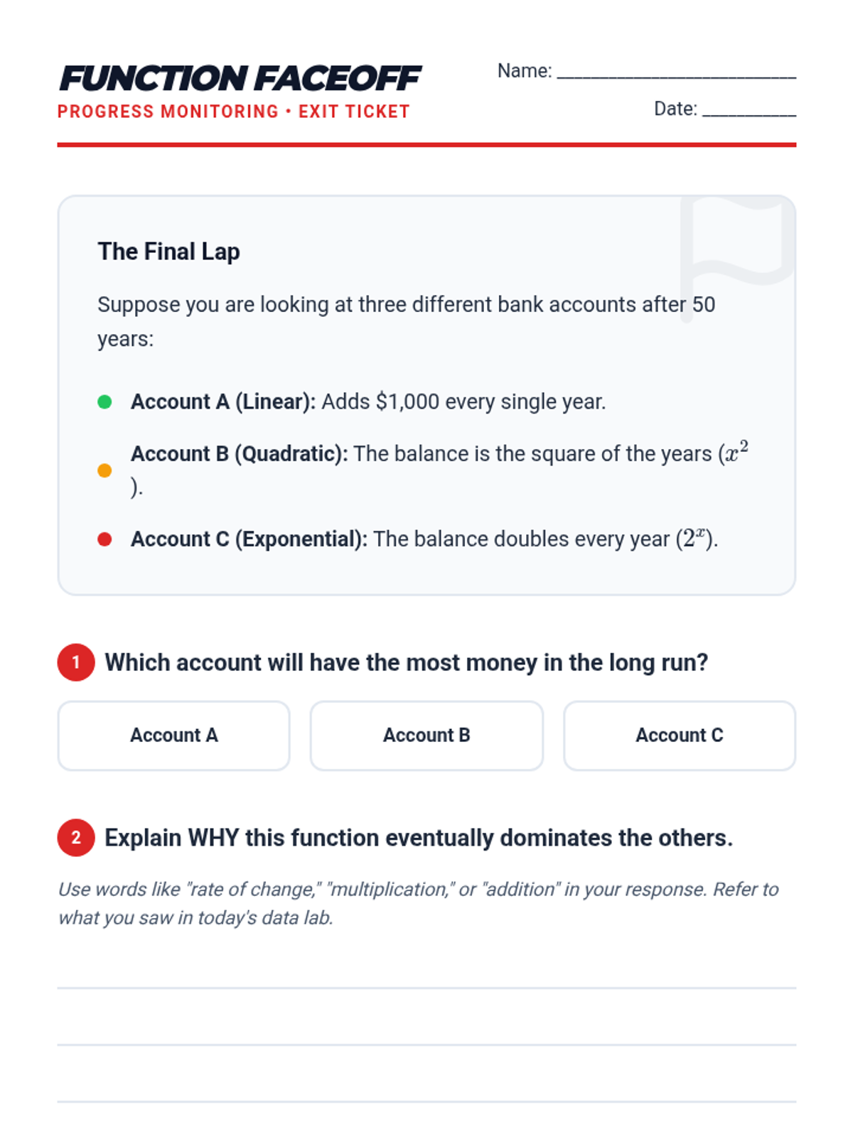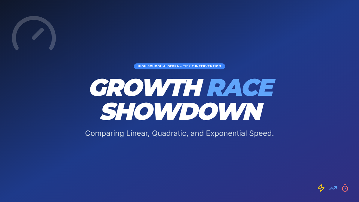 A Tier 2 small group intervention focused on comparing linear, quadratic, and exponential growth. Students use tables and graphs to discover that exponential functions eventually surpass all others, specifically targeting Colorado Standard HS.F-LE.A.3.