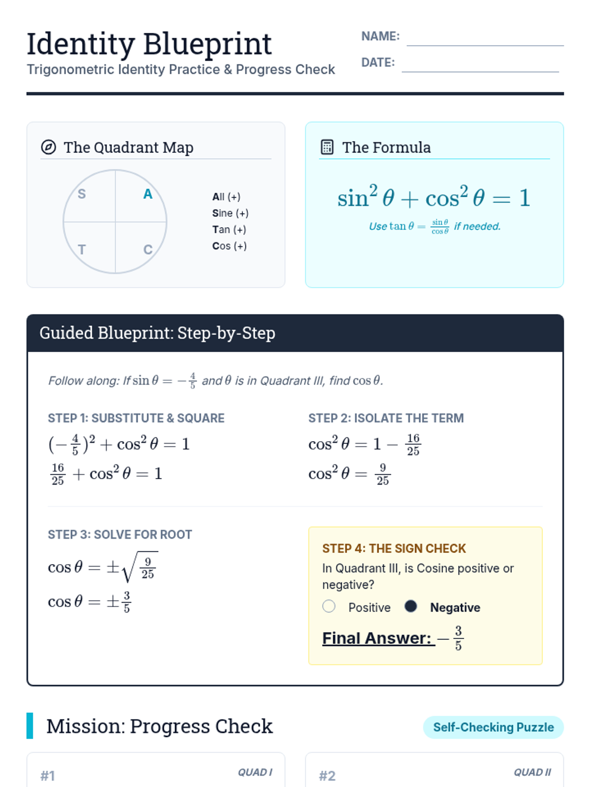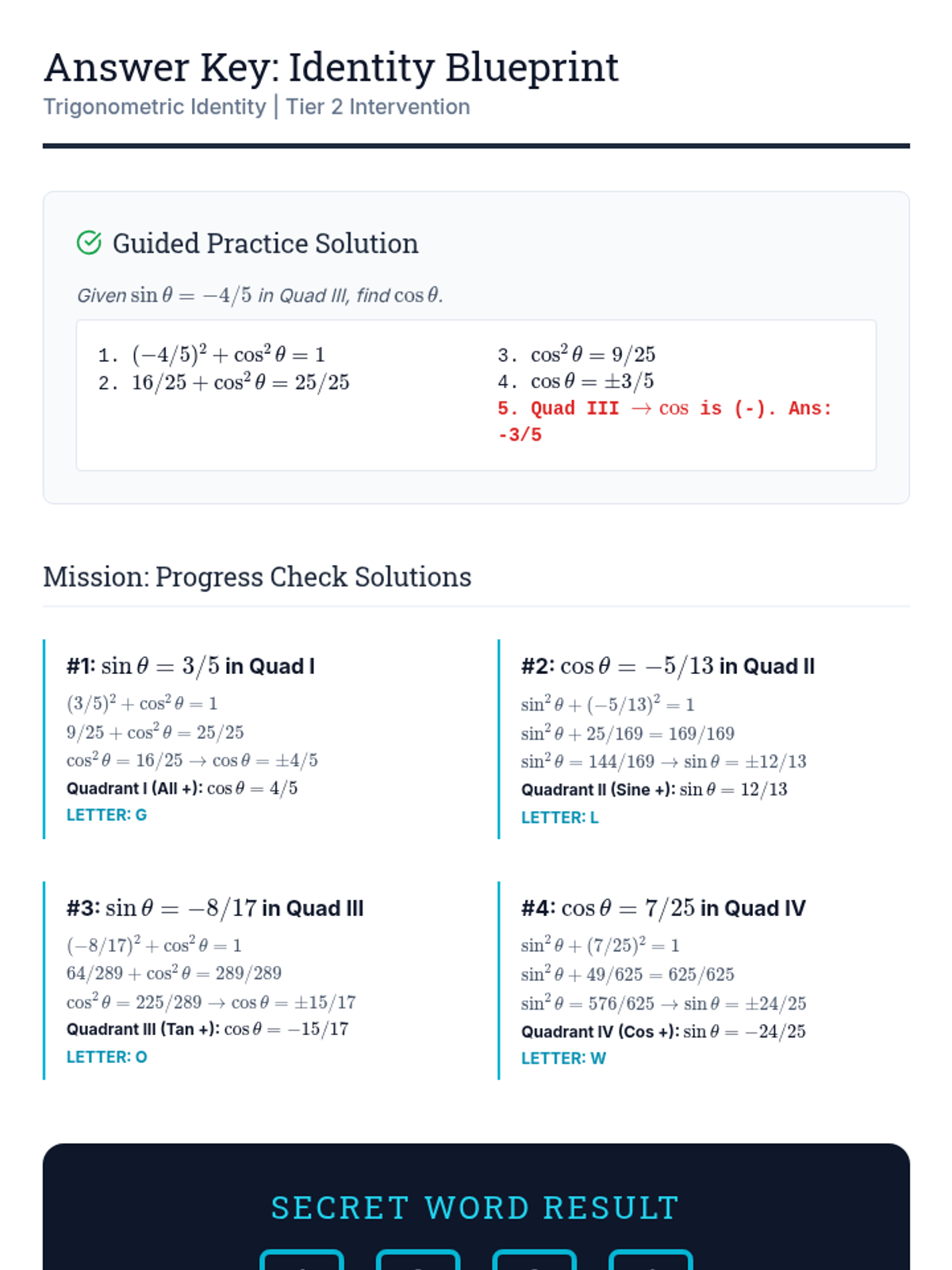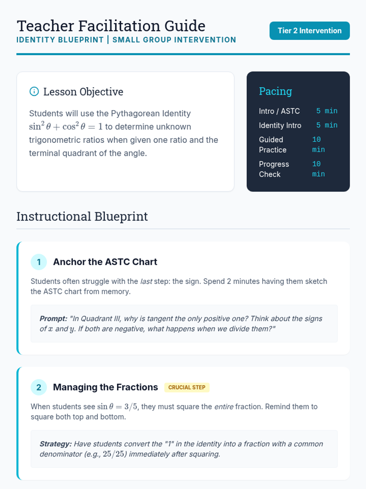 A targeted intervention lesson focusing on the Pythagorean Identity to find trigonometric ratios. Includes scaffolded instruction on quadrant signs and step-by-step calculation techniques for small group support.