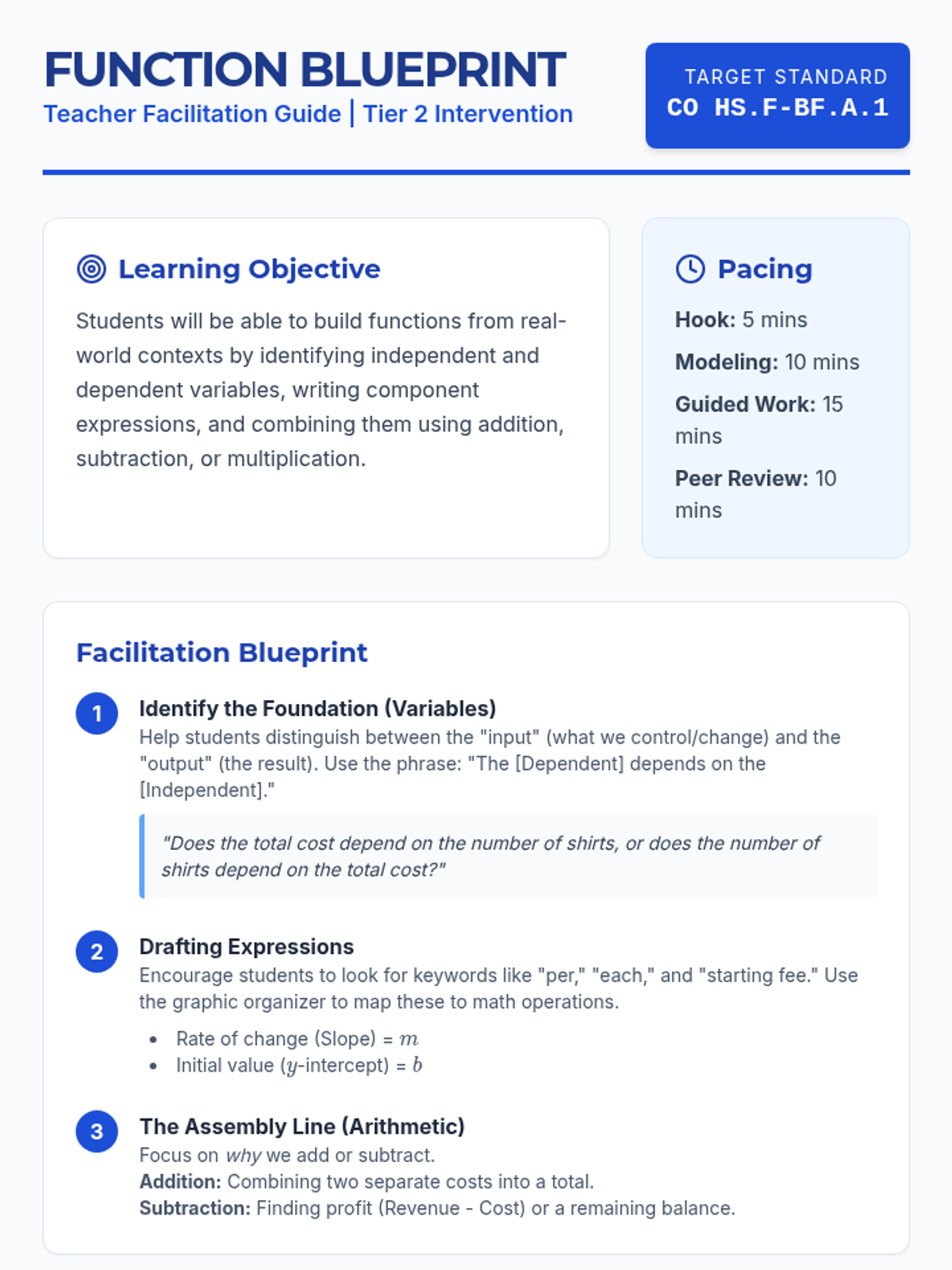 A Tier 2 small group intervention lesson focused on building complex functions from real-world contexts by breaking them down into simpler components and using arithmetic operations.