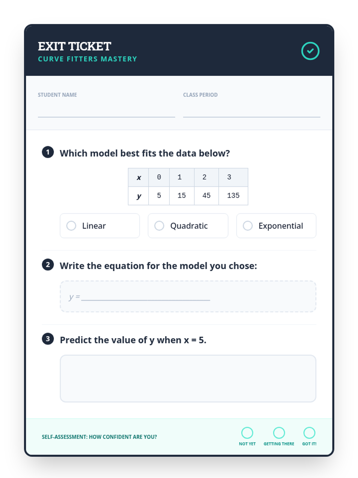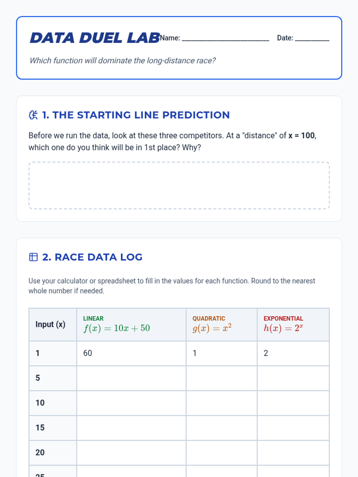 Students will investigate the visual and numerical differences between linear and exponential models through a data-matching card sort and real-world scenario analysis.