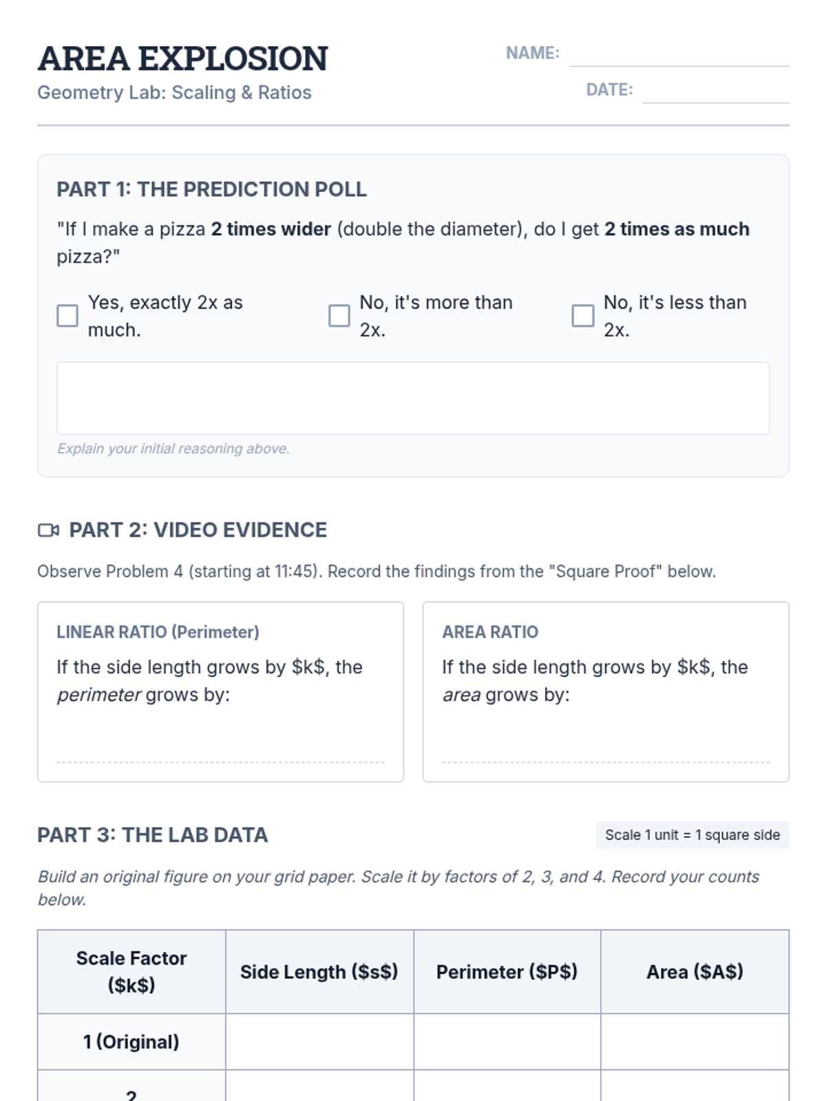 Students discover the quadratic relationship between scale factor and area by building scaled figures and graphing the resulting growth patterns.