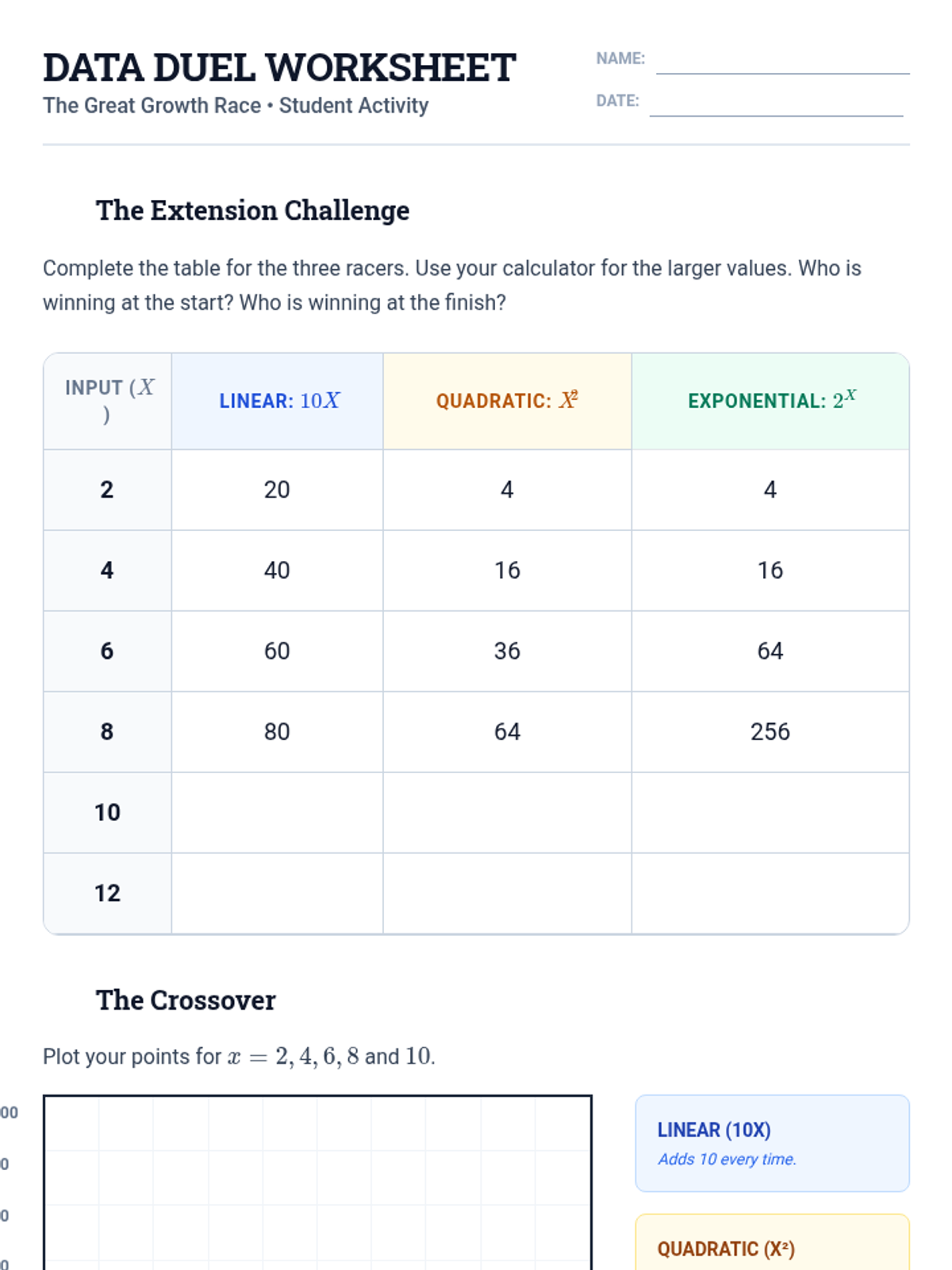 A 9th-grade algebra lesson where students explore the visual differences between linear and exponential growth models through storytelling, data creation, and graphing.