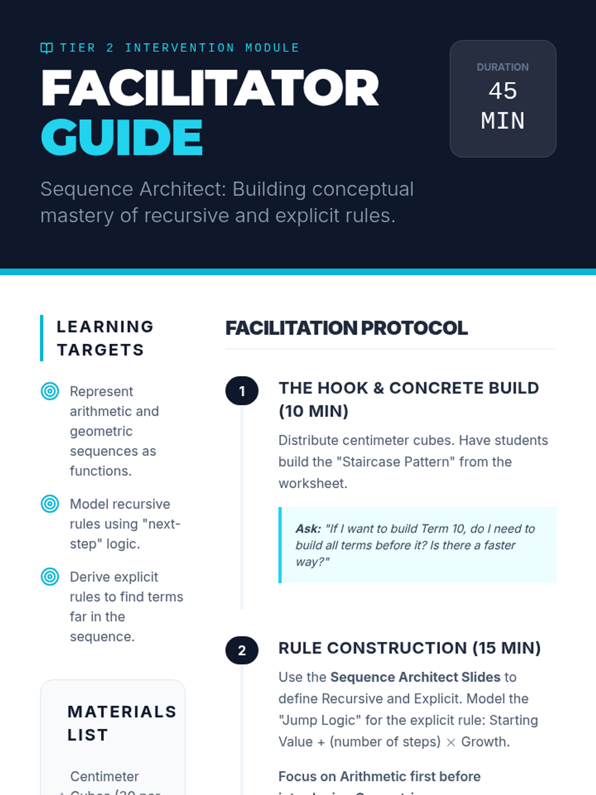 A targeted Tier 2 intervention lesson for high school students focusing on sequences as functions. Students will use visual patterns and manipulatives to build conceptual understanding of recursive and explicit rules for arithmetic and geometric sequences.