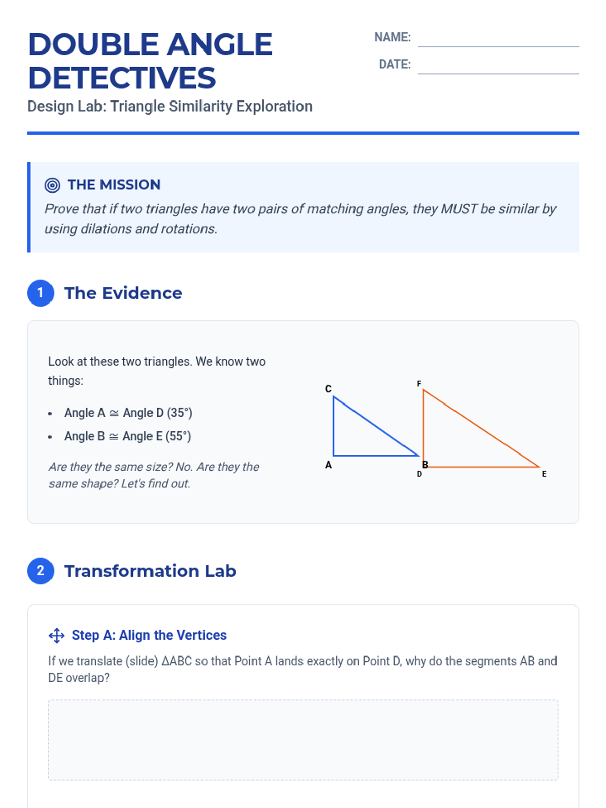 A targeted intervention lesson where students use transformations (dilations and rigid motions) to prove why two angles are sufficient to establish triangle similarity. Designed for Tier 2 small group support with scaffolded explorations.