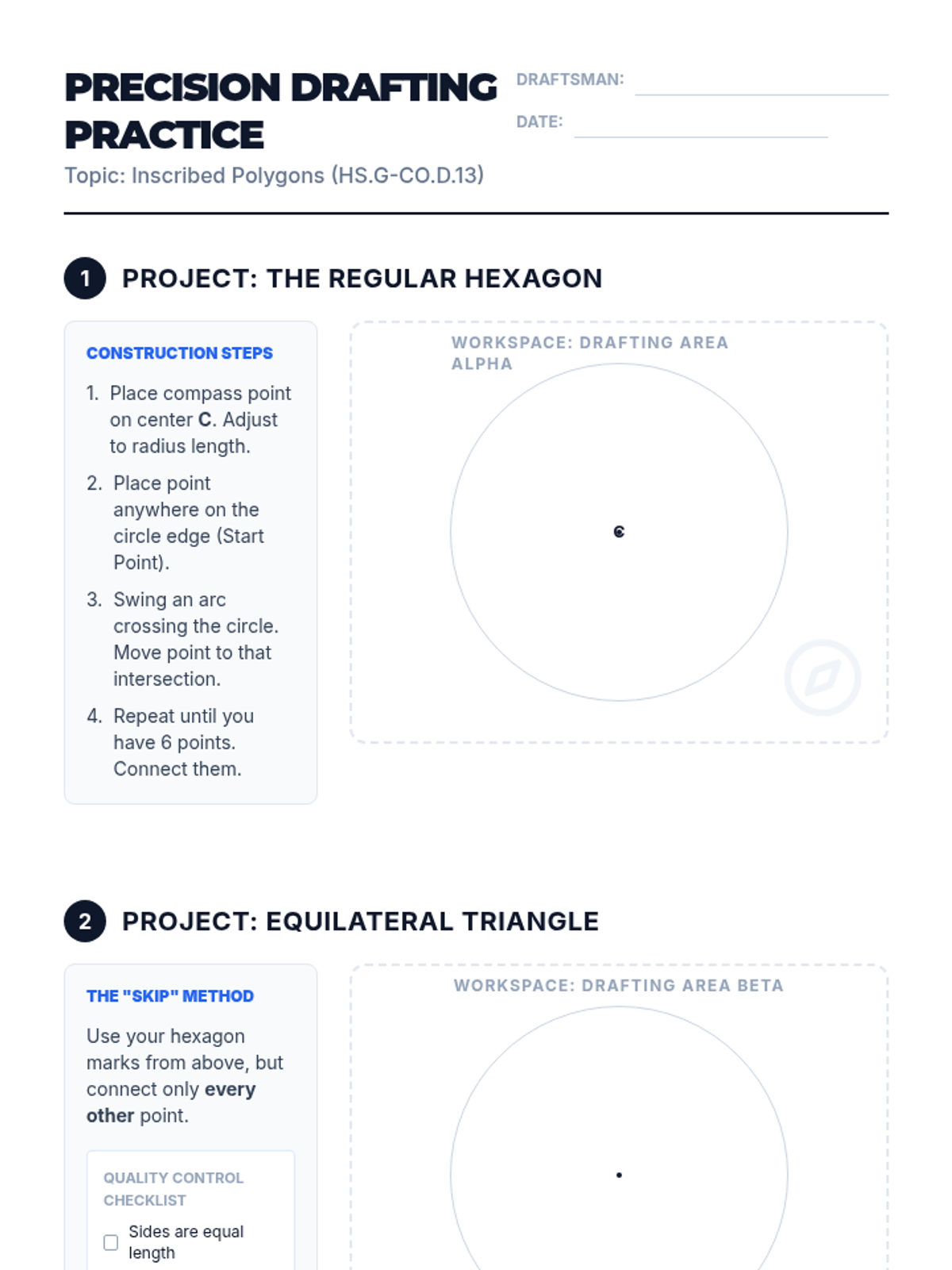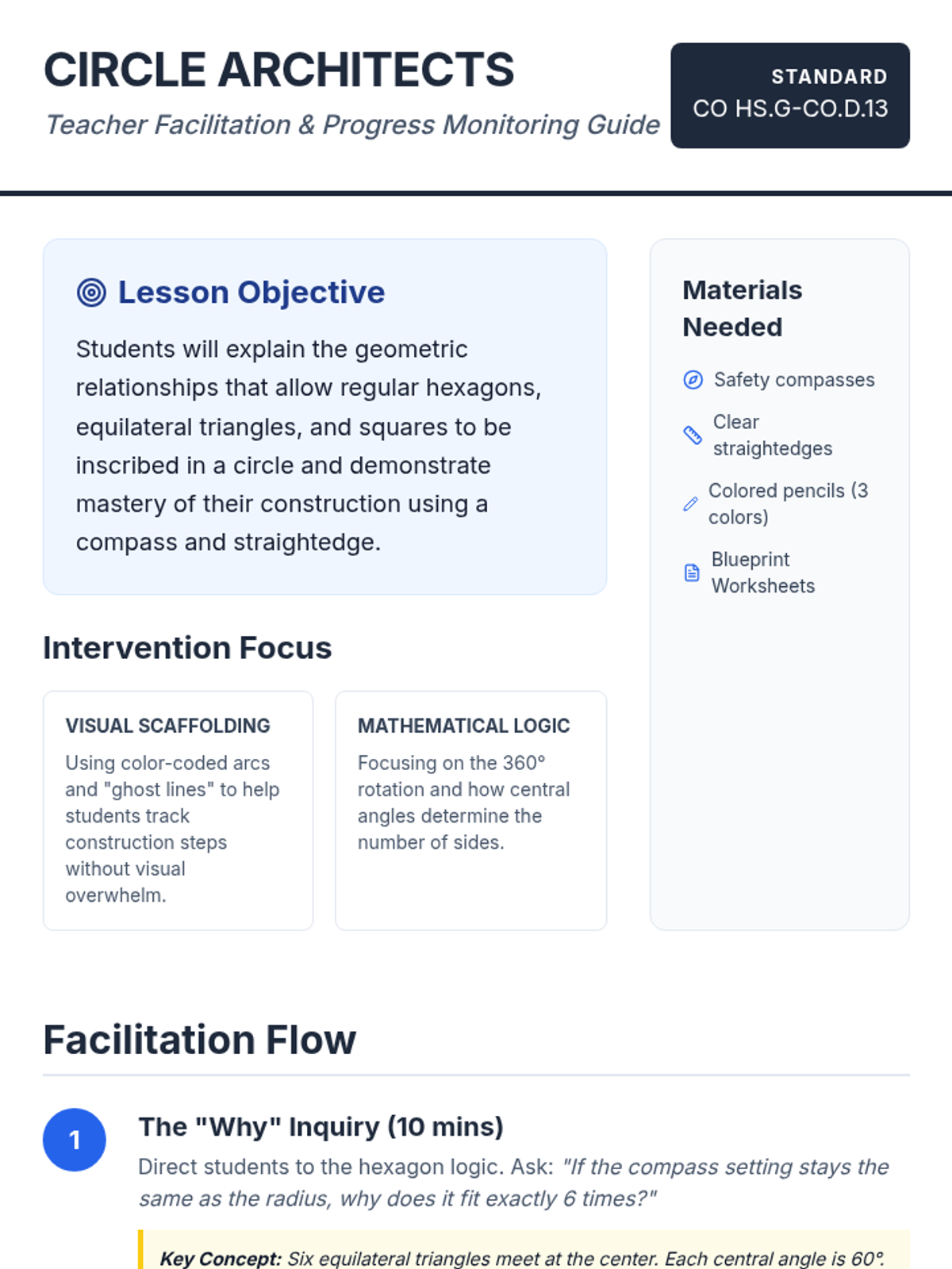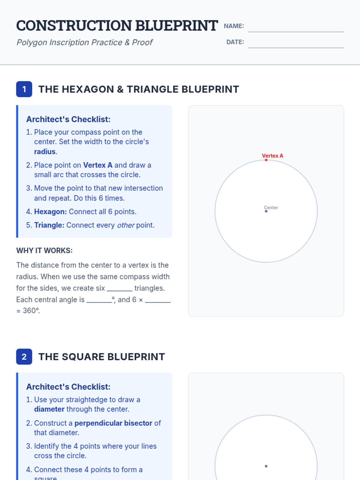 A targeted intervention lesson for high school geometry students focusing on the step-by-step construction of regular polygons inscribed in a circle. This lesson uses scaffolded instruction and a blueprint-themed aesthetic to help students master compass and straightedge techniques.
