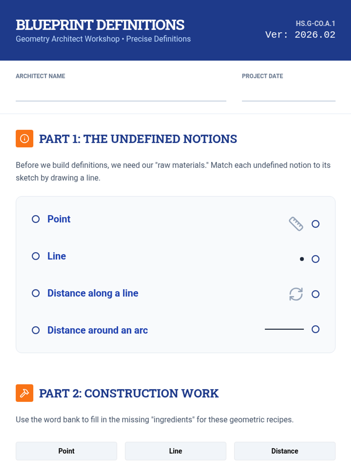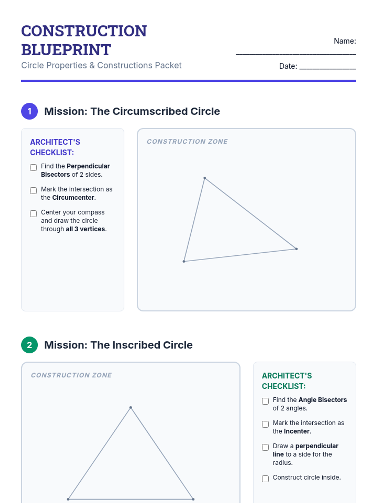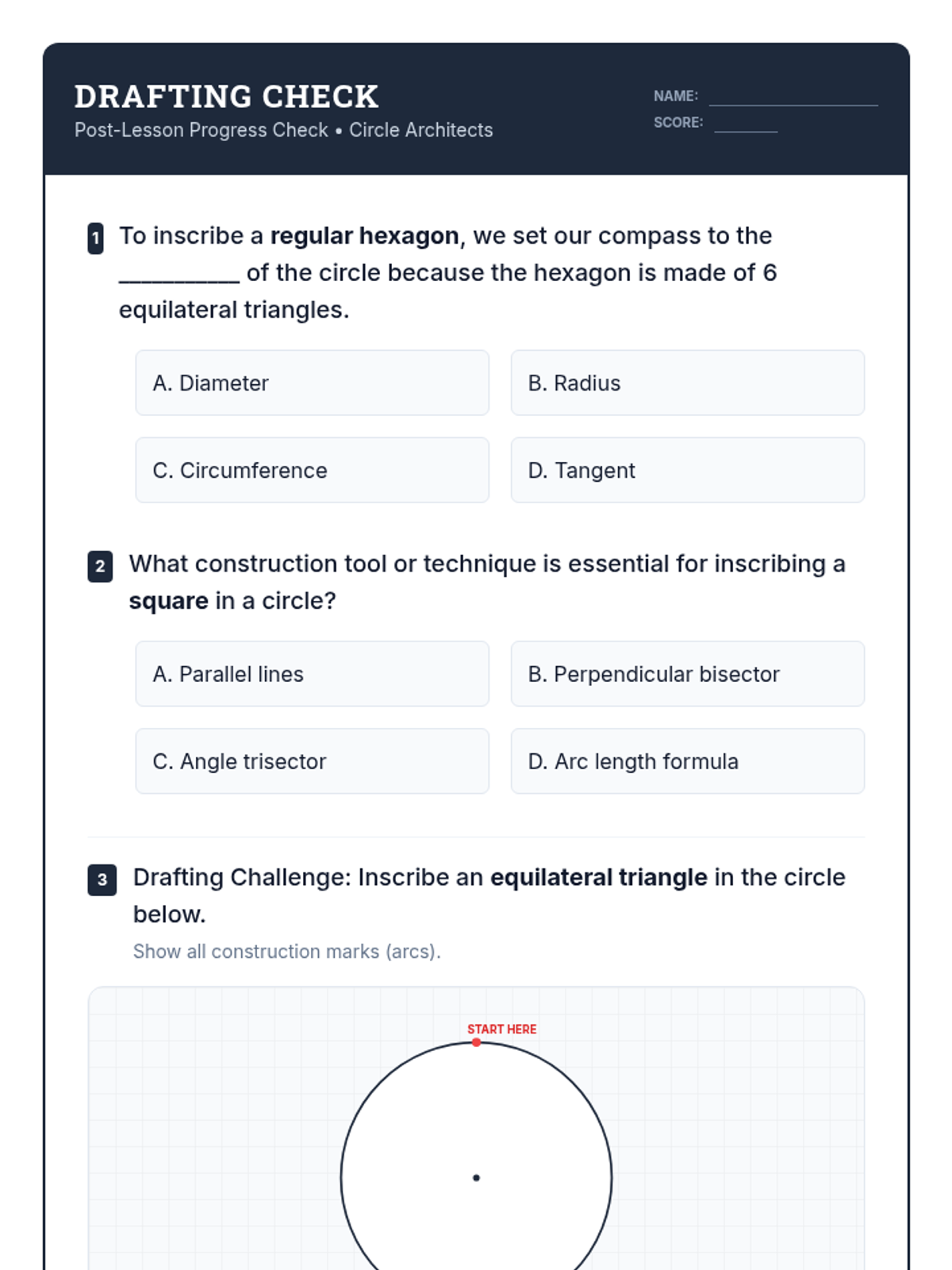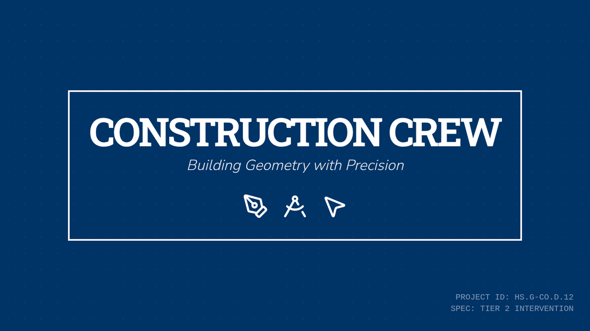 A targeted intervention lesson for high school geometry students focusing on the step-by-step construction of regular polygons inscribed in a circle. This lesson uses scaffolded instruction and a blueprint-themed aesthetic to help students master compass and straightedge techniques.