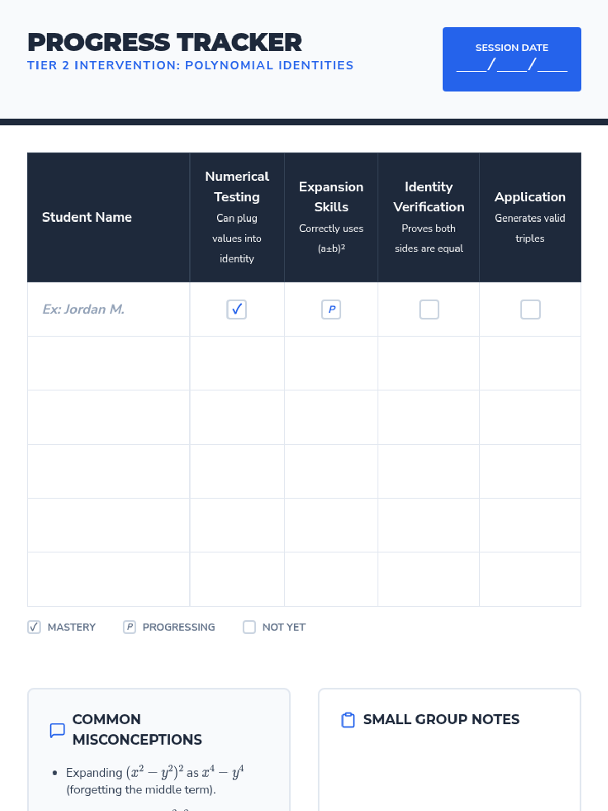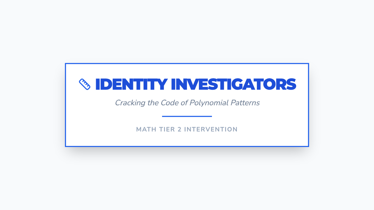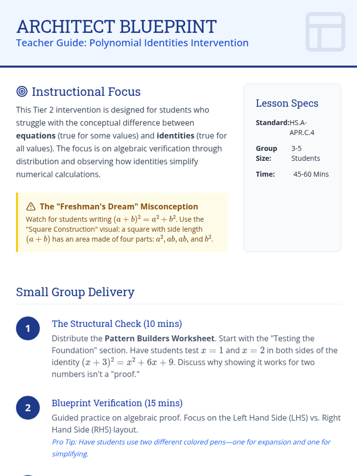 A Tier 2 intervention lesson focused on verifying polynomial identities and applying them to numerical patterns, designed for small group support. Students will use algebraic manipulation to prove identities and see their practical use in mental math and geometry.