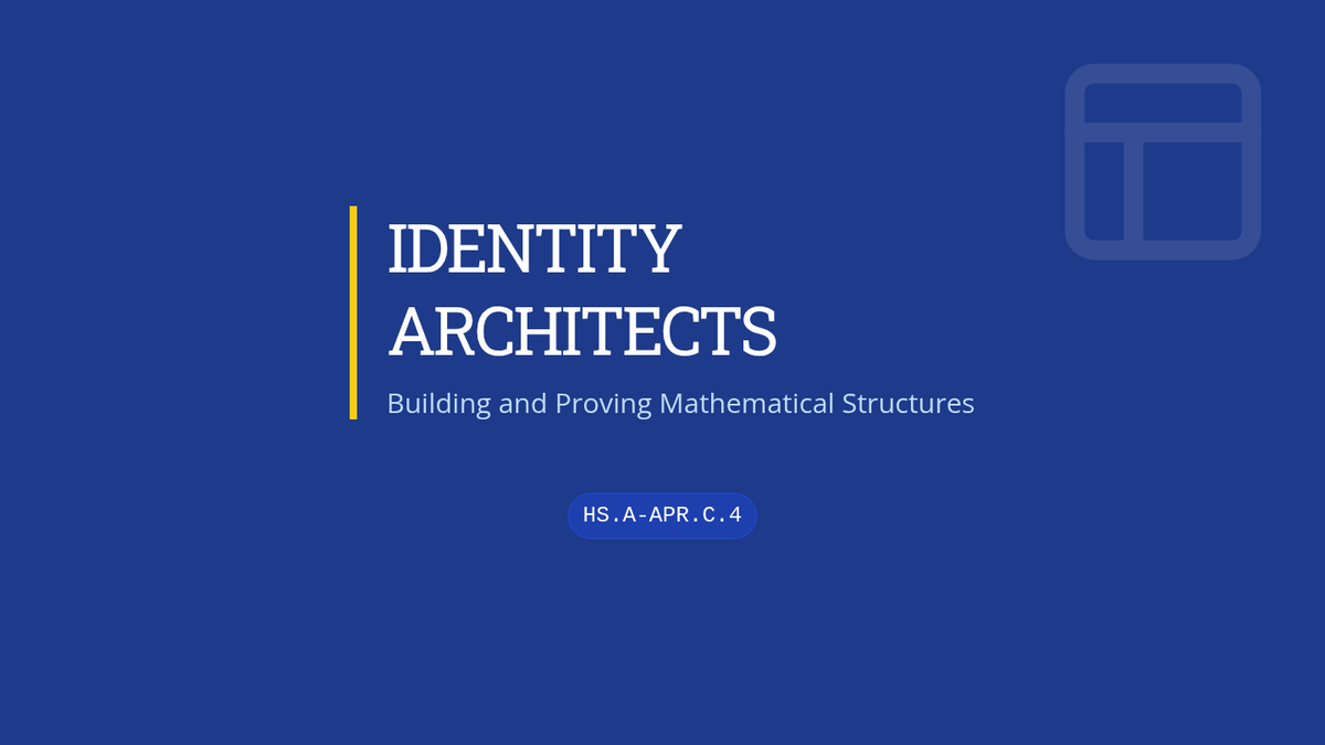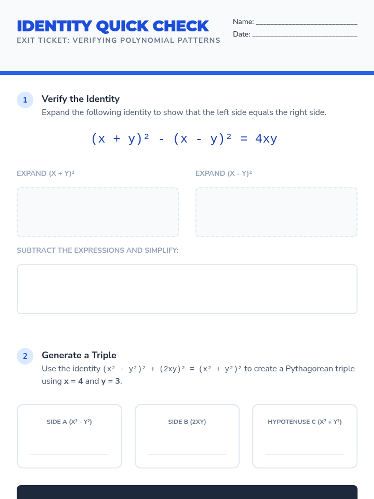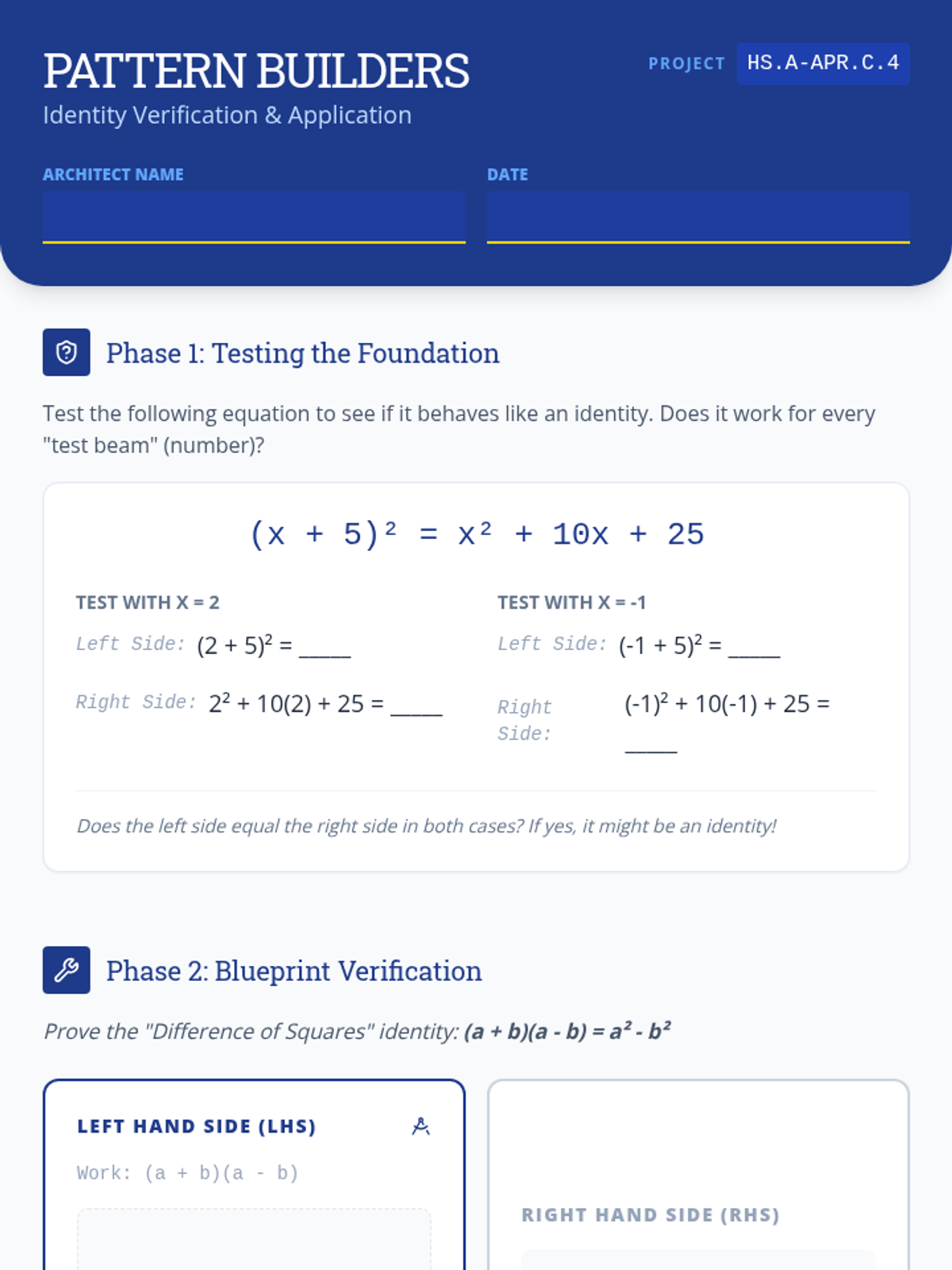 A Tier 2 intervention lesson focused on verifying polynomial identities and applying them to numerical patterns, designed for small group support. Students will use algebraic manipulation to prove identities and see their practical use in mental math and geometry.