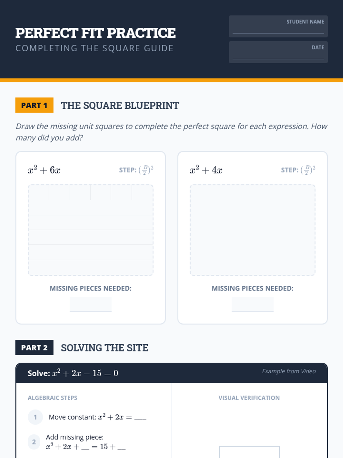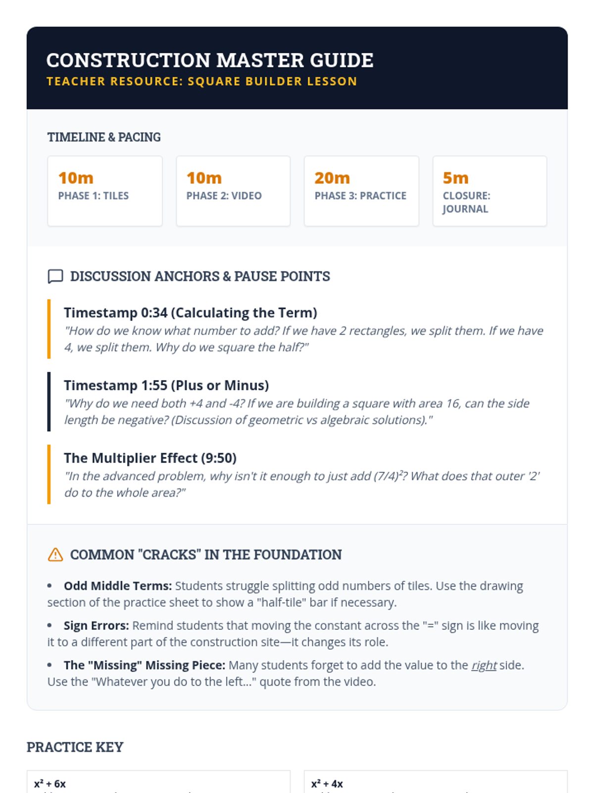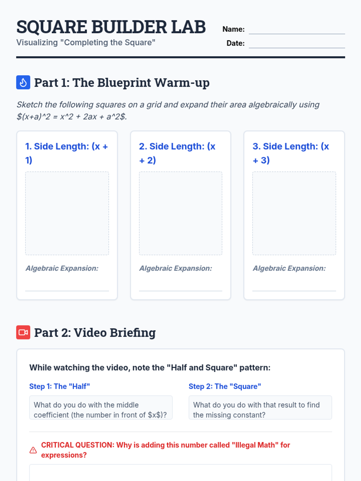 A high school math support lesson that bridges the gap between the physical 'geometry' of algebra tiles and the algebraic 'algorithm' of completing the square. Students build physical squares to visualize the missing term before solving equations algebraically using a video guide.