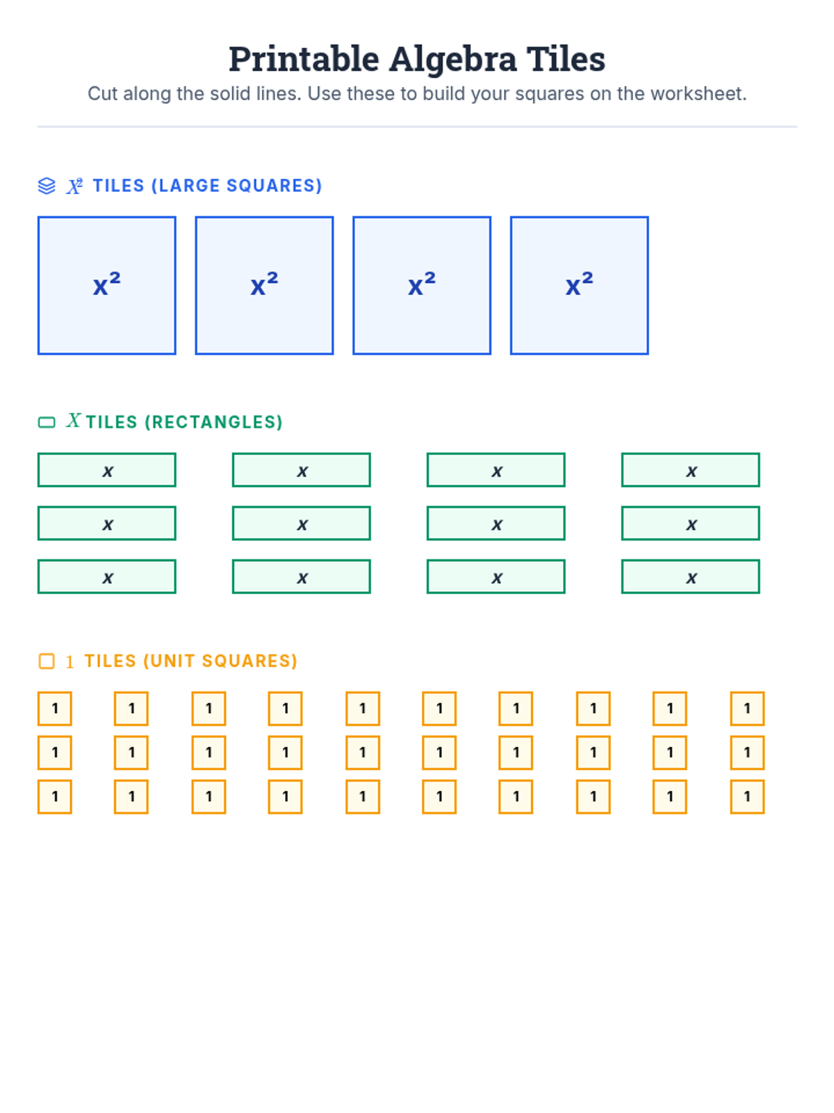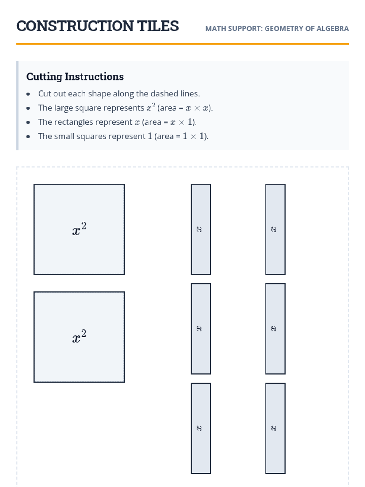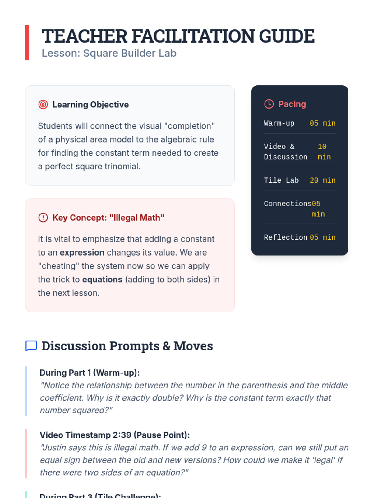 A high school math support lesson that bridges the gap between the physical 'geometry' of algebra tiles and the algebraic 'algorithm' of completing the square. Students build physical squares to visualize the missing term before solving equations algebraically using a video guide.