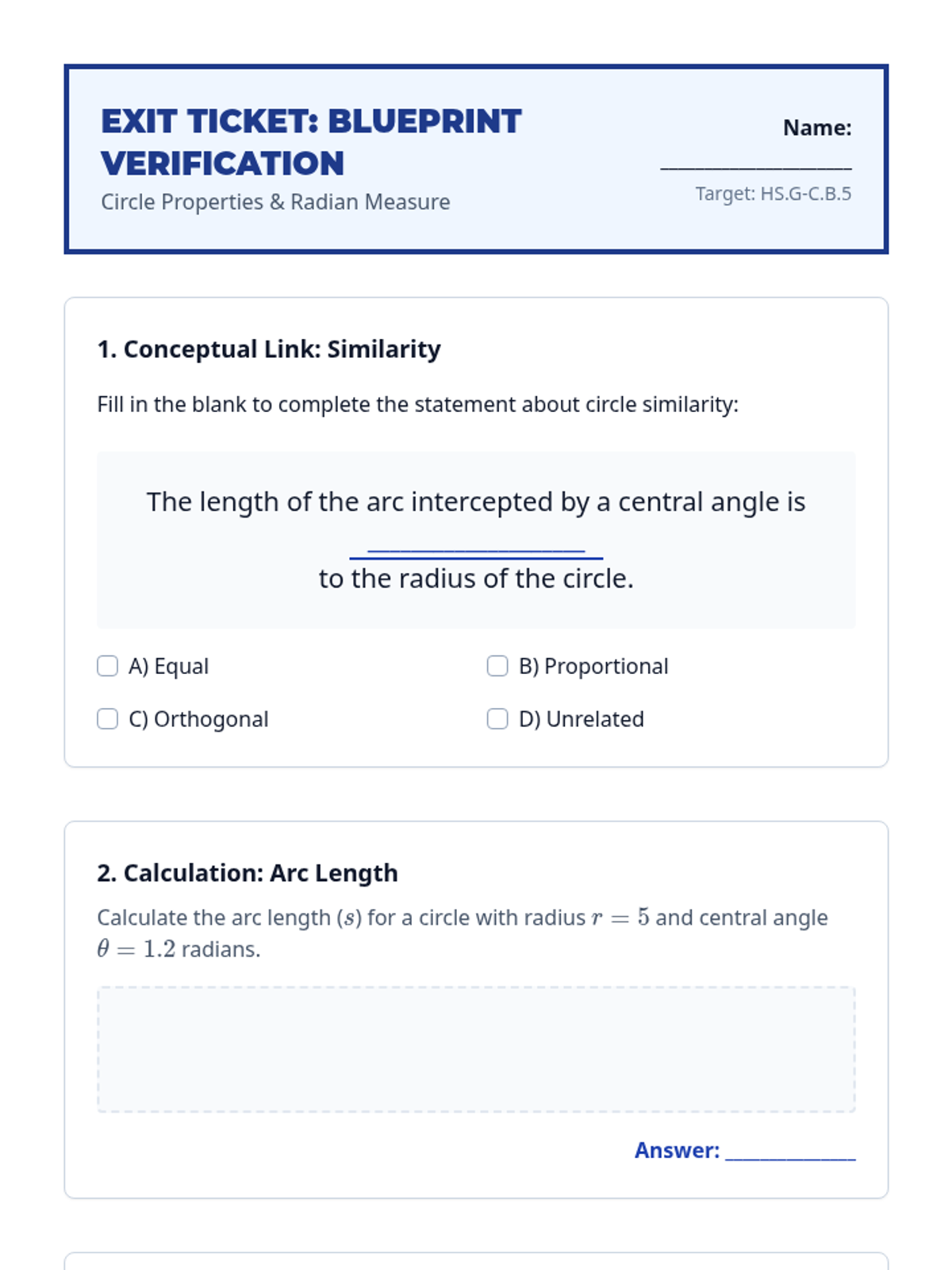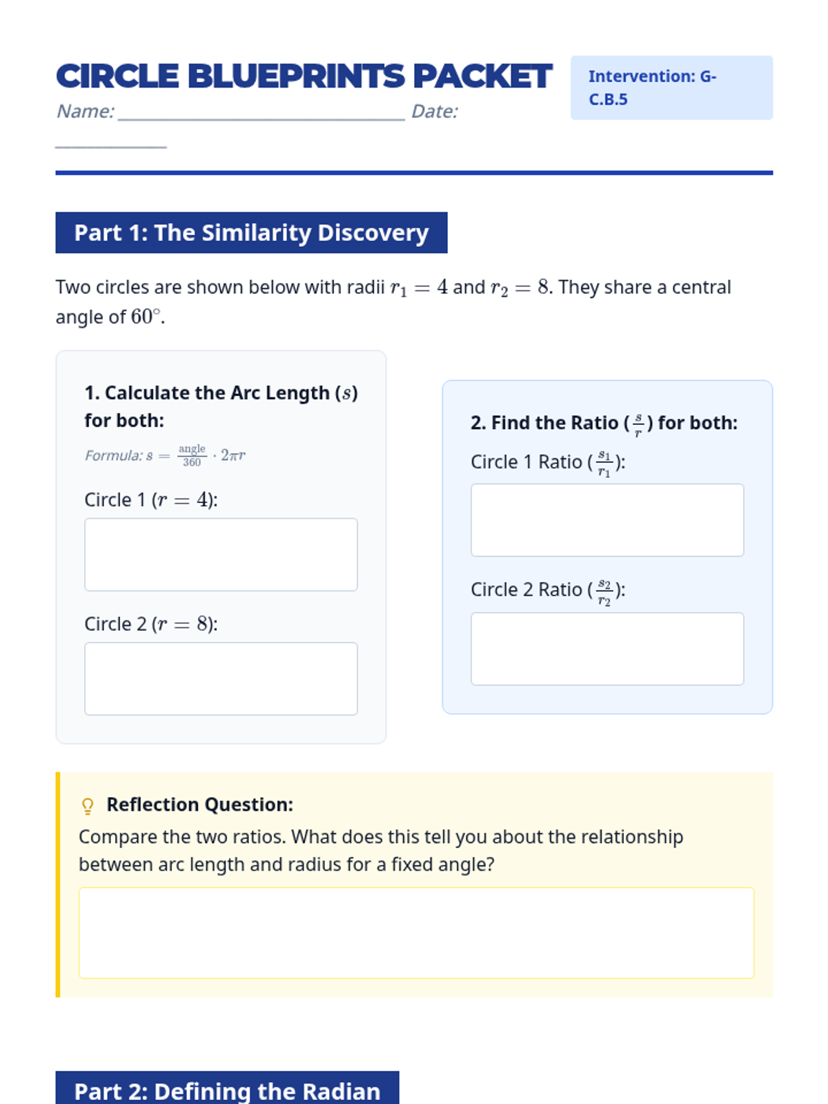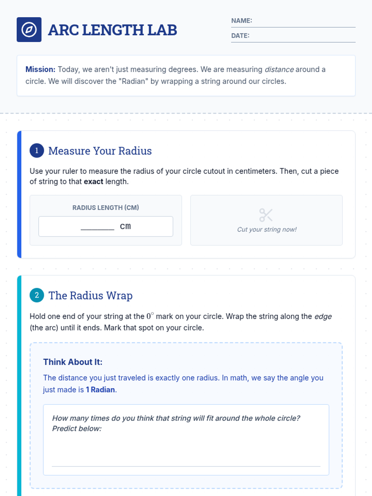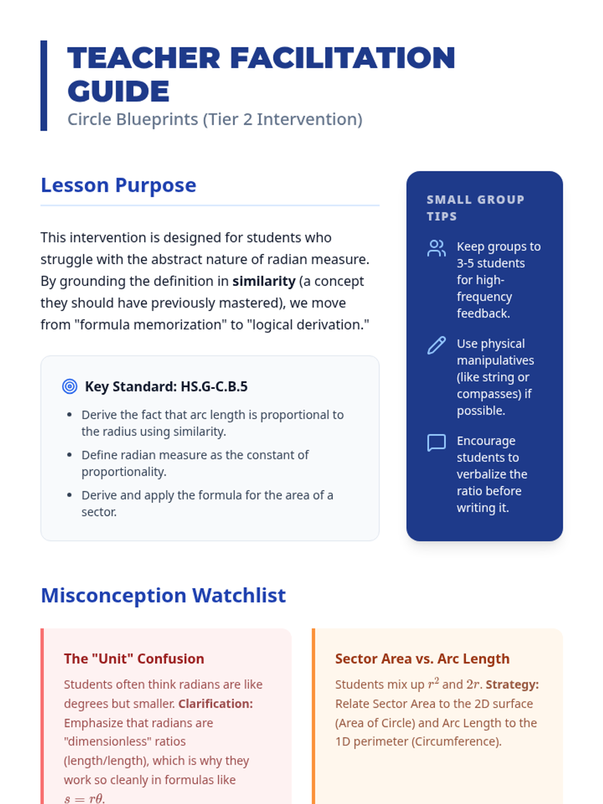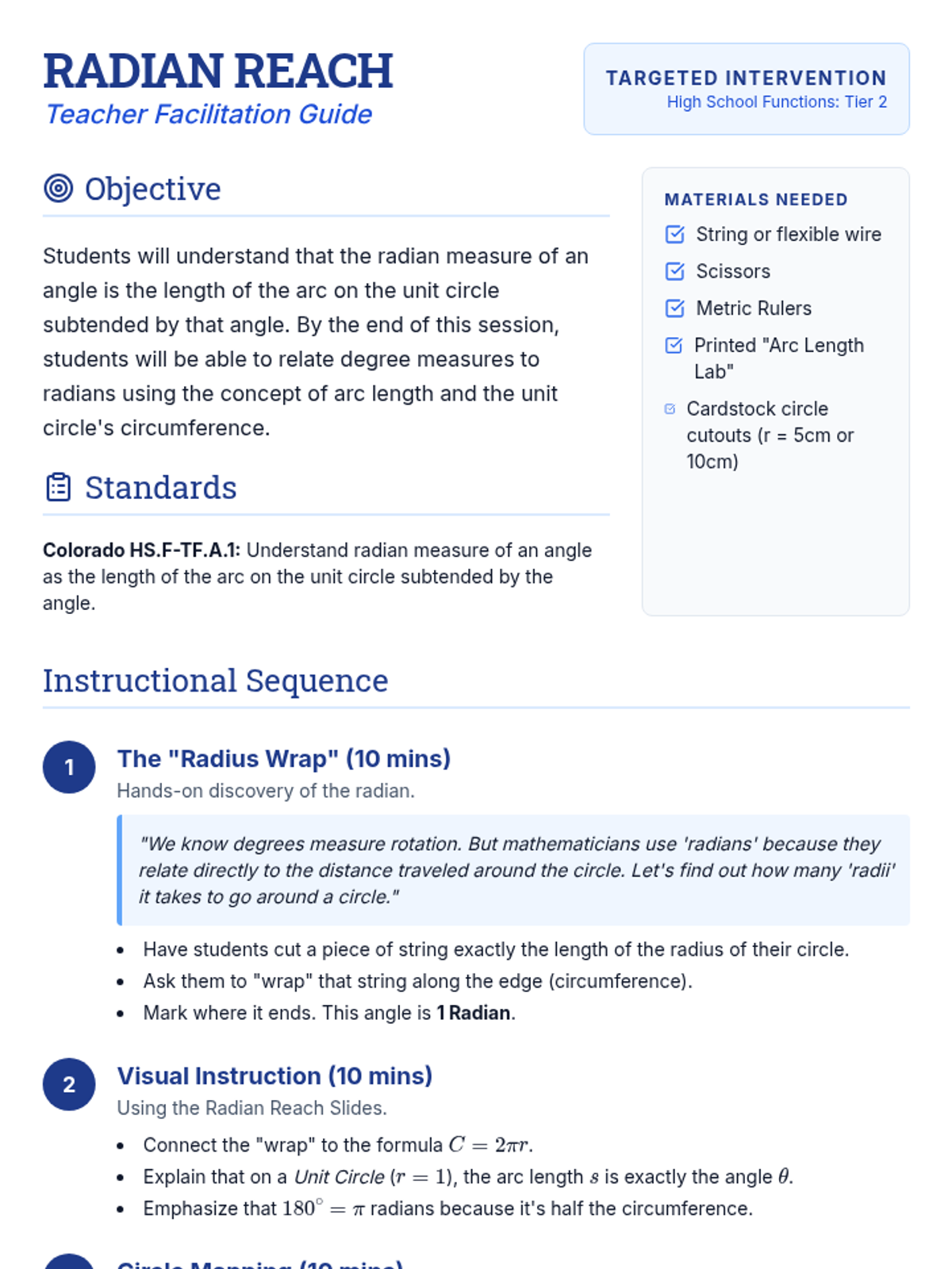 A Tier 2 small group intervention focused on the conceptual understanding of radian measure as arc length on the unit circle, utilizing hands-on discovery and visual mapping.