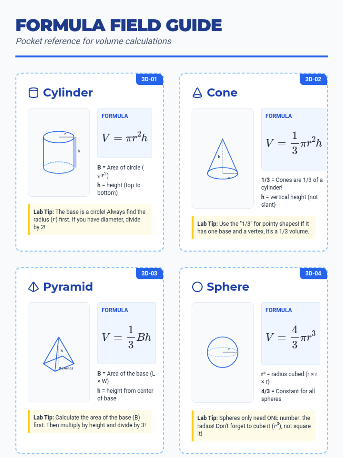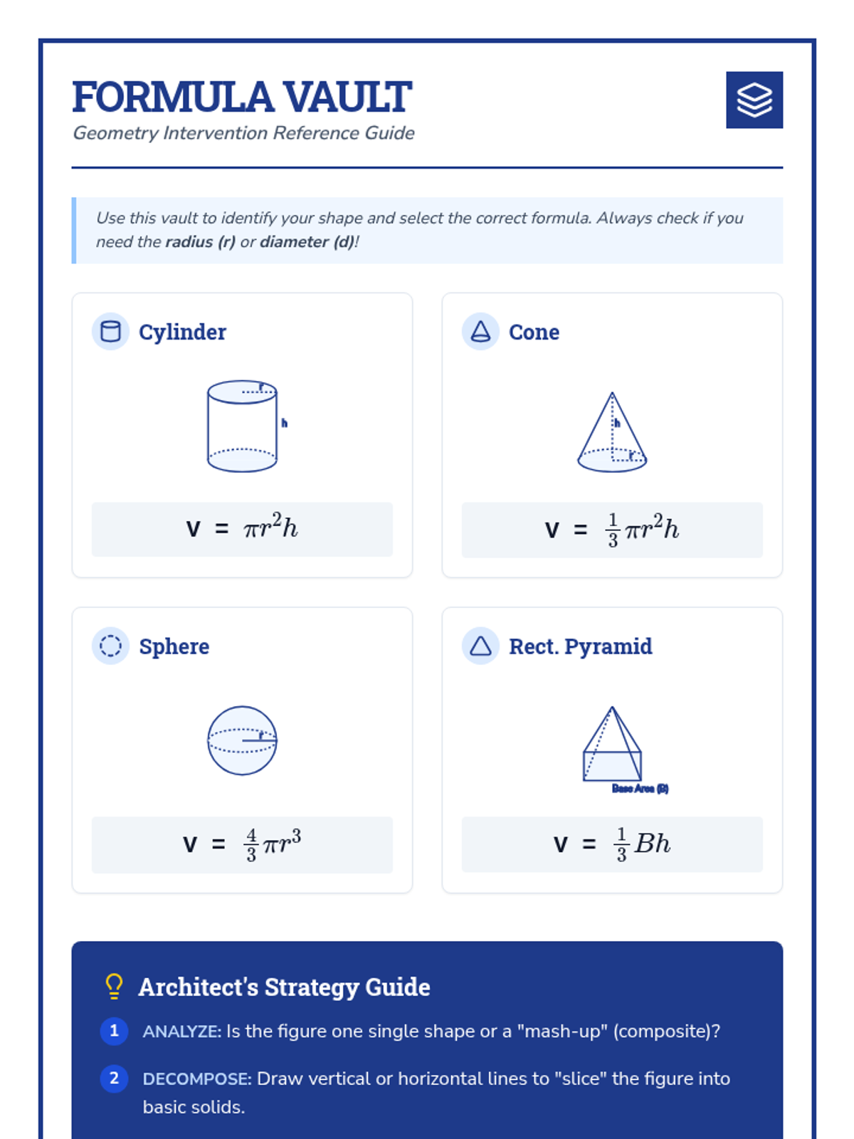 A Tier 2 intervention lesson focusing on the conceptual understanding and application of volume formulas for 3D figures. Designed for small group support with scaffolded practice and clear visual aids.