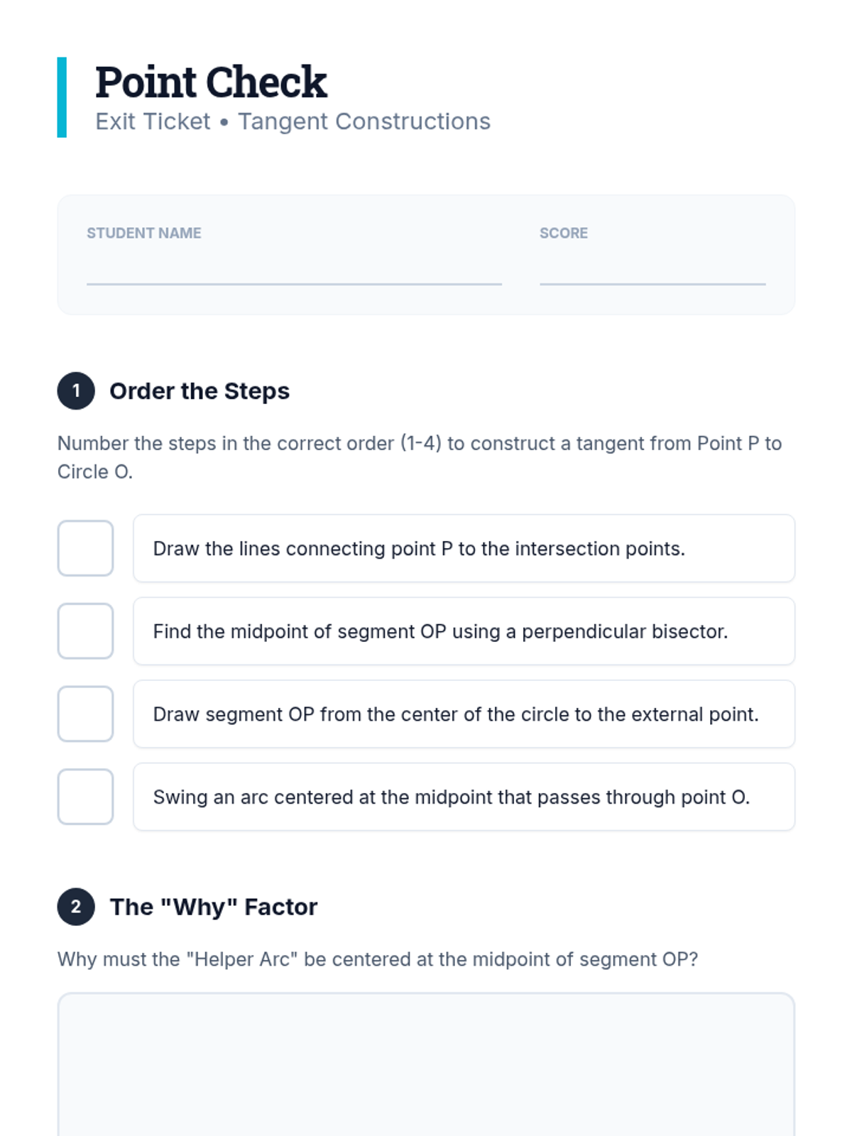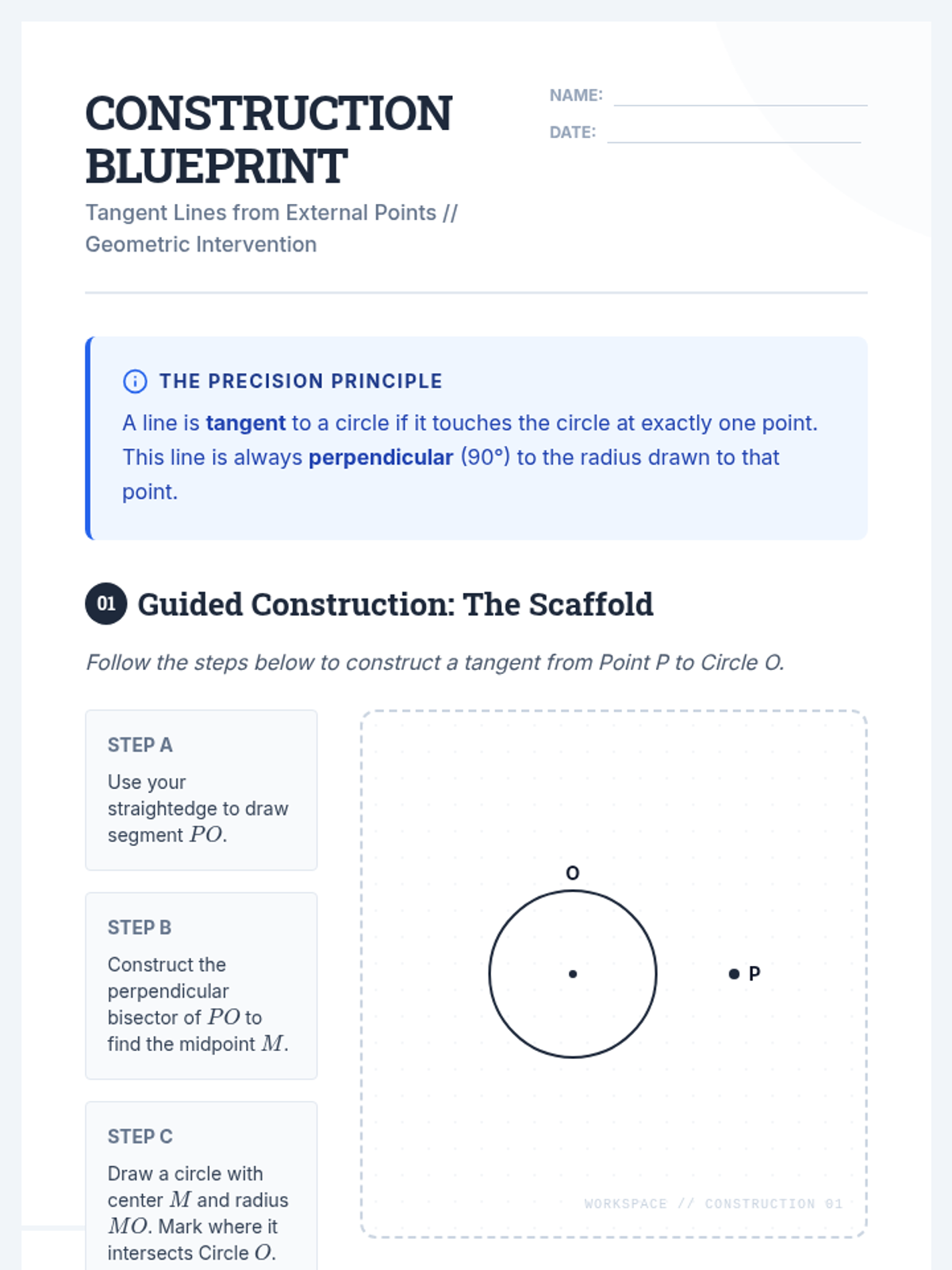 A targeted intervention lesson for high school students to master the construction of a tangent line from an external point to a circle. This lesson breaks down the complex construction into manageable, scaffolded steps with built-in progress monitoring.