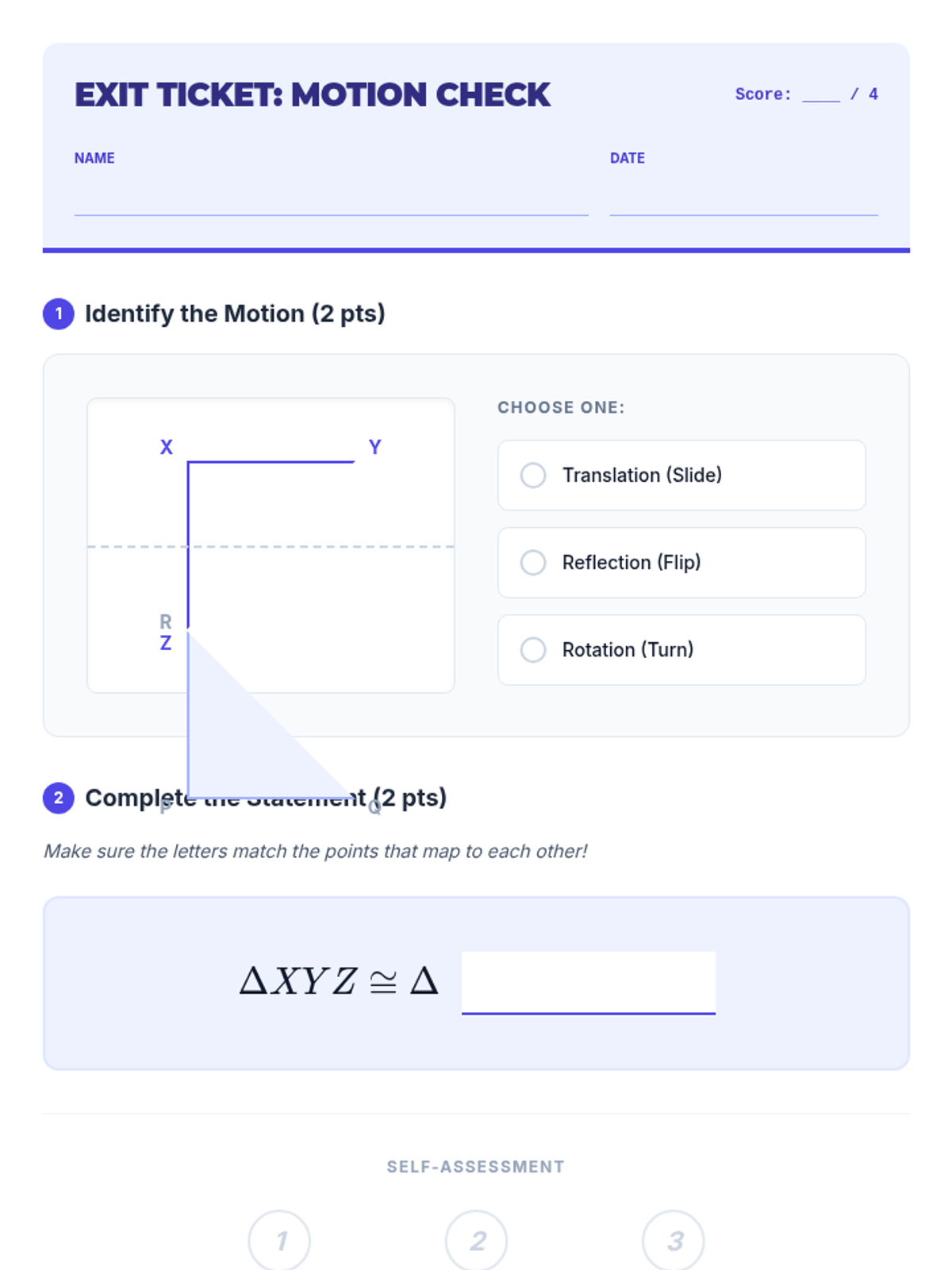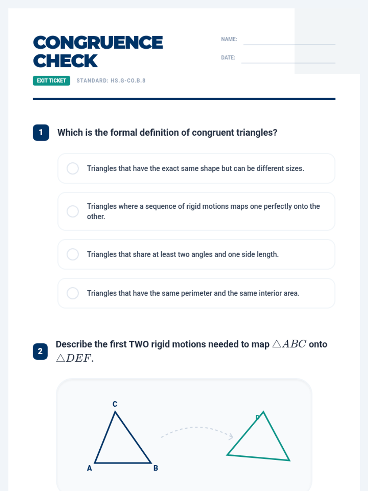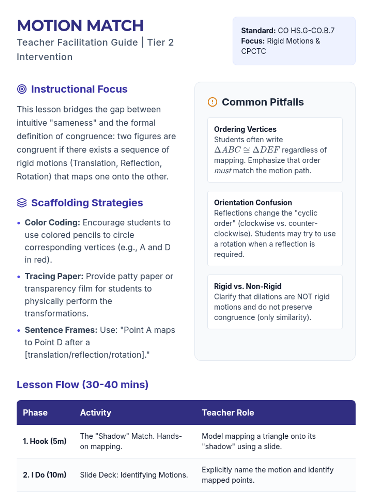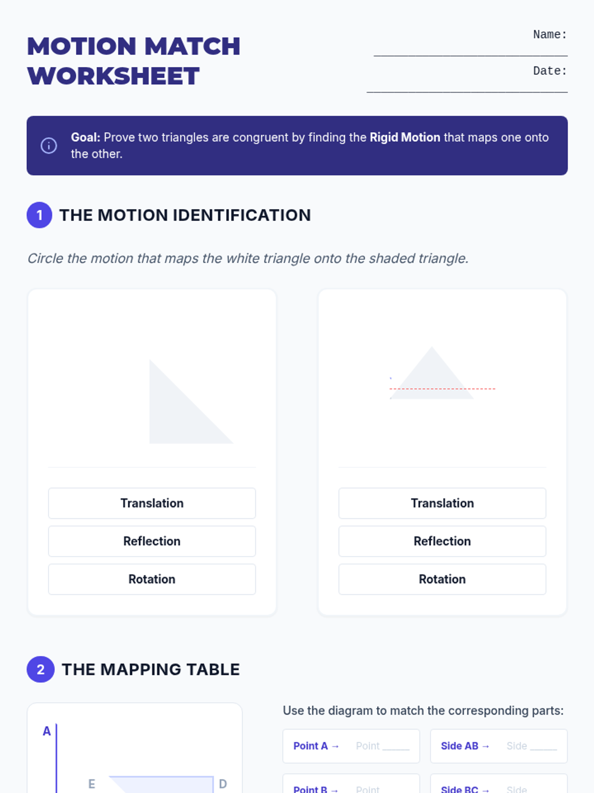 A targeted intervention lesson for high school students focused on understanding triangle congruence through rigid motions (translations, reflections, and rotations). Students will learn to map corresponding parts and justify congruence using transformation definitions.