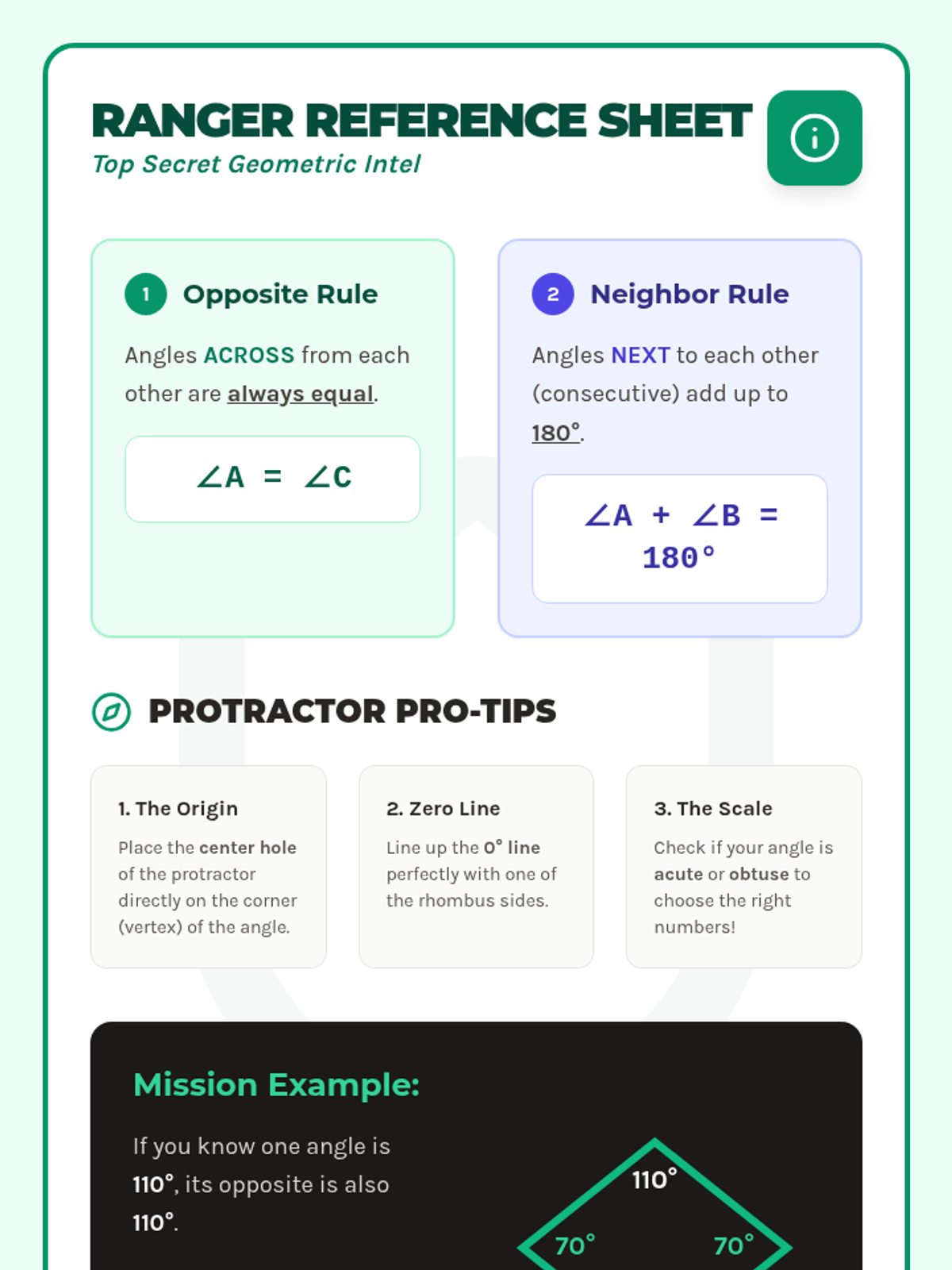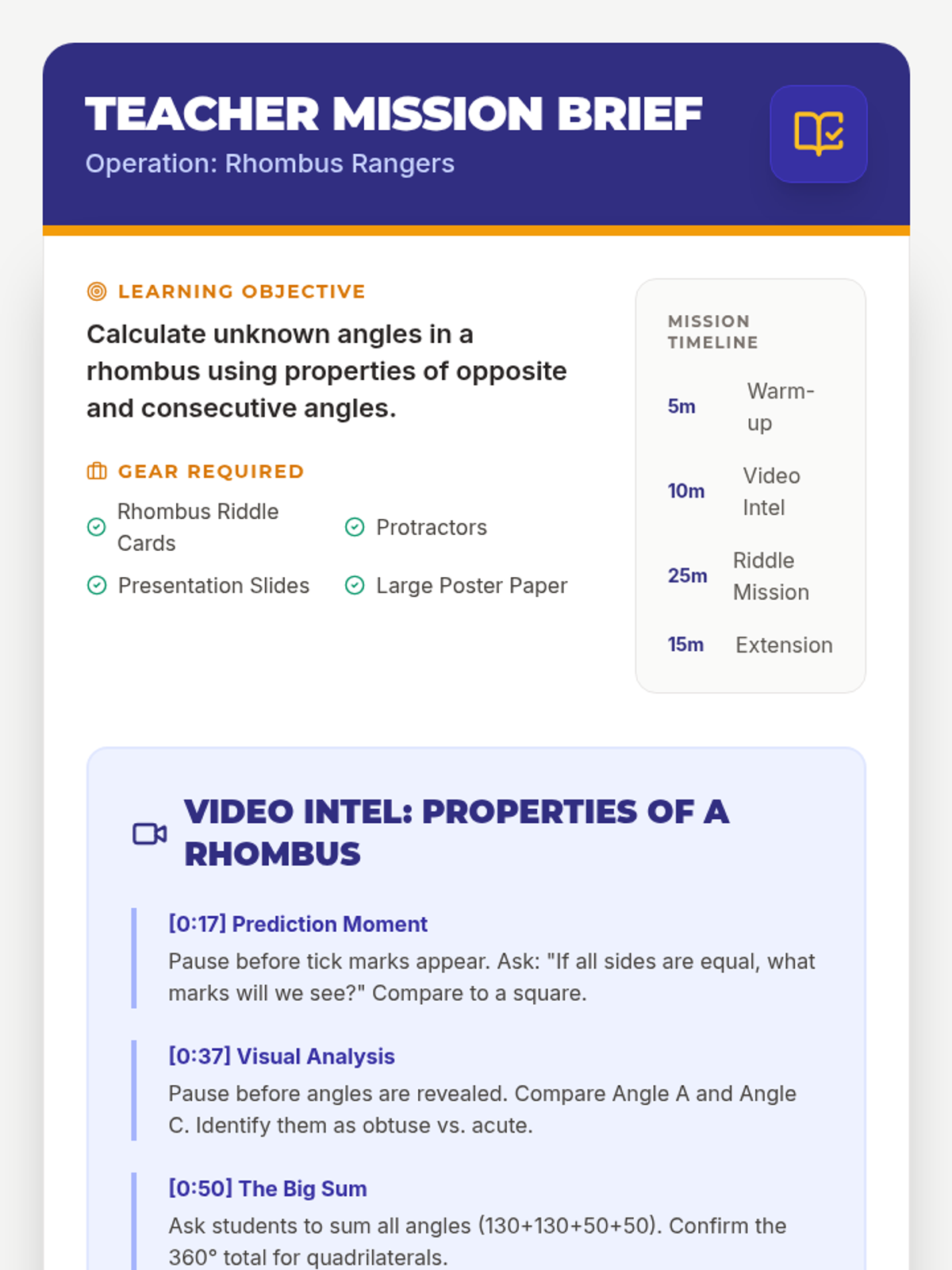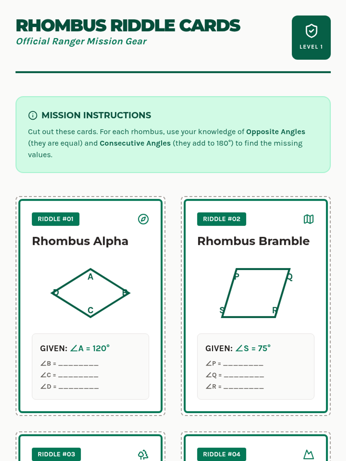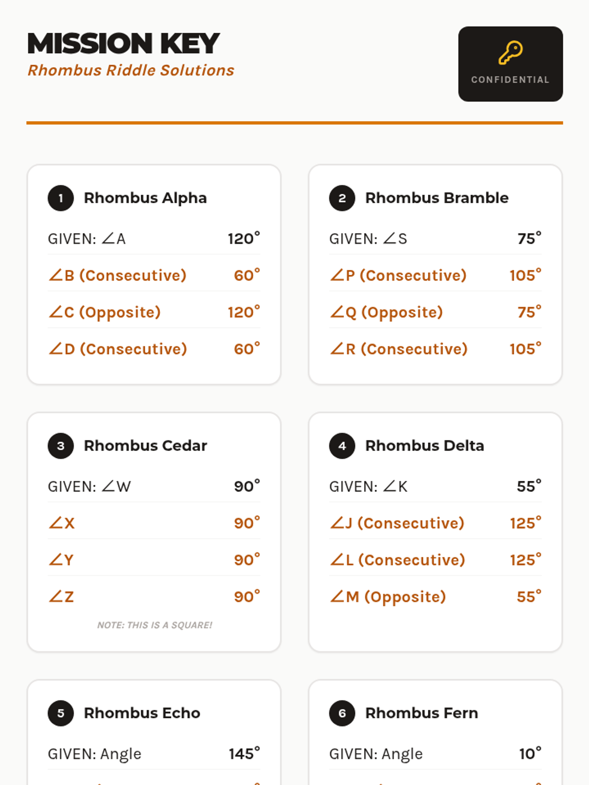 Students will explore the properties of rhombuses, focusing on opposite and consecutive angles, and use these properties to solve geometric riddles.