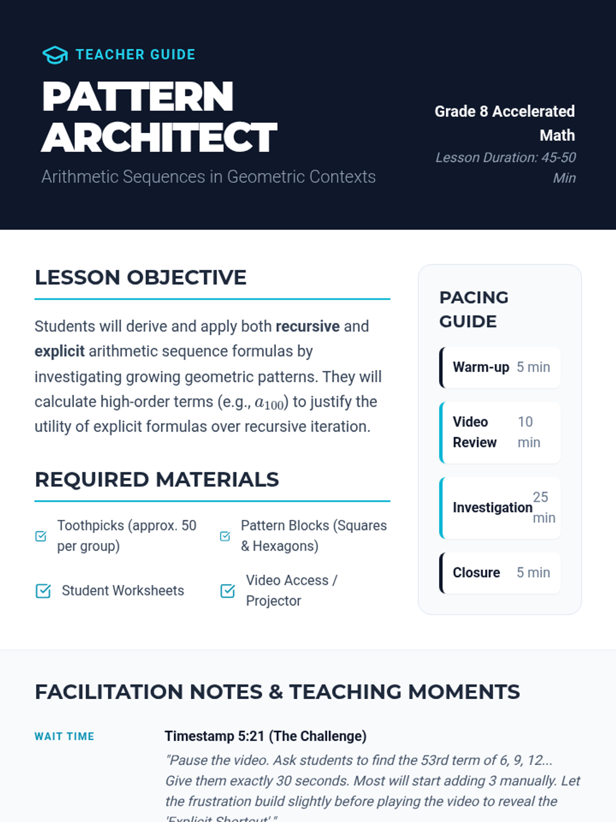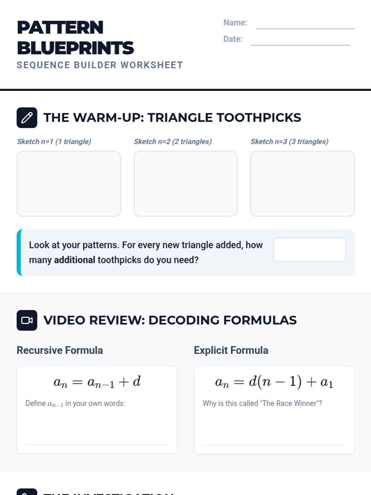 A lesson where students connect arithmetic sequences to visual geometric patterns using toothpicks and pattern blocks, transitioning from recursive to explicit formulas.