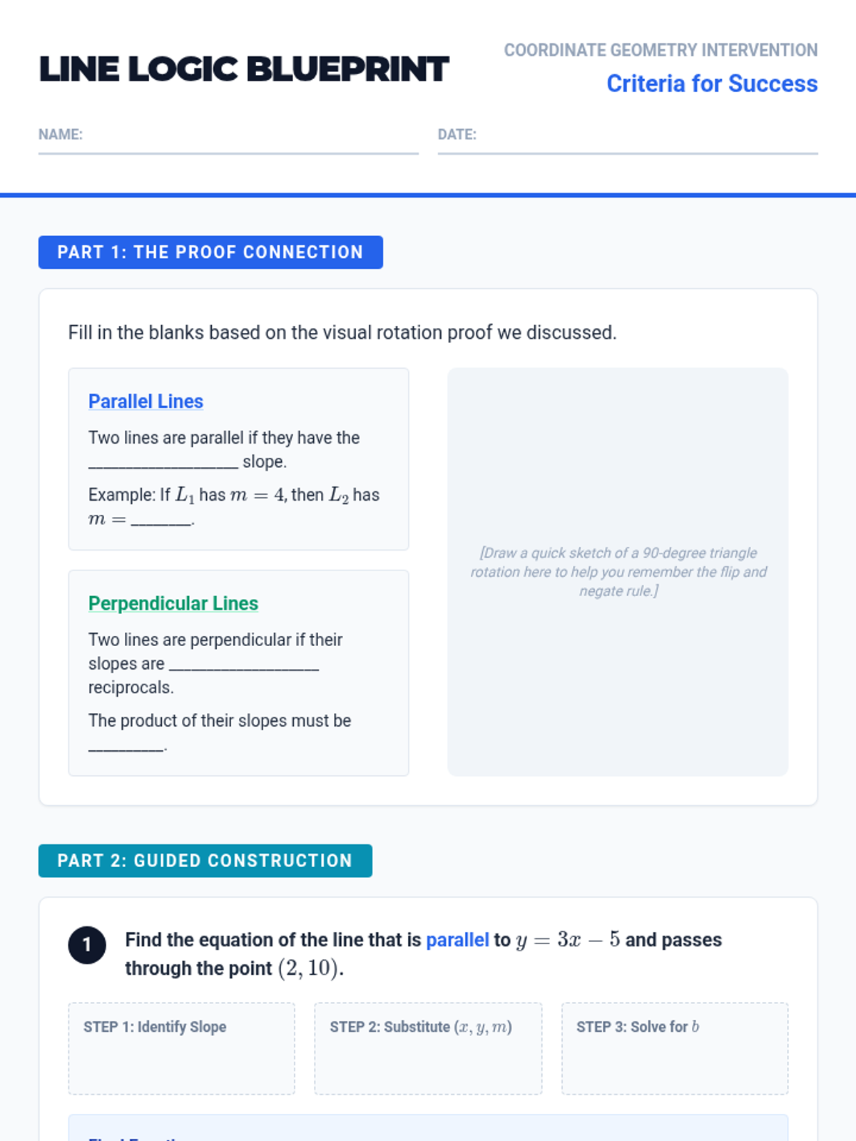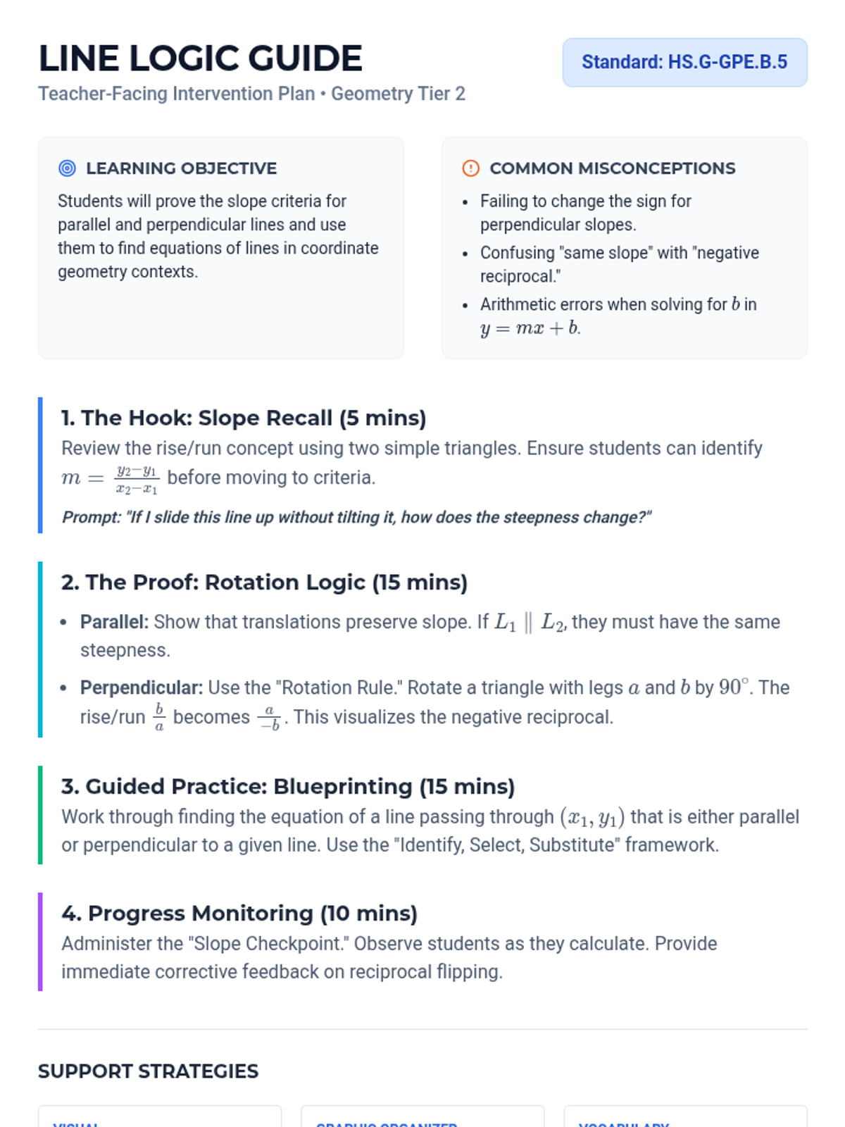 A targeted Tier 2 intervention lesson focusing on the slope criteria for parallel and perpendicular lines. Includes a visual proof of the 90-degree rotation for perpendicularity and scaffolded coordinate geometry problems.