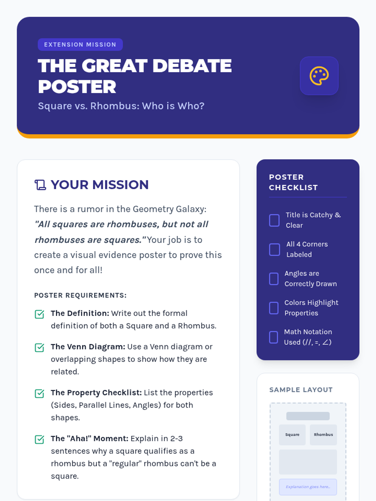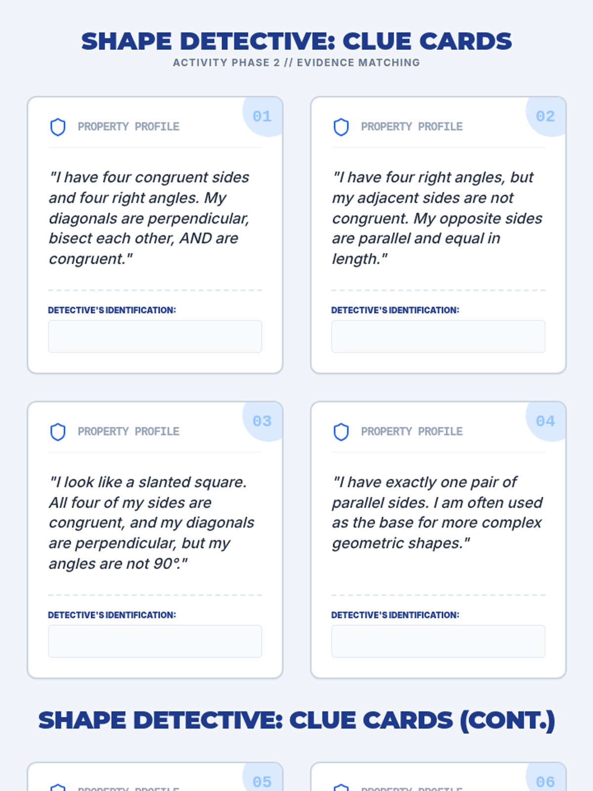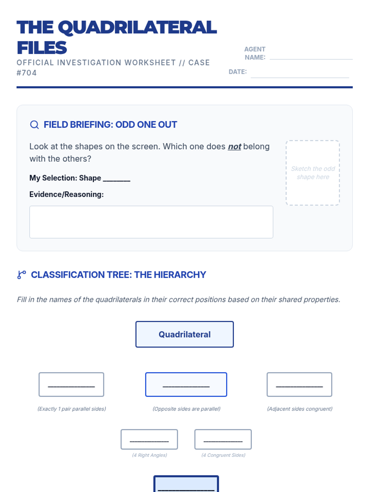A comprehensive lesson where students classify quadrilaterals by investigating their properties through a video-guided family tree and a 'Shape Detective' property-matching activity.