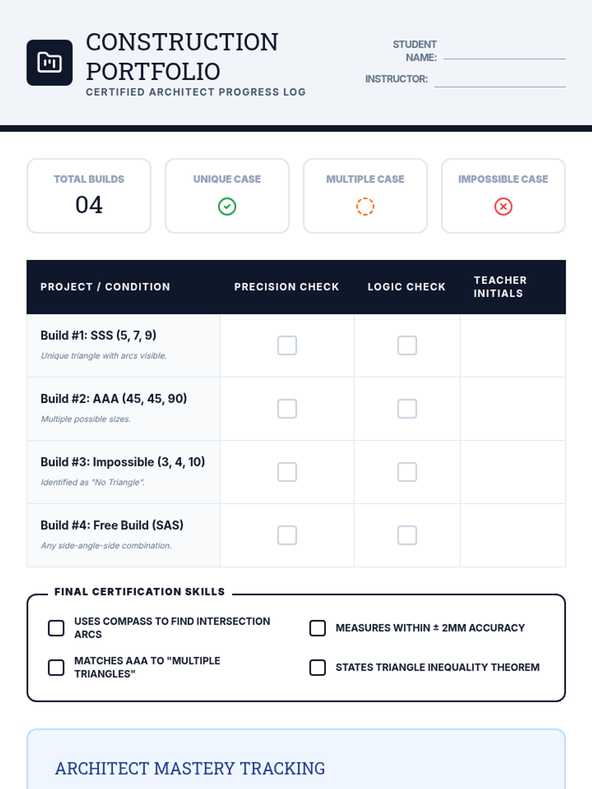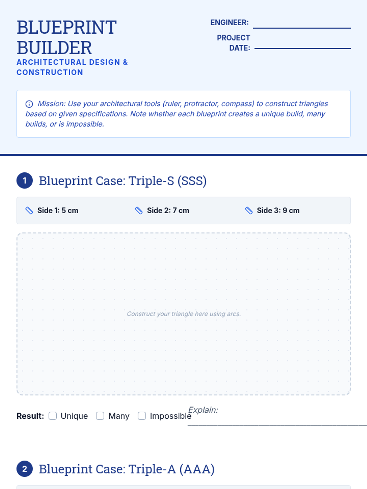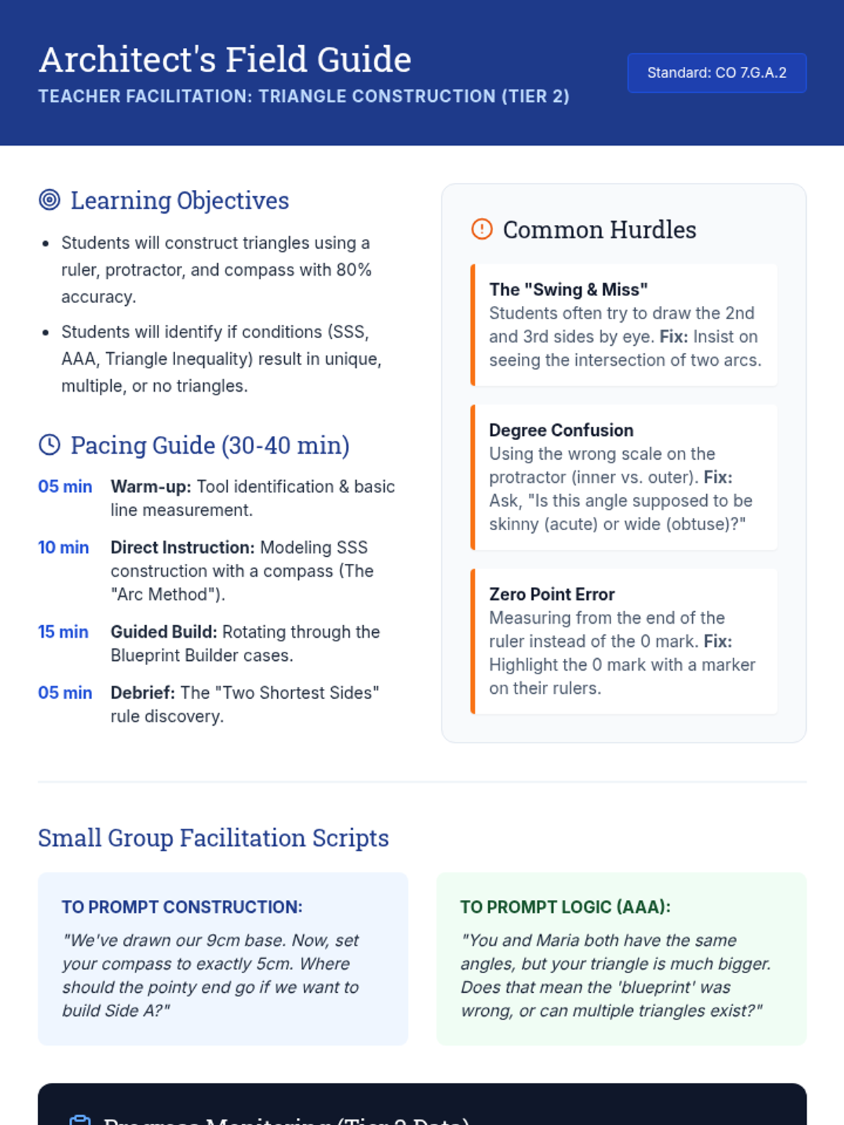 A Tier 2 intervention lesson focused on the construction of triangles using rulers and protractors. Students explore how different side and angle conditions lead to unique, multiple, or no triangles through scaffolded, hands-on architectural tasks.