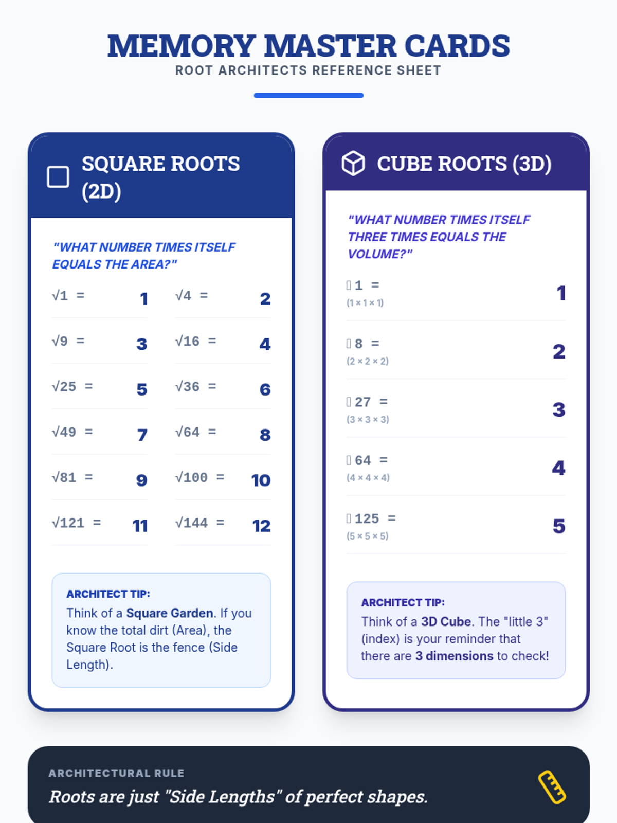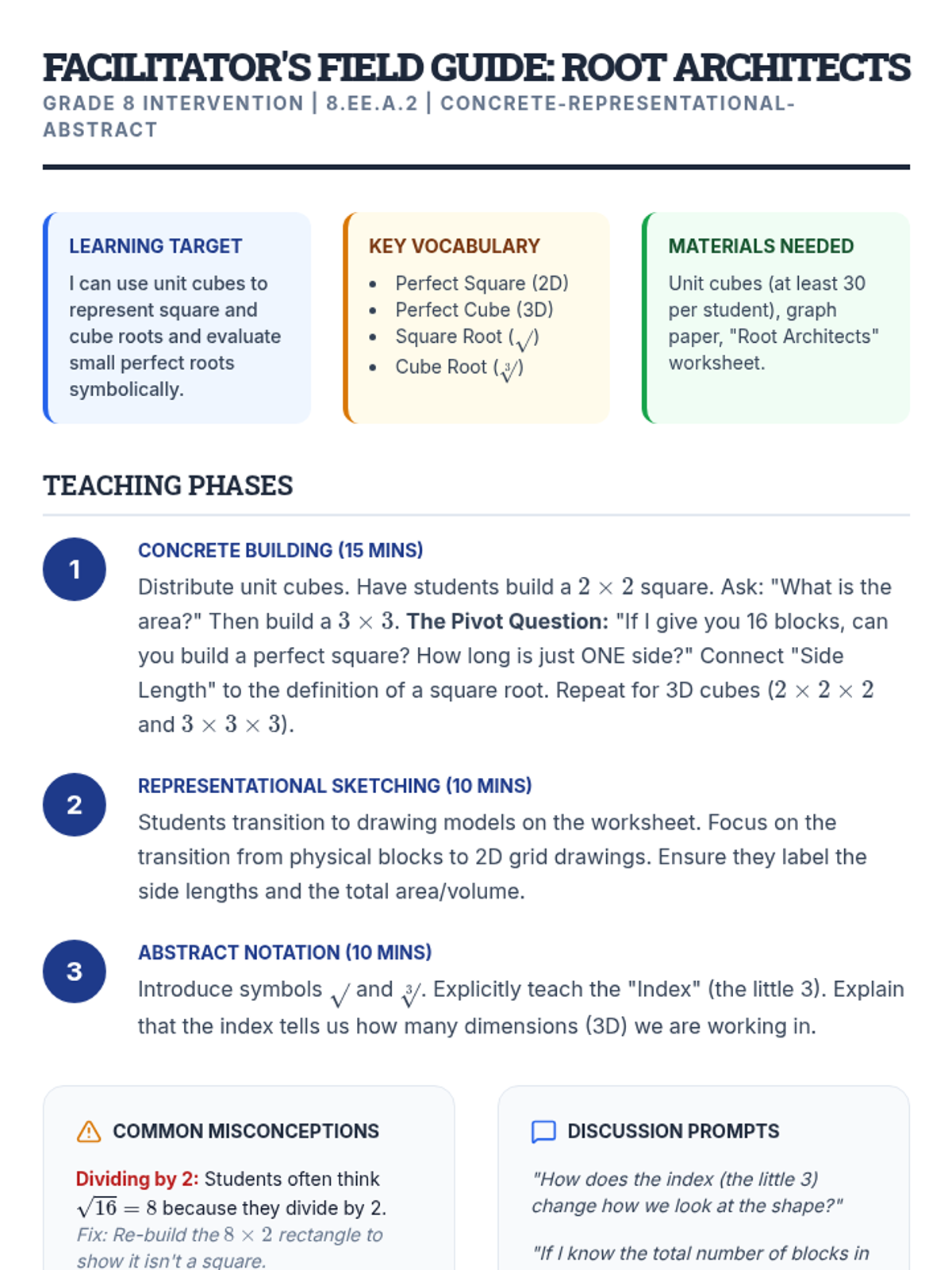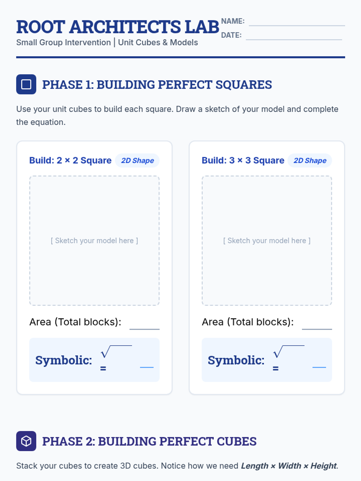 A Tier 2 intervention lesson focusing on the conceptual understanding of square and cube roots using unit cubes. Students transition from building physical models to using symbolic notation and memorizing common perfect roots.