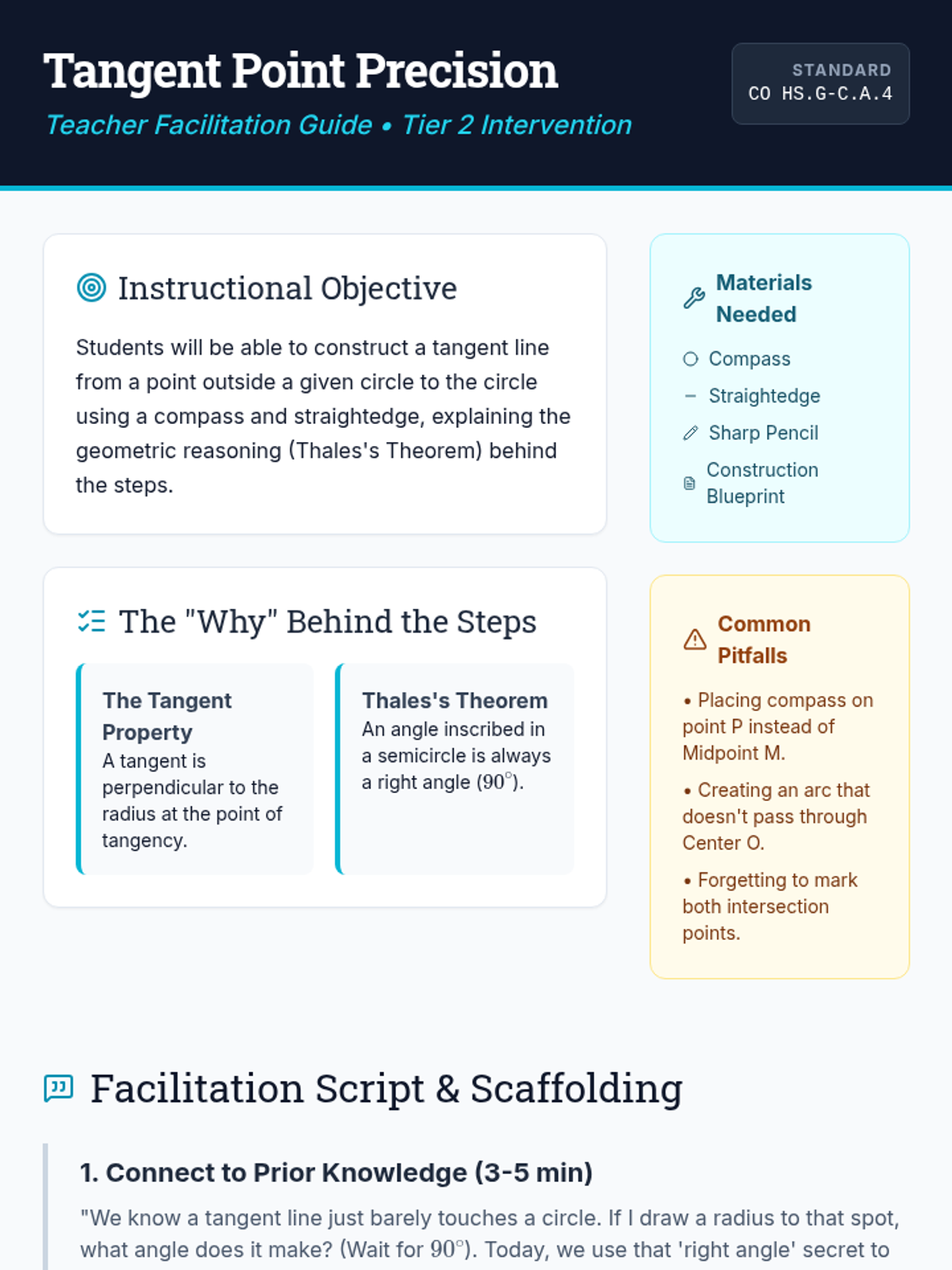 A Tier 2 intervention lesson focusing on the geometric construction of tangent lines from an external point, emphasizing the relationship between radii and right angles. This small-group session uses scaffolded compass and straightedge work to help struggling learners master construction techniques and conceptual proofs.
