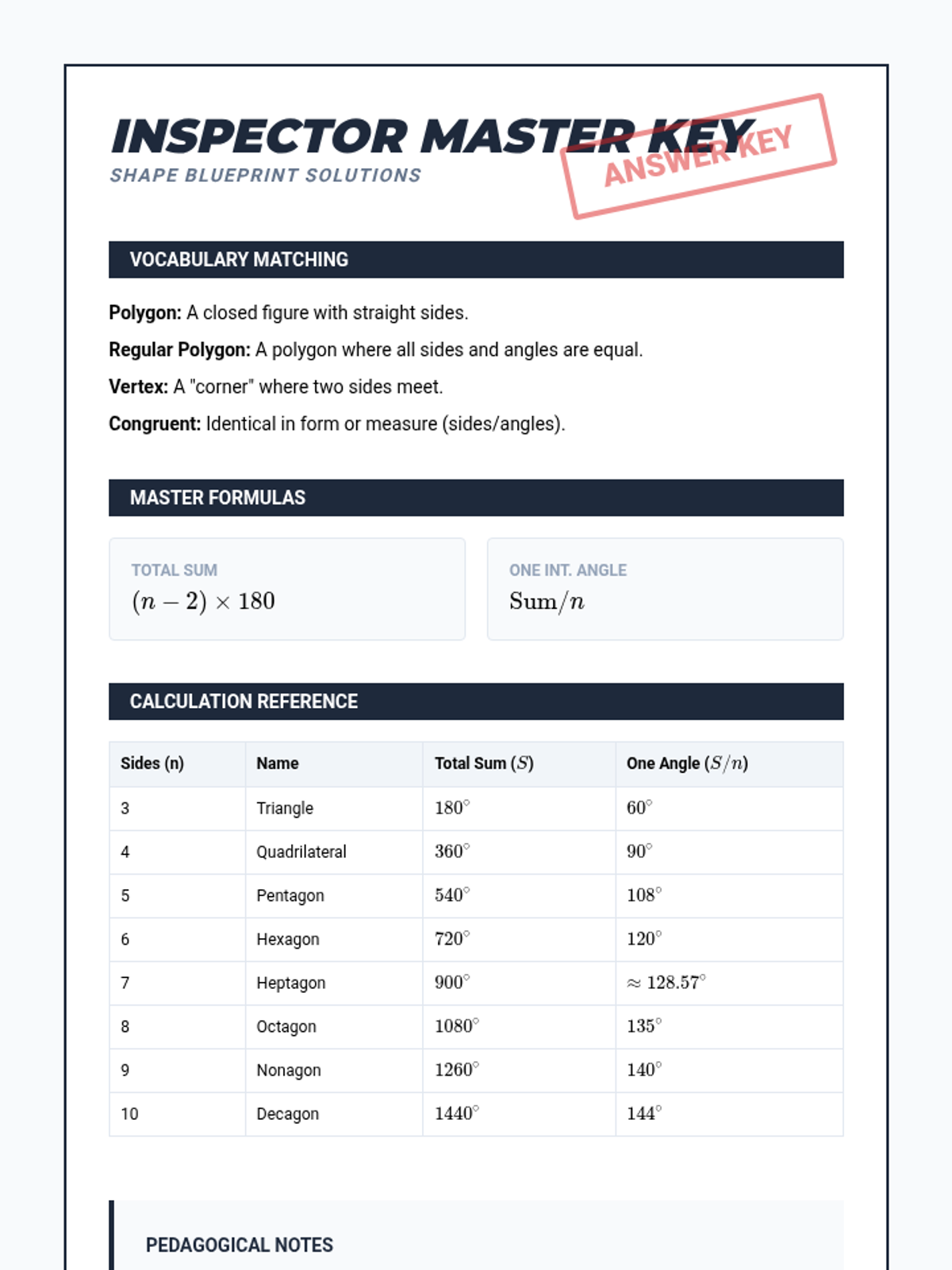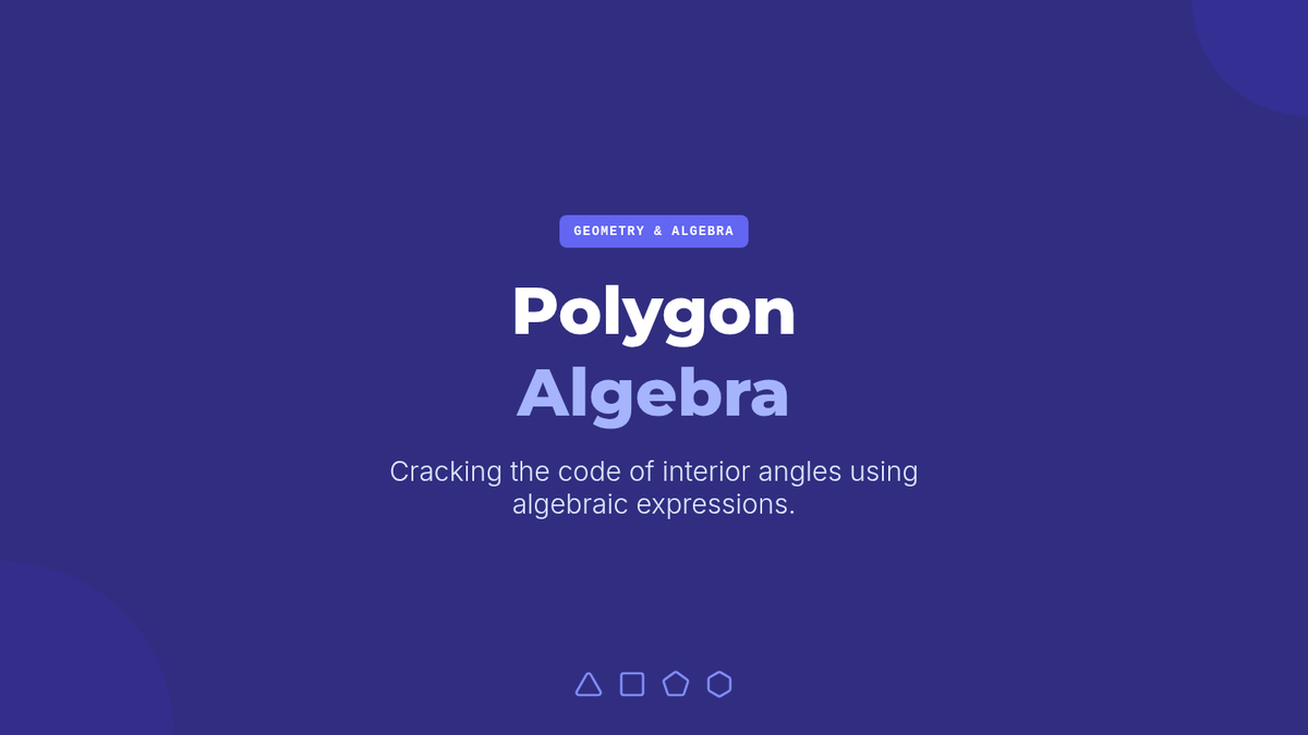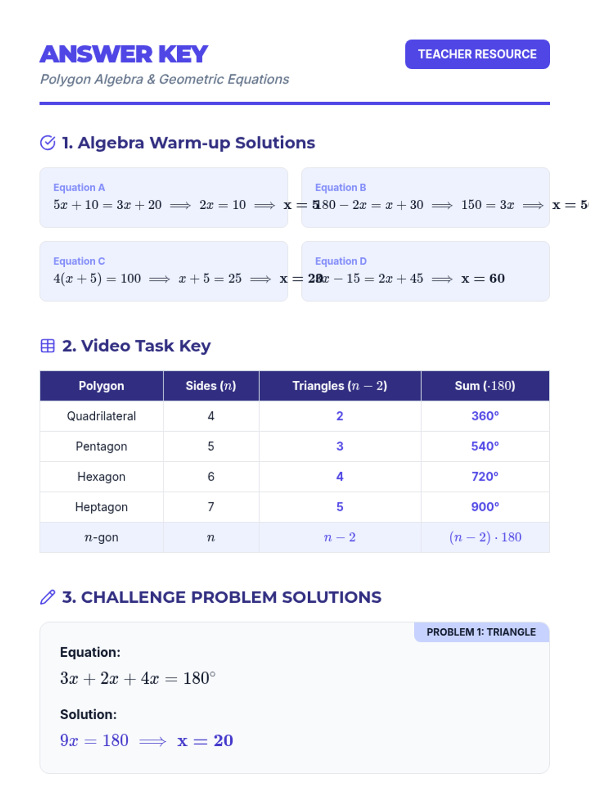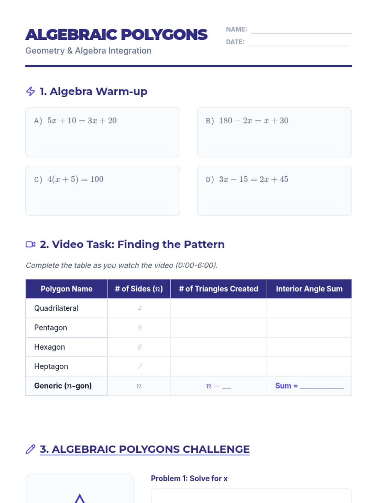 Students integrate algebra and geometry by using the interior angle sum formula \((n-2) \cdot 180\) to solve for unknown variables in various polygons. The lesson includes a warm-up, video analysis, and a hands-on 'Algebraic Polygons' challenge.