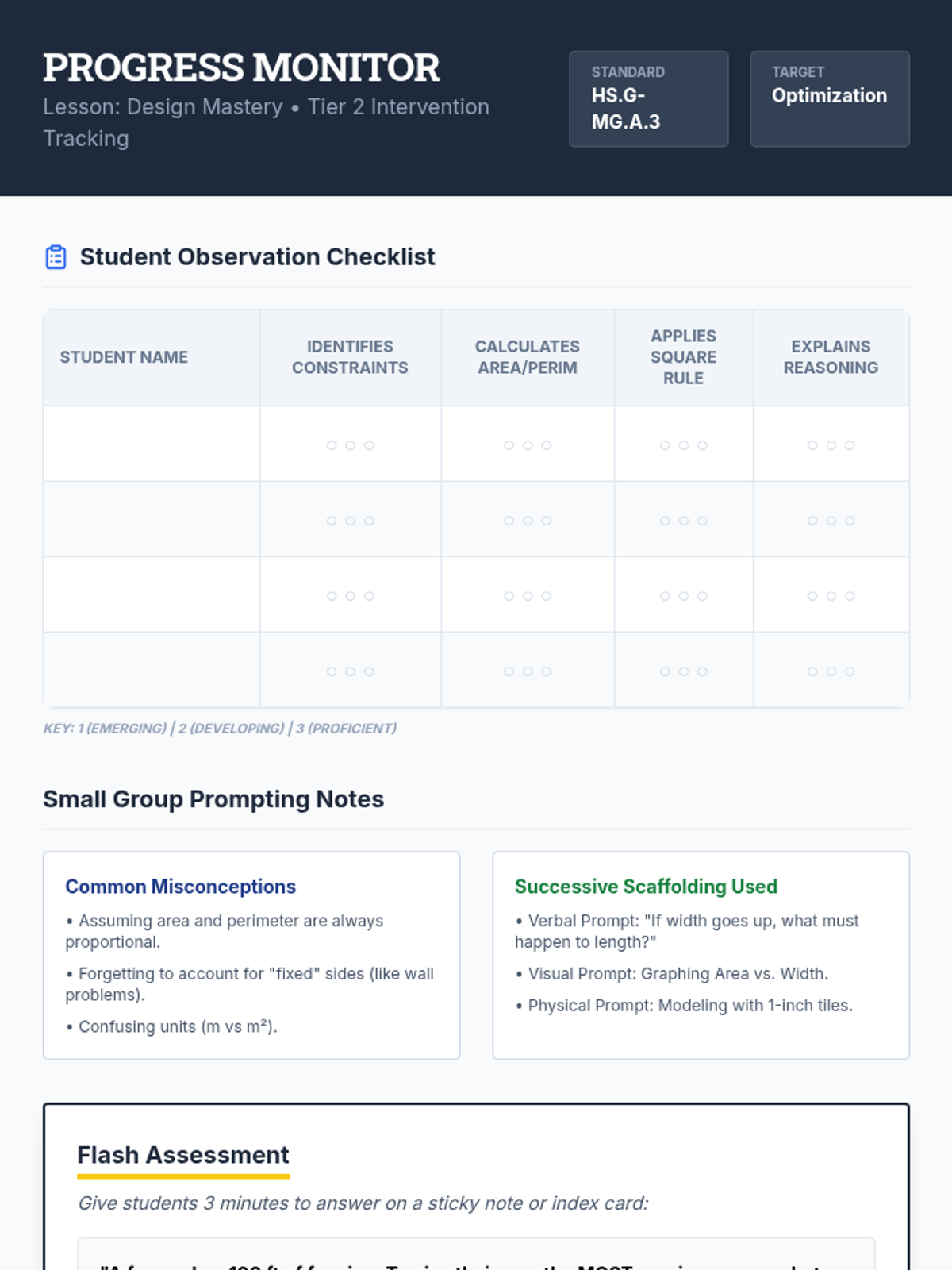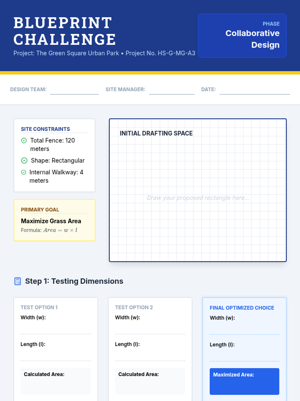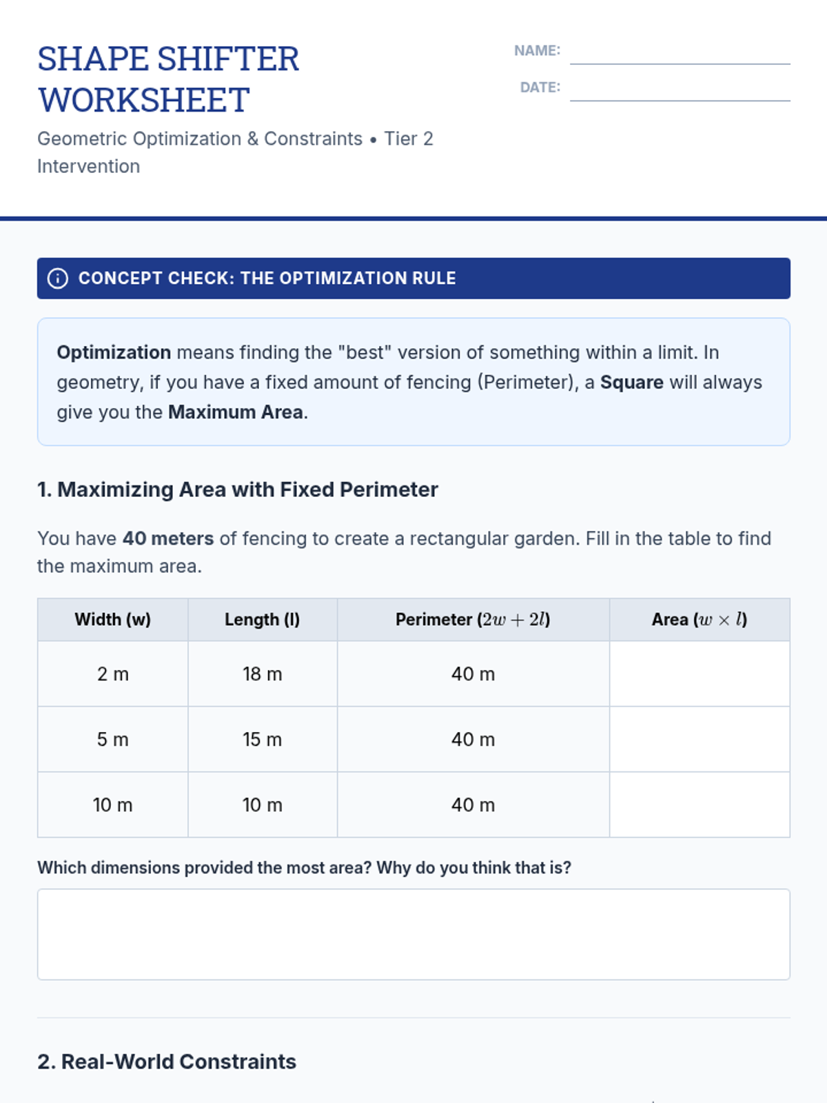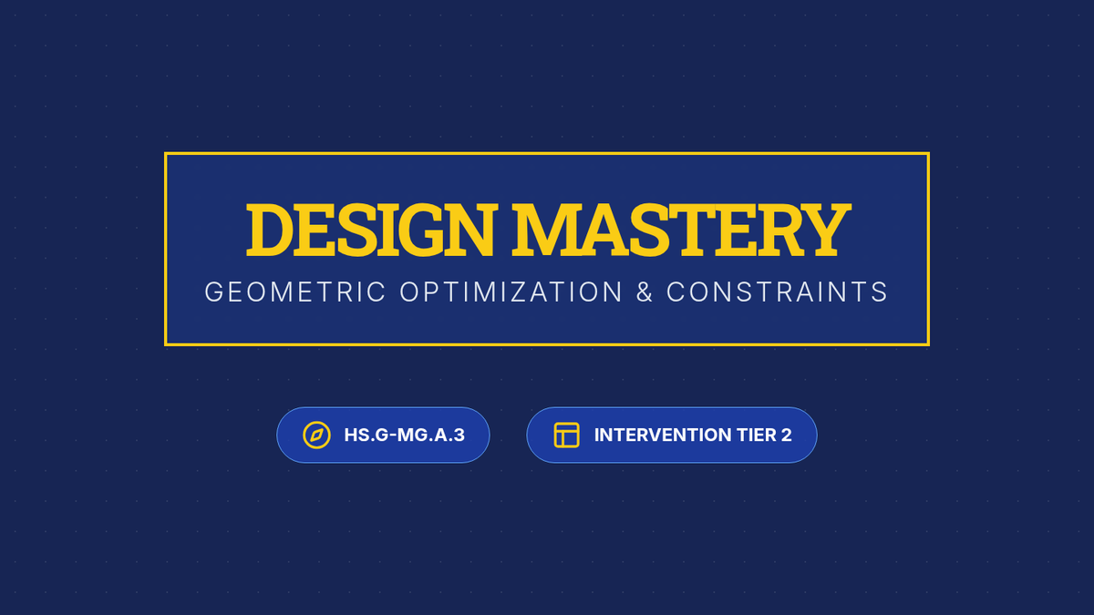 A Tier 2 intervention lesson focused on applying geometric principles to real-world design problems. Students explore optimization and constraints through scaffolded reasoning and a collaborative park design project.
