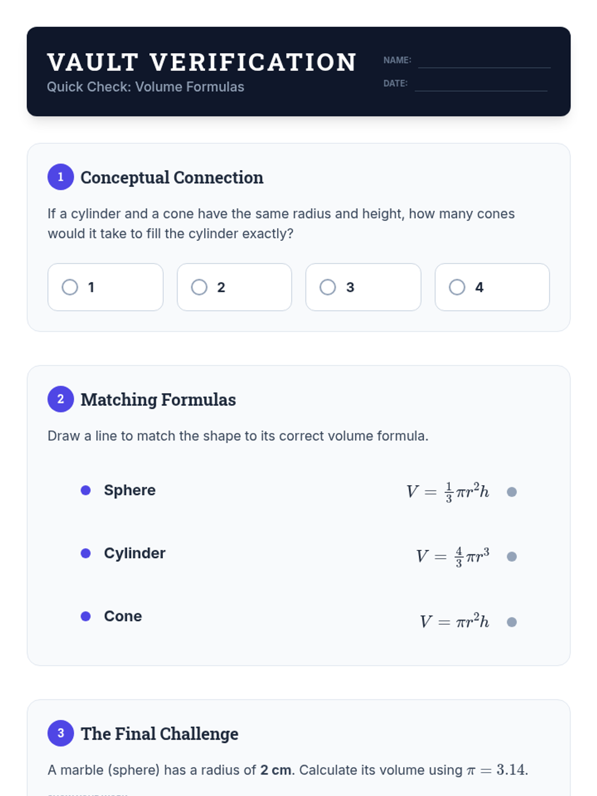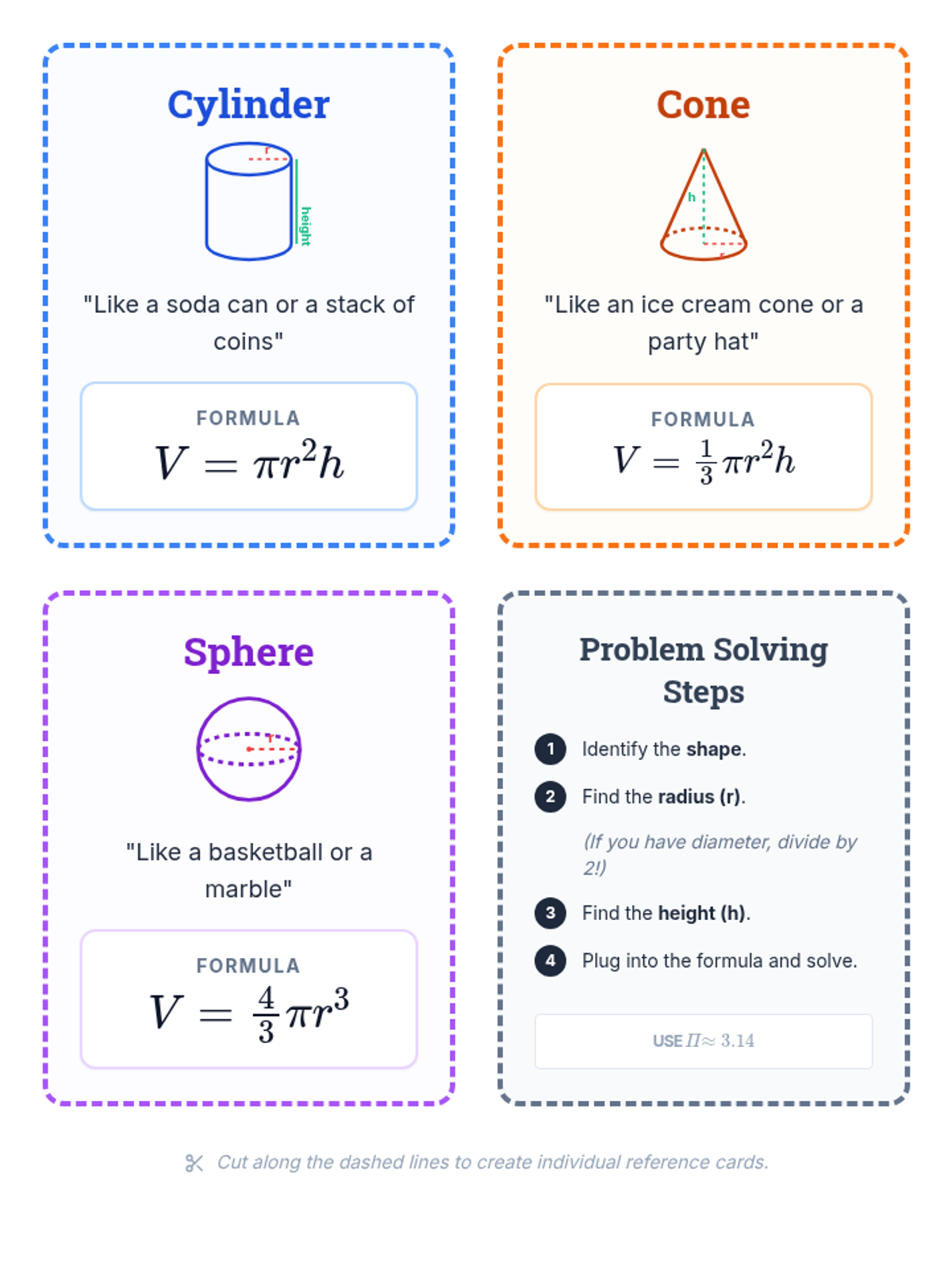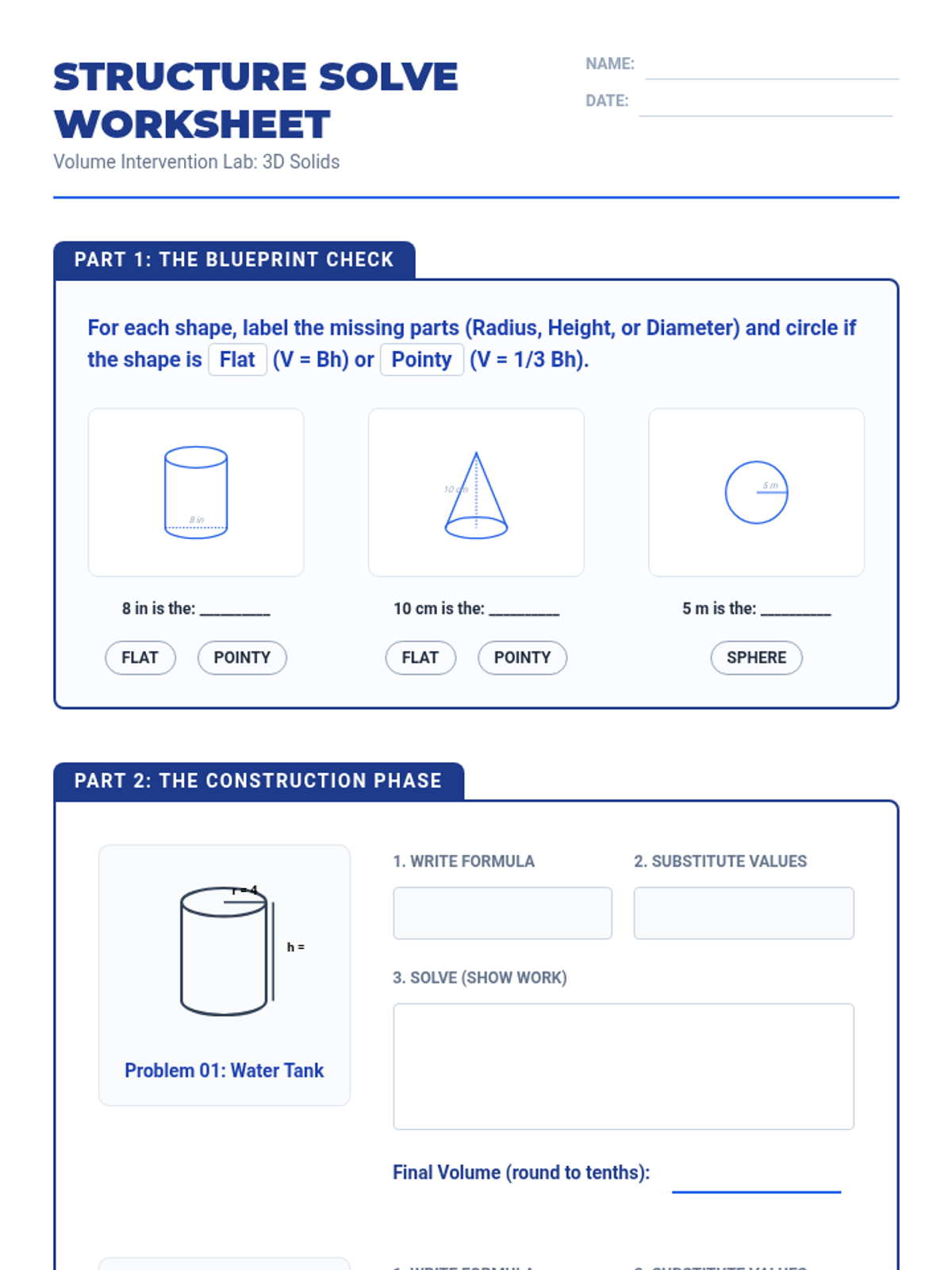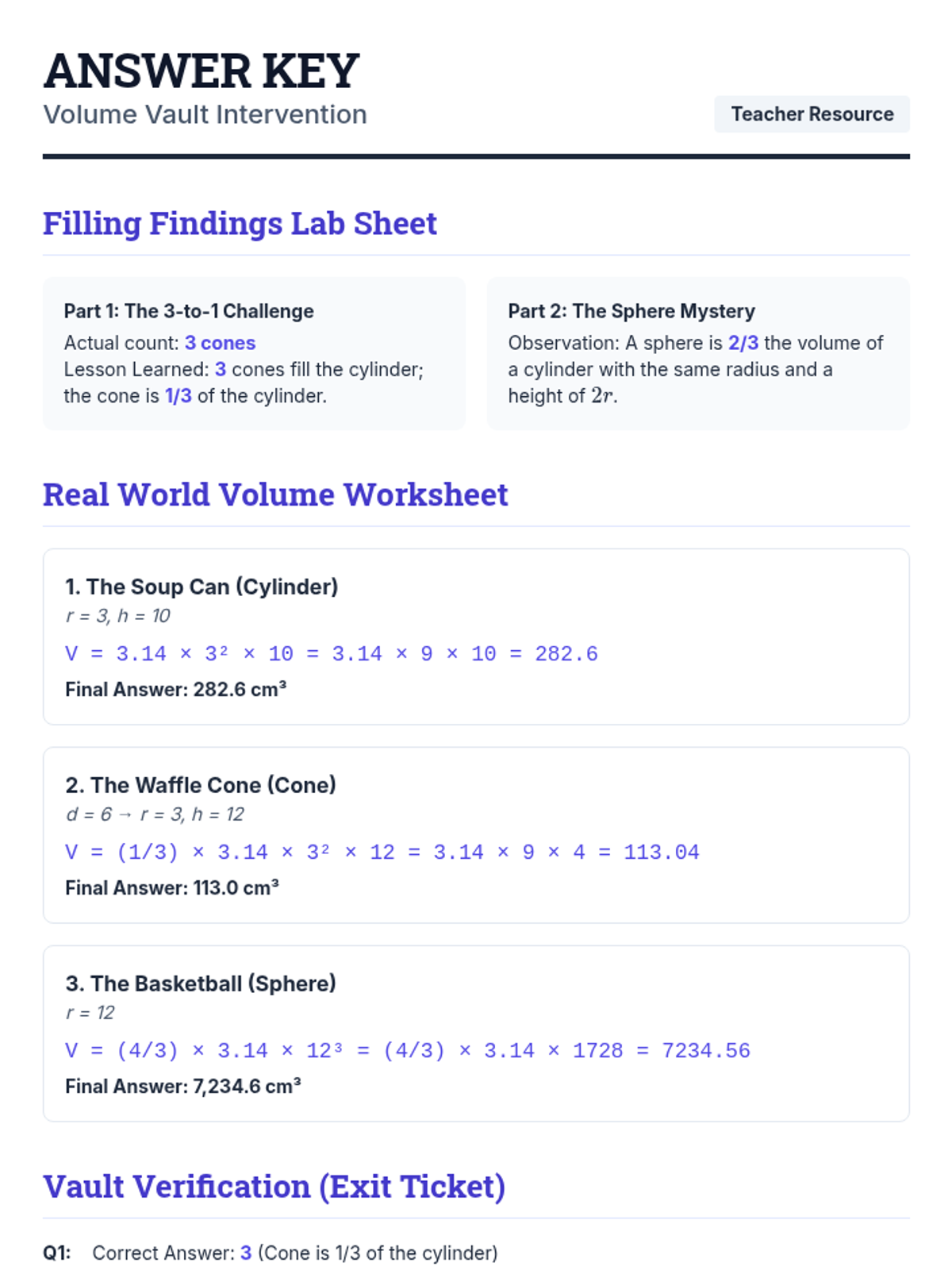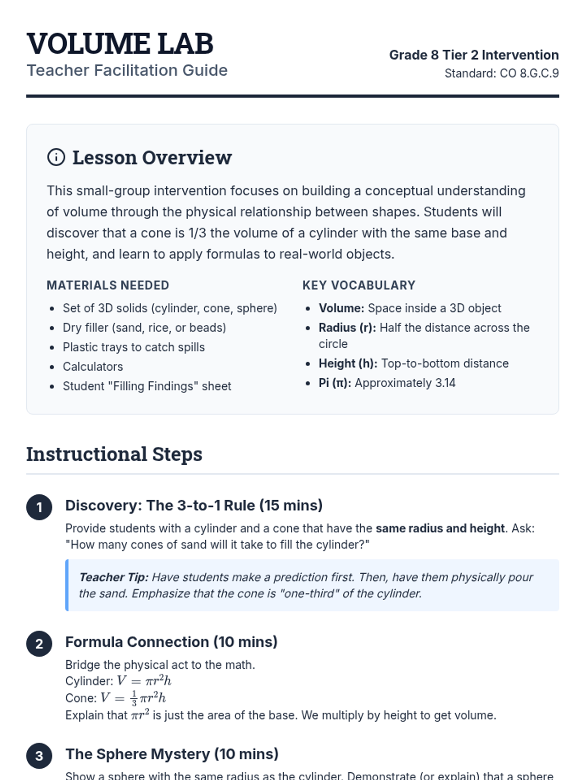 A Tier 2 intervention lesson focusing on the geometric relationships and volume formulas for cylinders, cones, and spheres through hands-on discovery and real-world application.