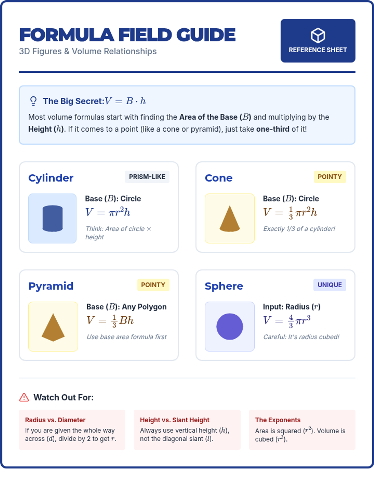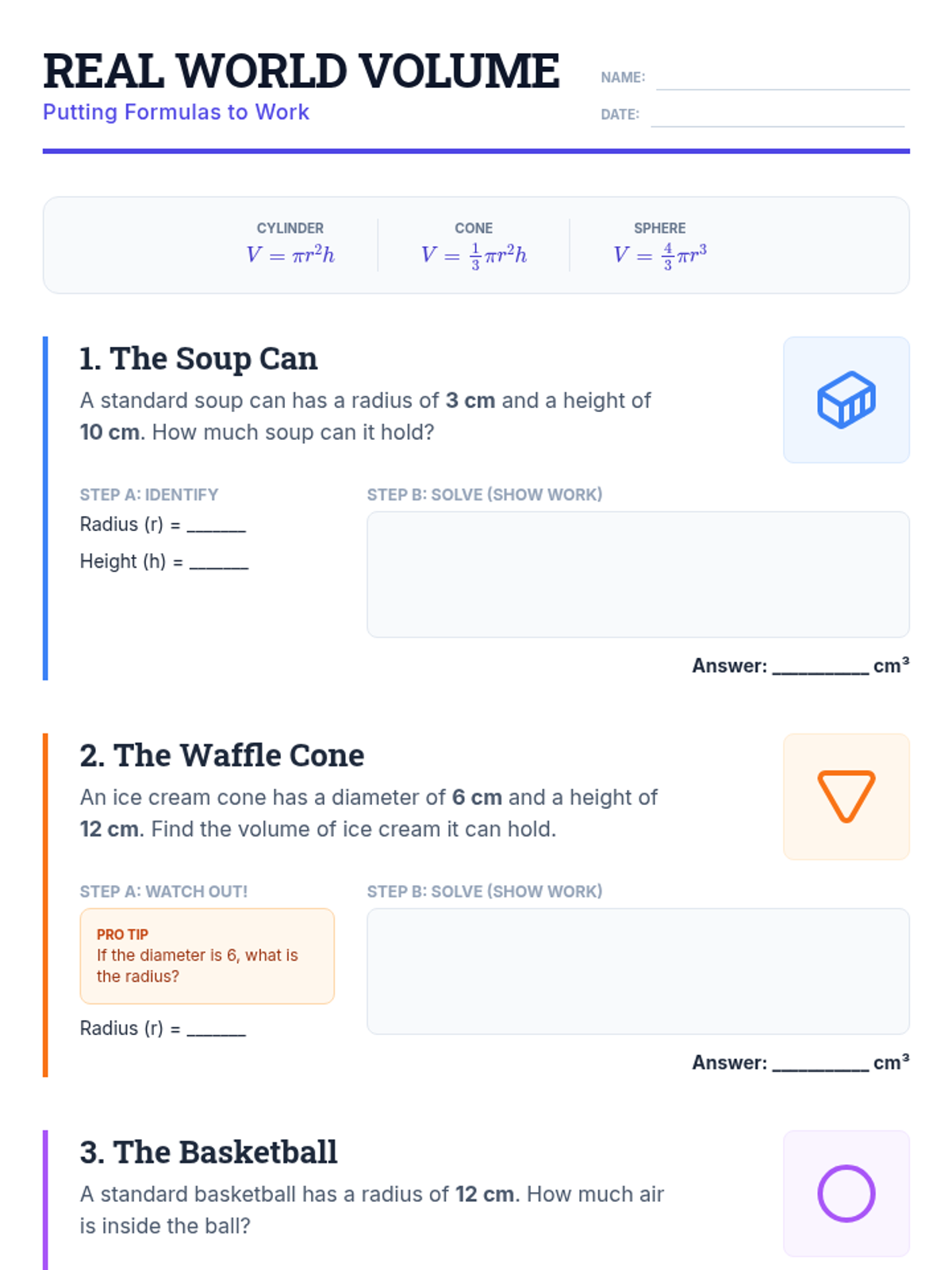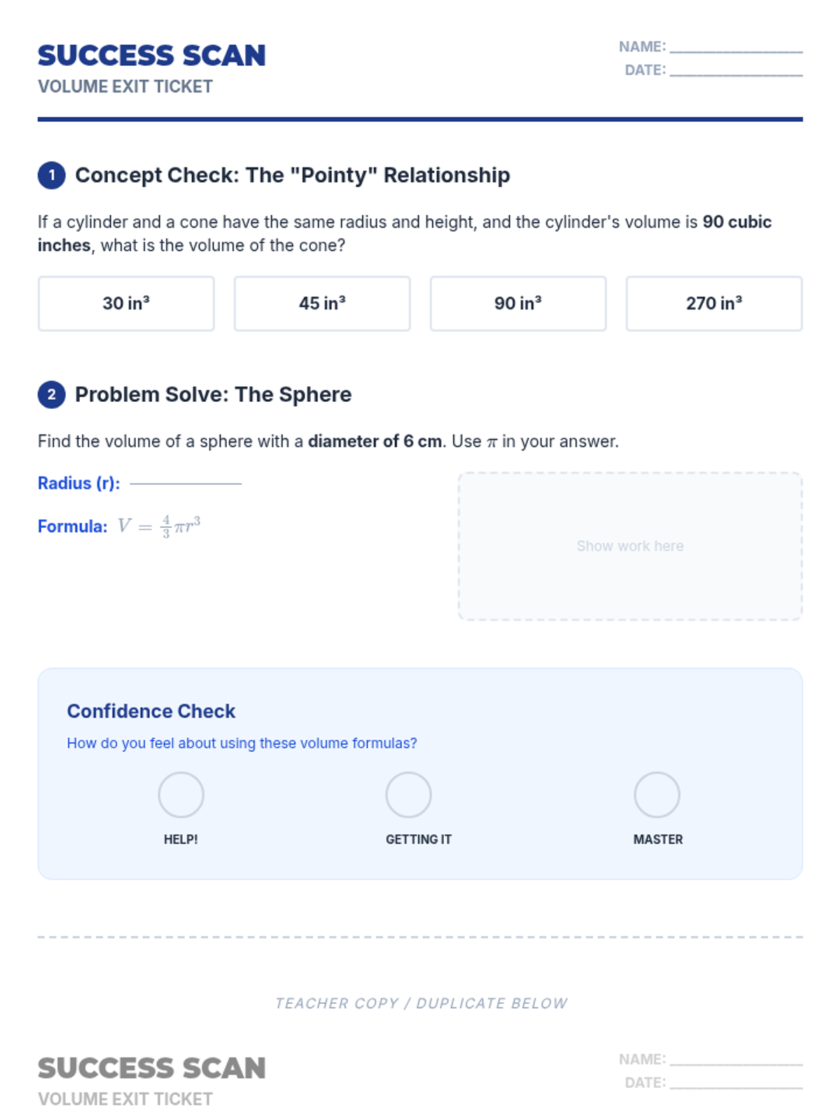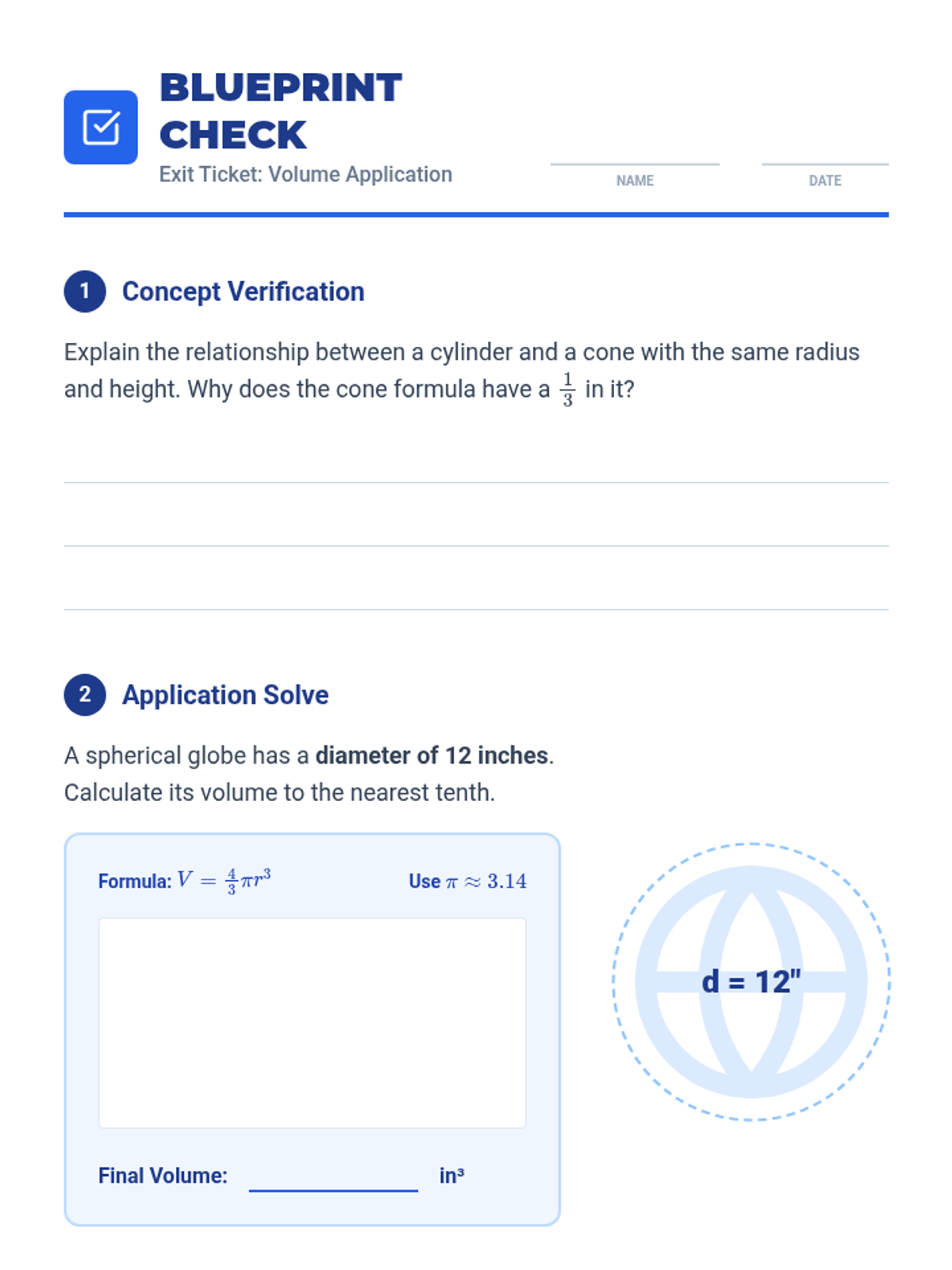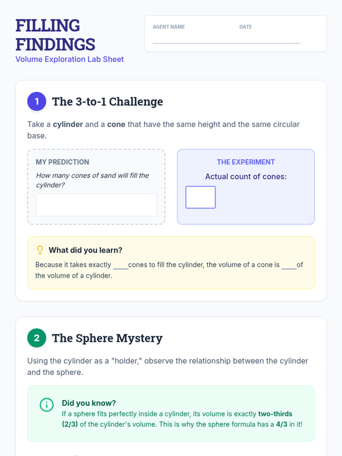 A Tier 2 intervention lesson focusing on the geometric relationships and volume formulas for cylinders, cones, and spheres through hands-on discovery and real-world application.