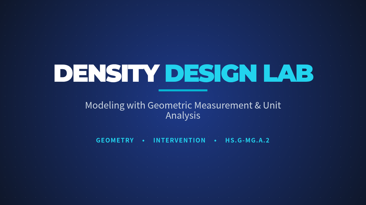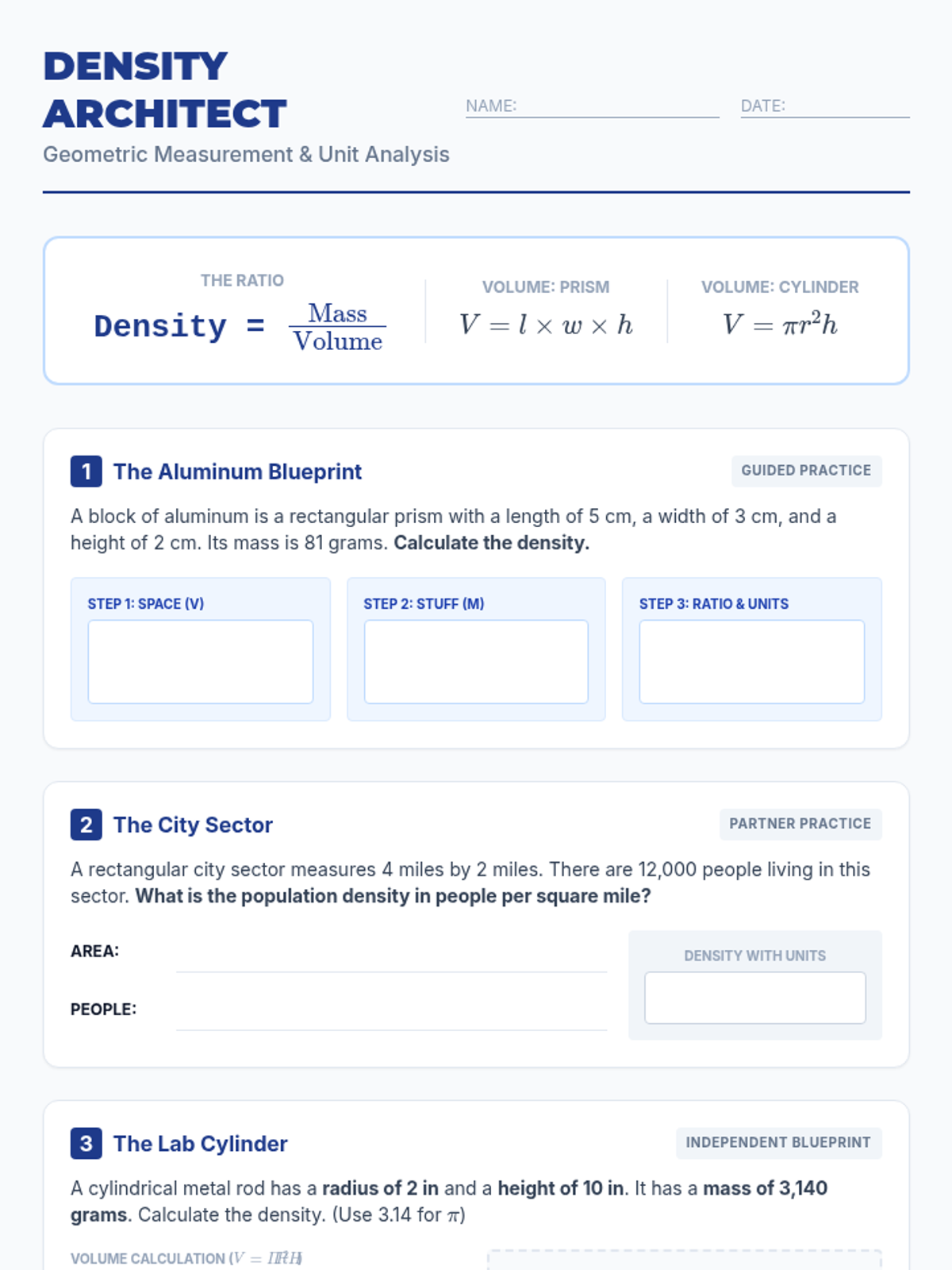 A Tier 2 intervention lesson focused on mastering density concepts using area and volume. Students will use modeling to solve real-world problems like population density and material mass.