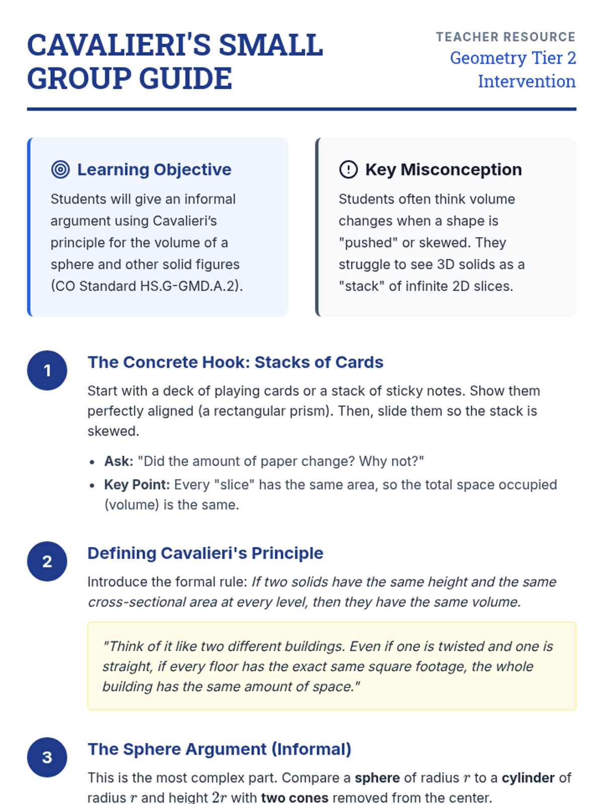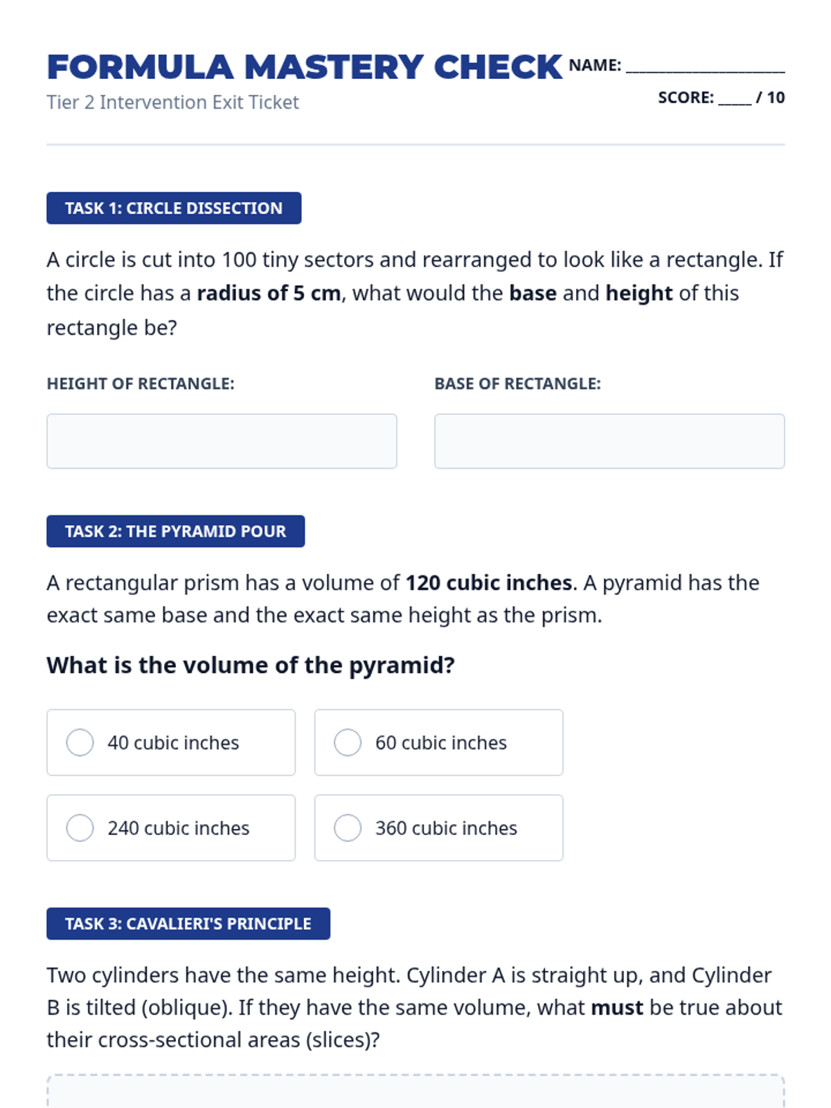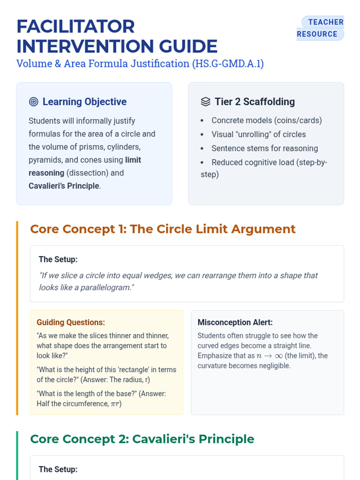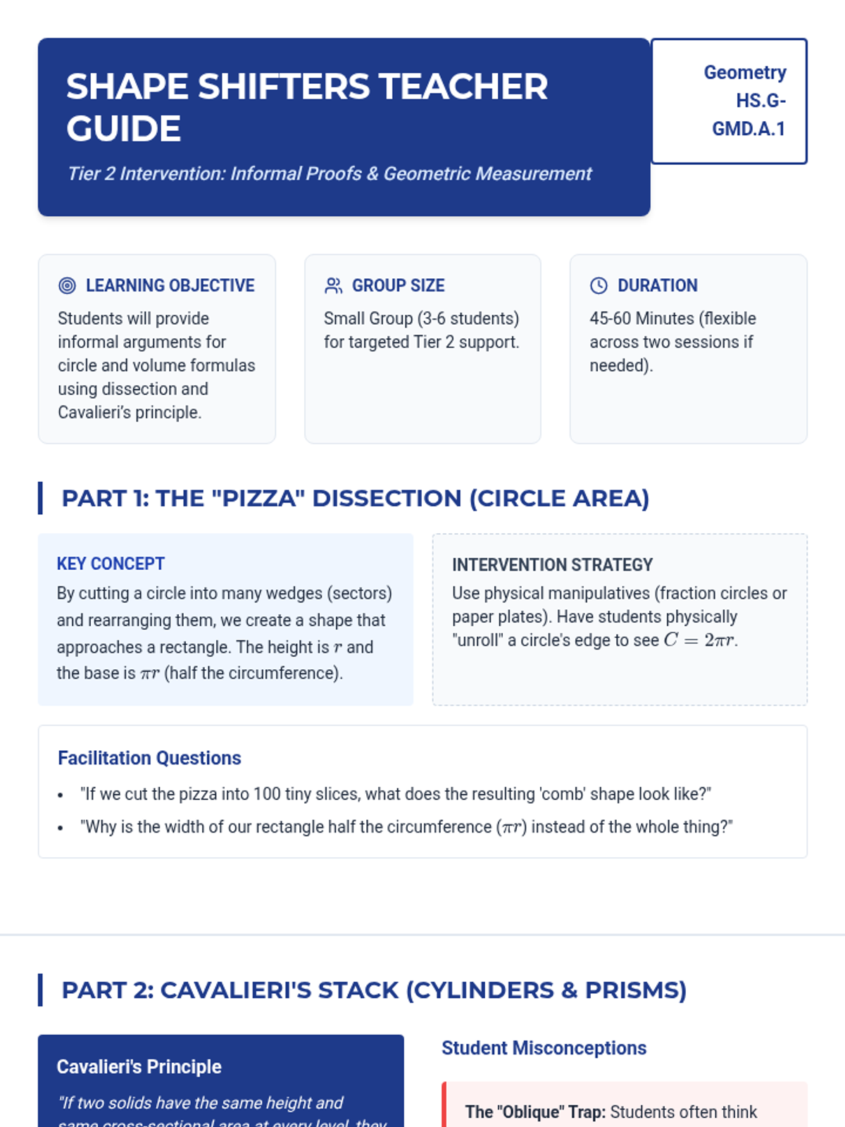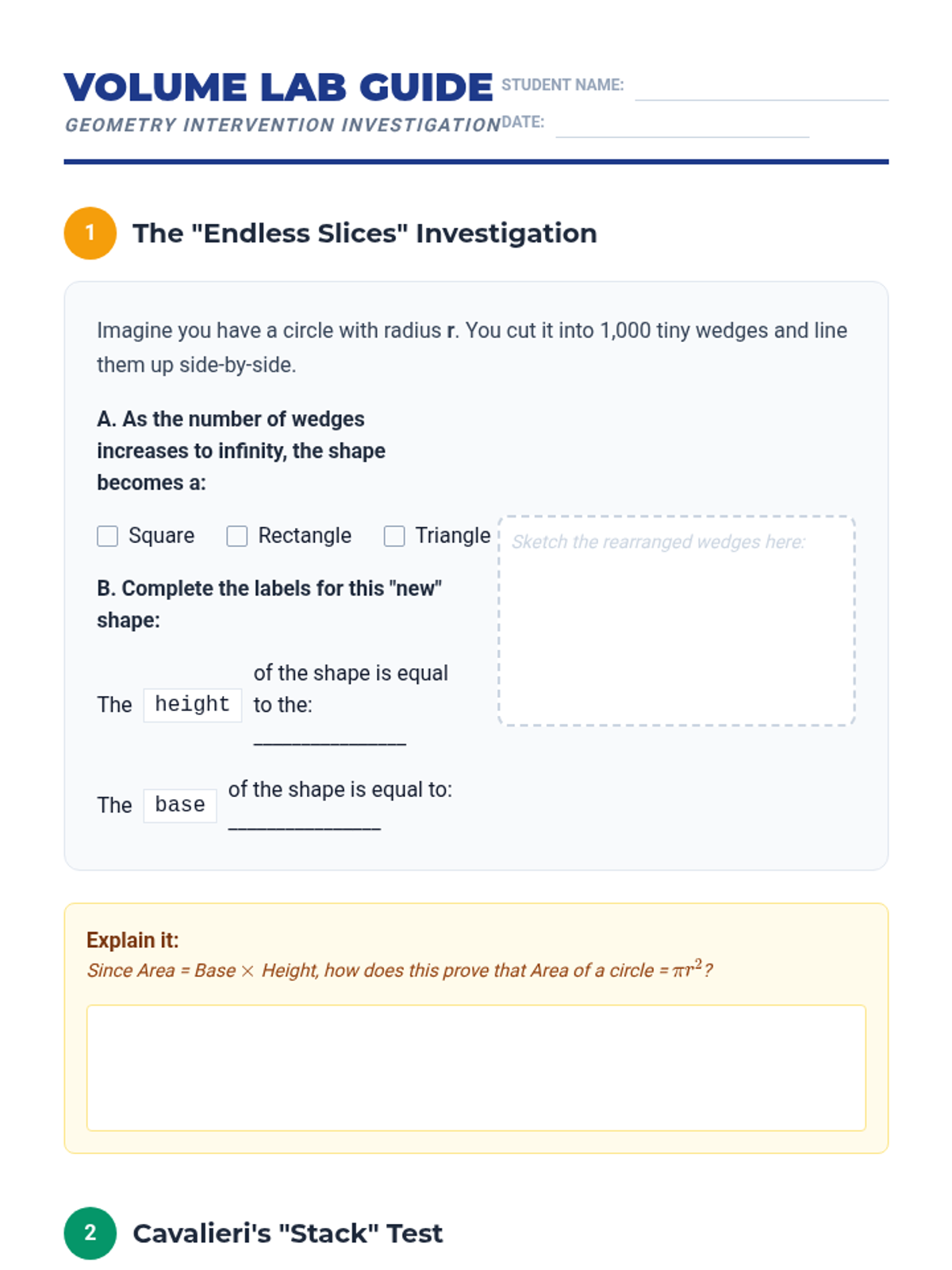 A Tier 2 intervention lesson focusing on the conceptual 'why' behind circle and volume formulas using dissection and Cavalieri's Principle. Designed for small group instruction with high scaffolding and progress monitoring.