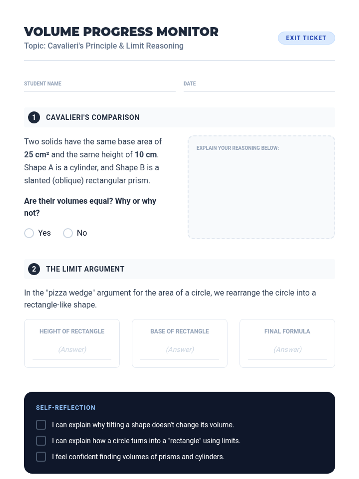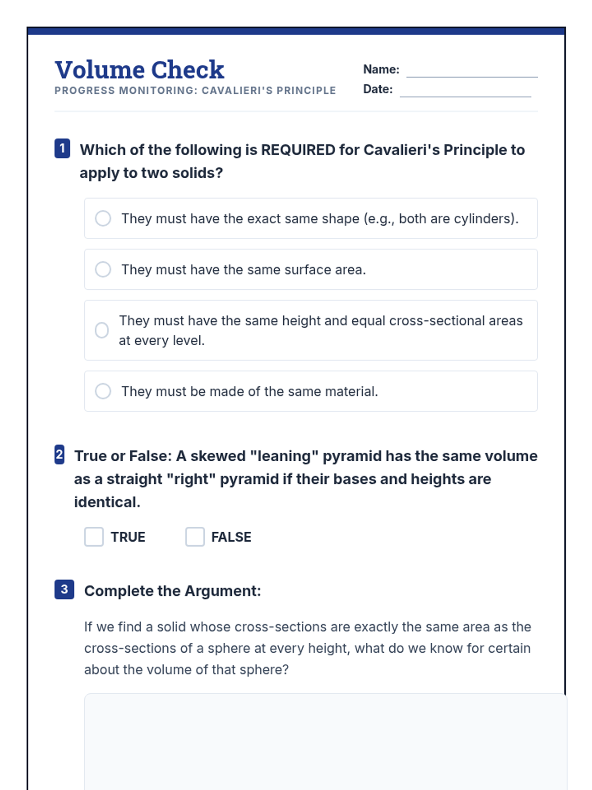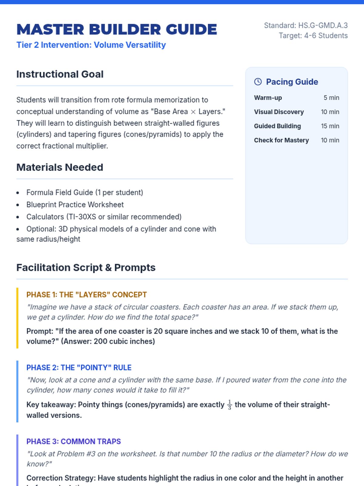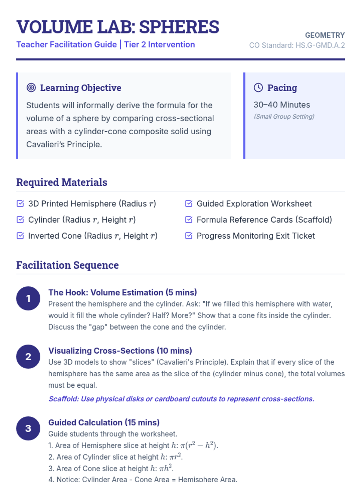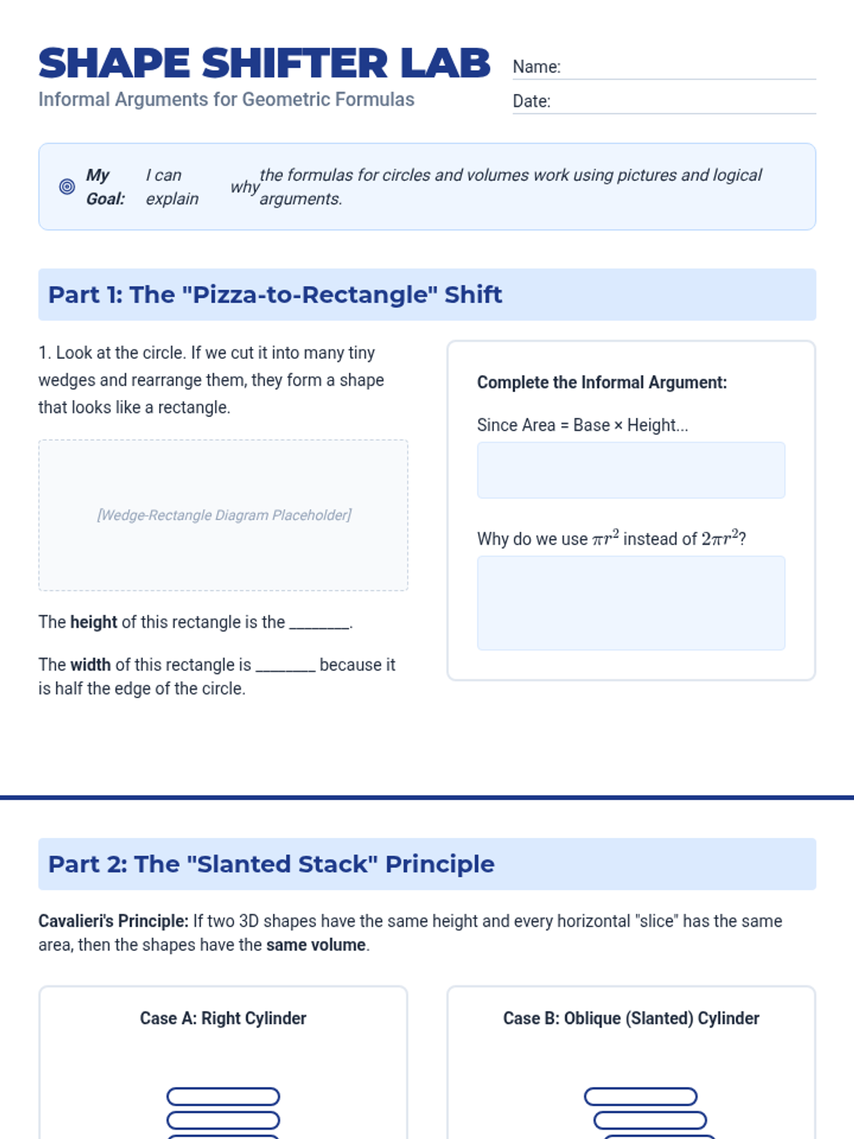 A Tier 2 intervention lesson focusing on the conceptual 'why' behind circle and volume formulas using dissection and Cavalieri's Principle. Designed for small group instruction with high scaffolding and progress monitoring.