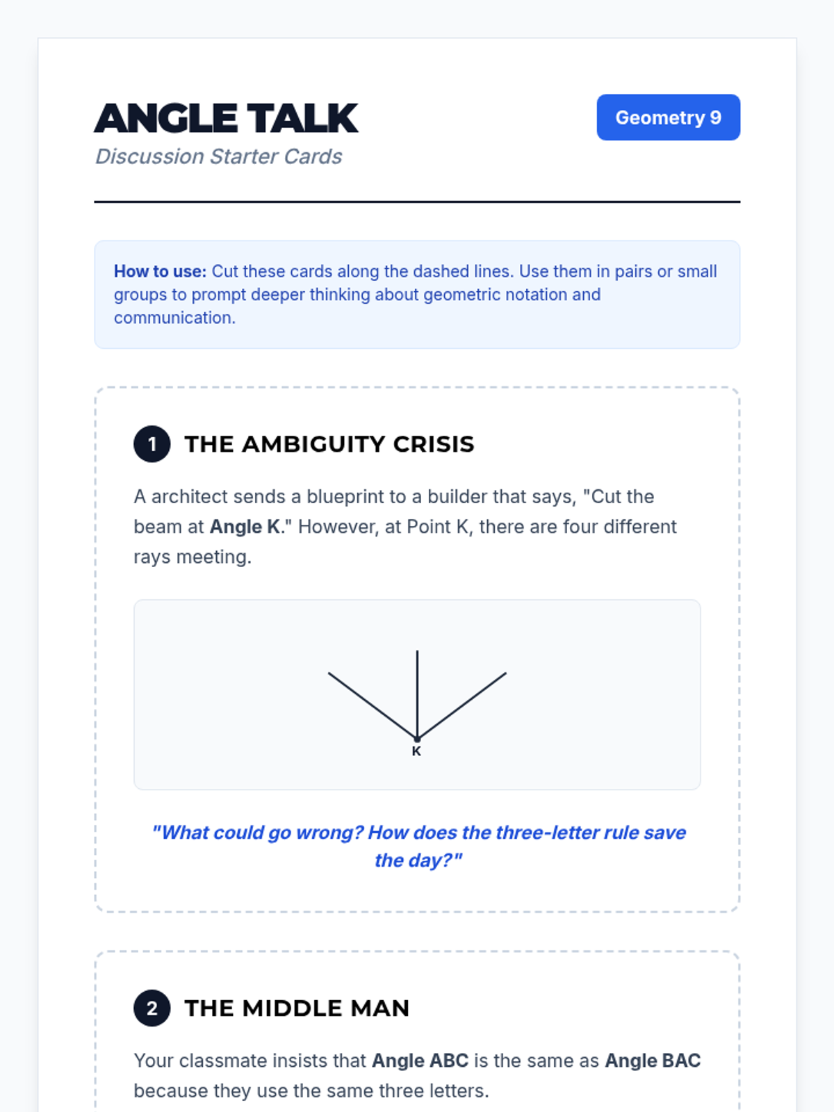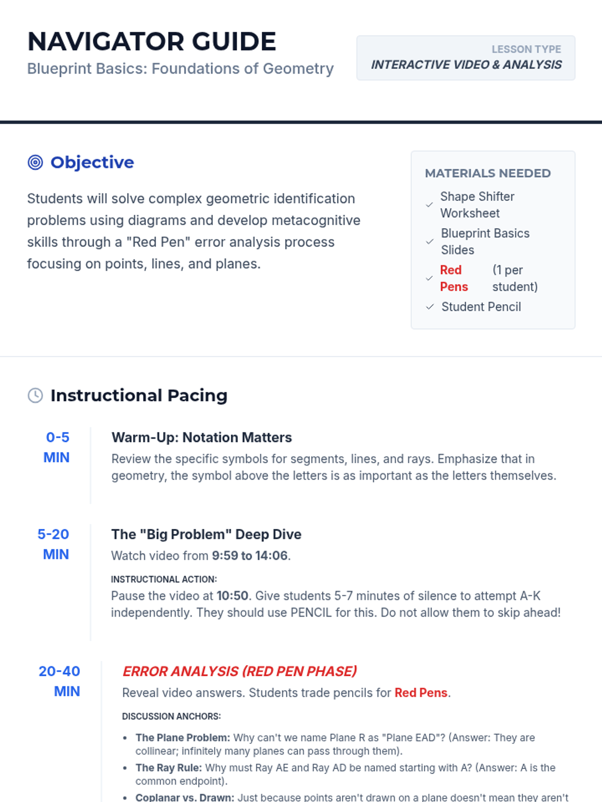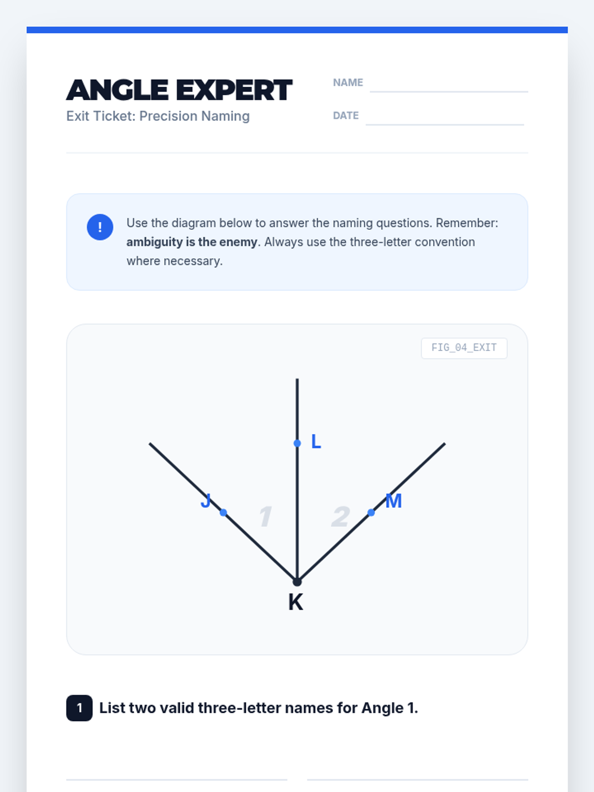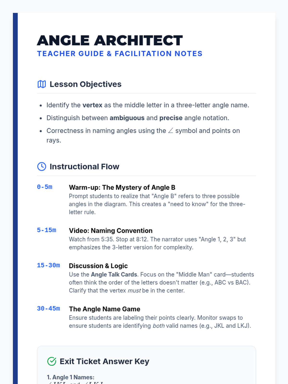 A focused lesson on the precise naming of angles in complex geometric diagrams, emphasizing the three-letter convention to eliminate ambiguity. Students will transition from single-letter naming to the rigorous vertex-in-the-middle approach through video analysis and a peer-to-peer drawing game.