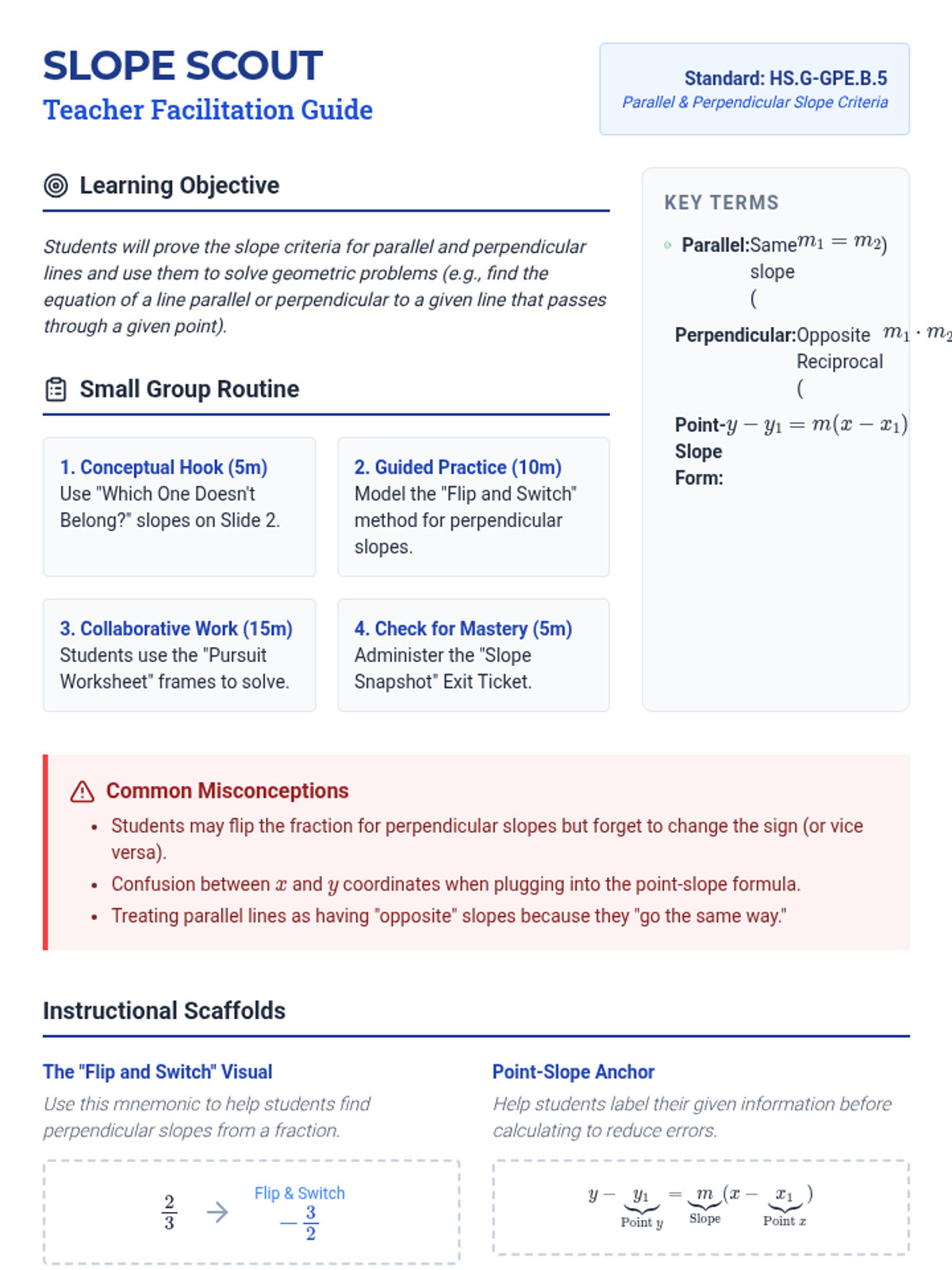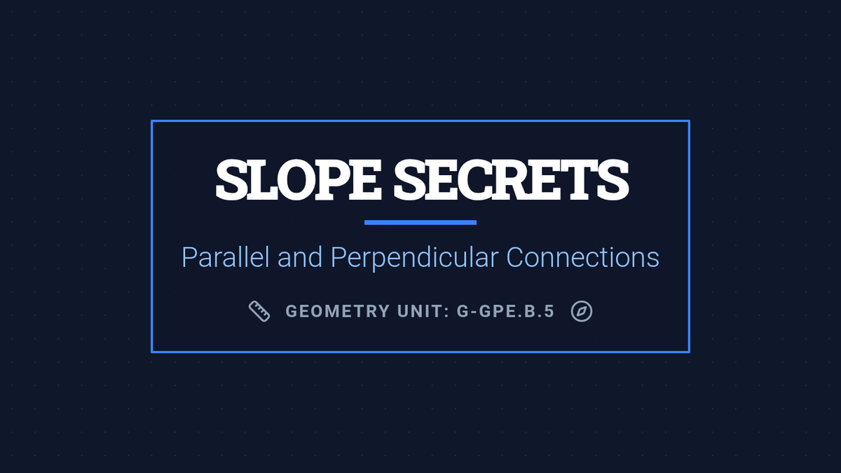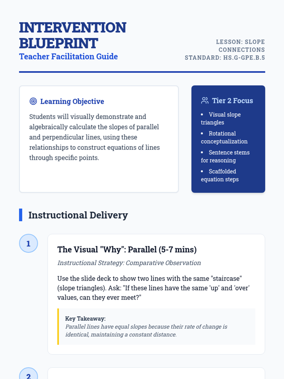 A targeted intervention lesson focused on the relationship between parallel and perpendicular slopes, using step-by-step frameworks to help students write linear equations. This lesson is designed for Tier 2 small group support with a focus on visual representations and algebraic procedures.