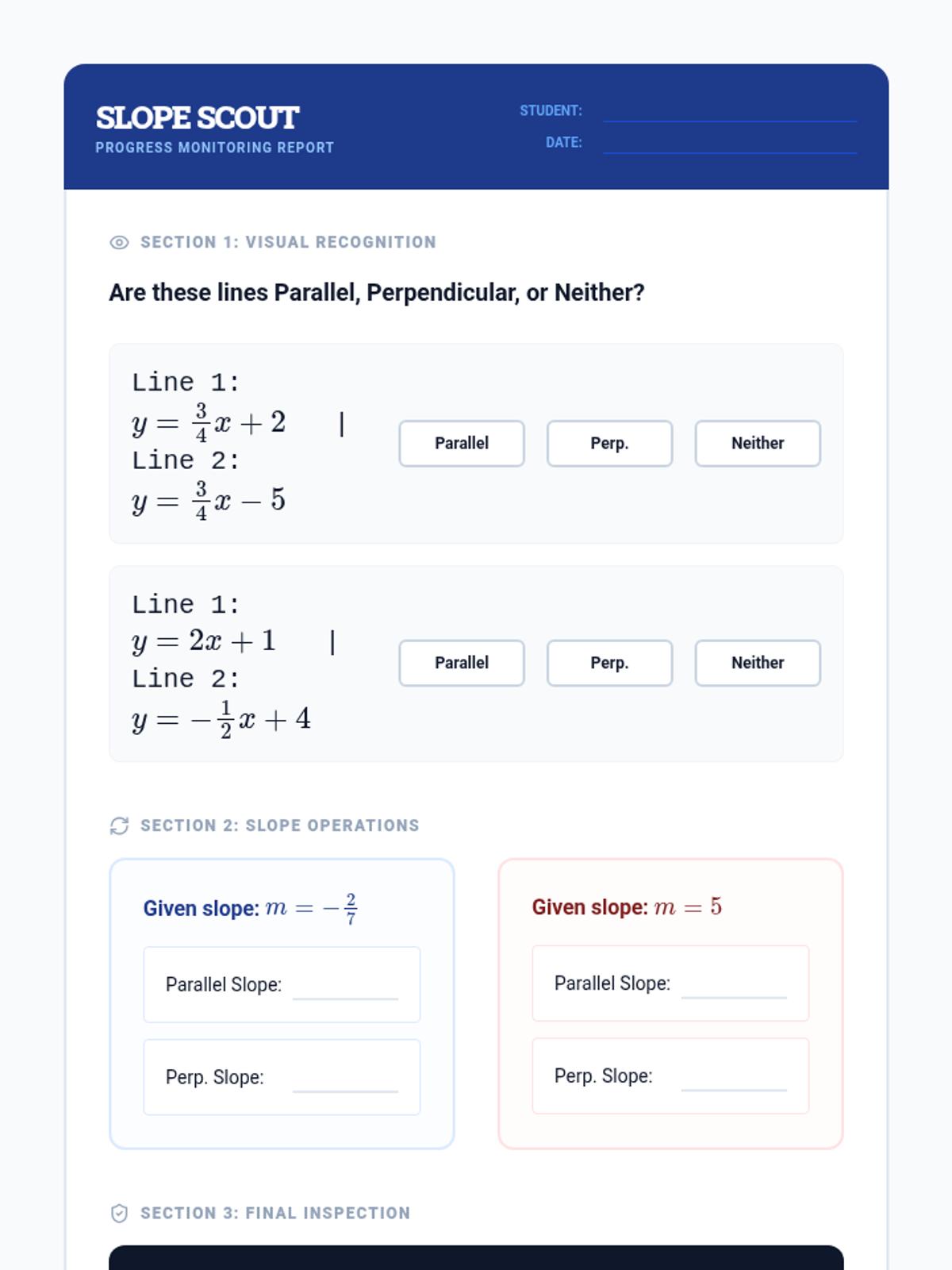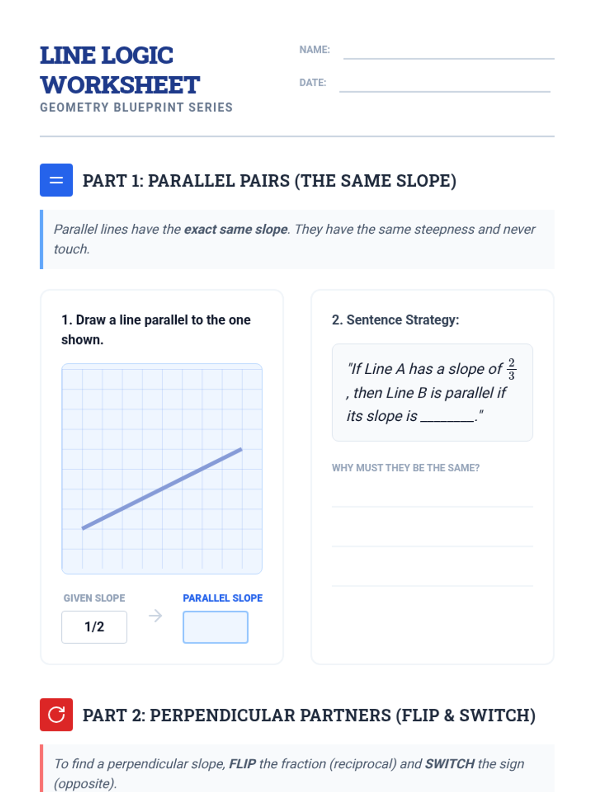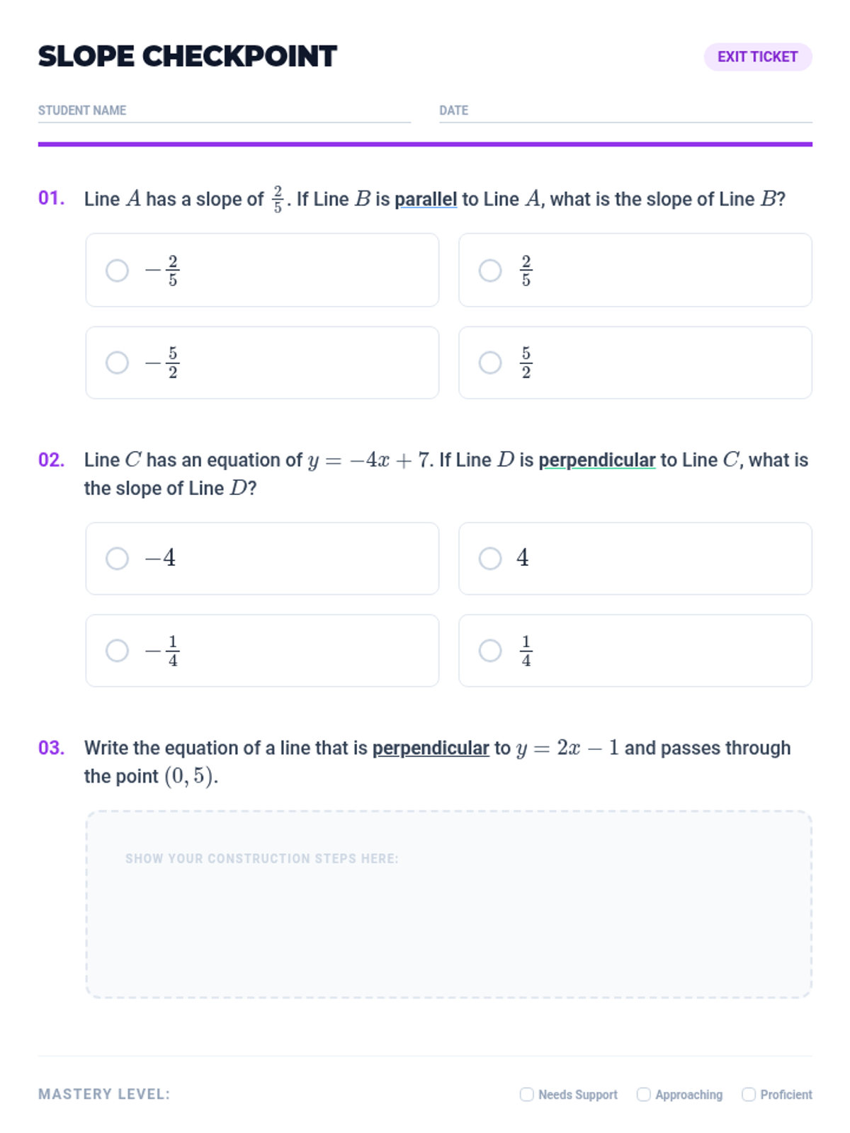 A targeted intervention lesson focused on the relationship between parallel and perpendicular slopes, using step-by-step frameworks to help students write linear equations. This lesson is designed for Tier 2 small group support with a focus on visual representations and algebraic procedures.