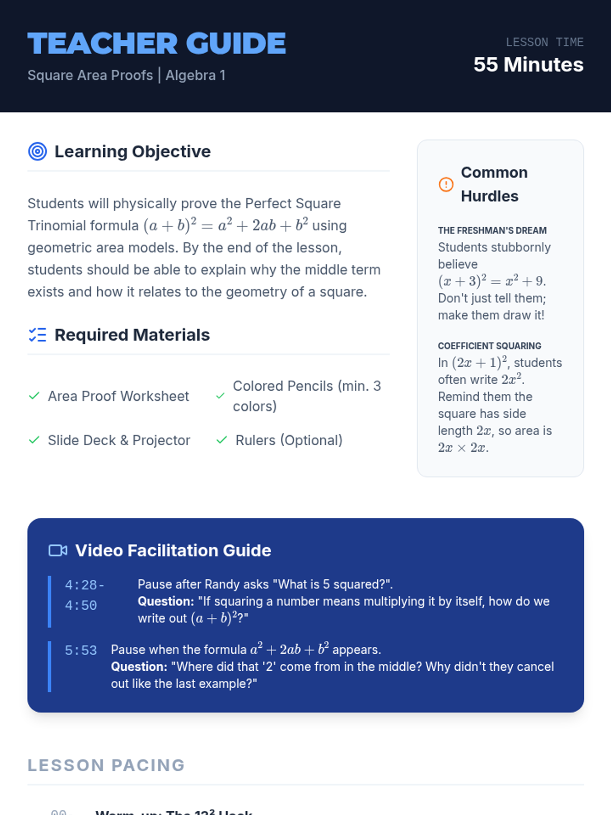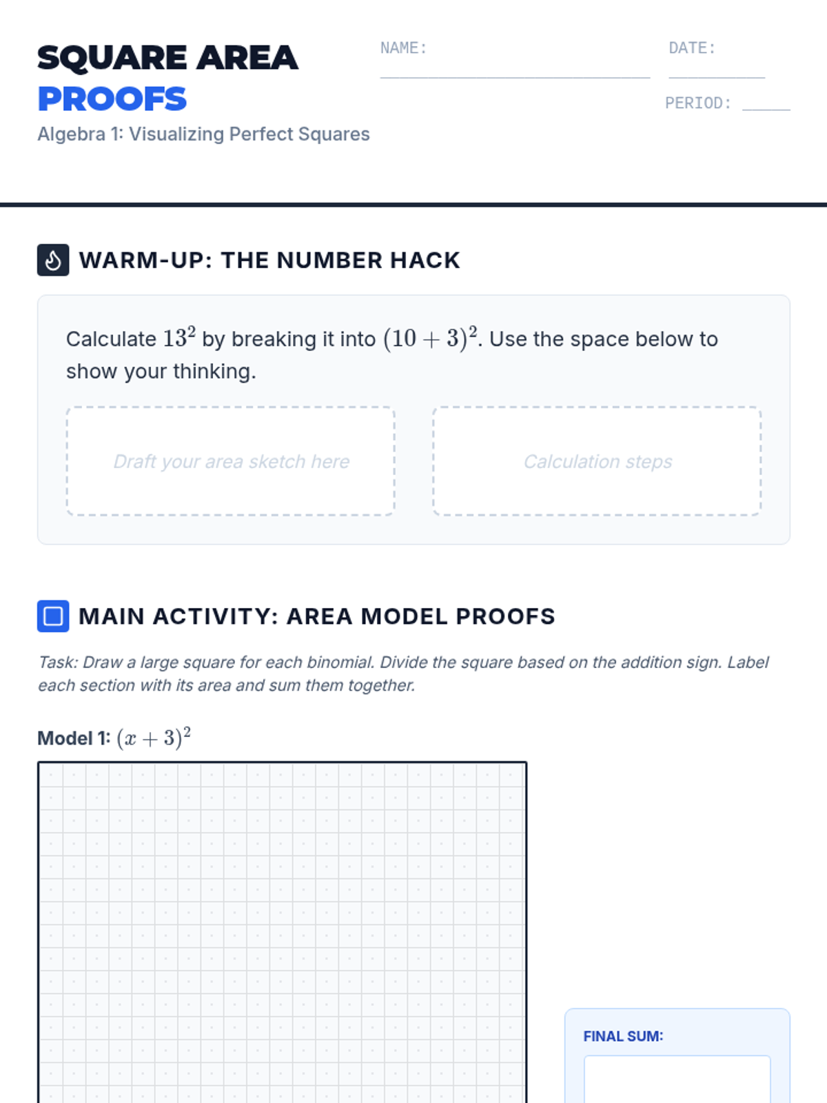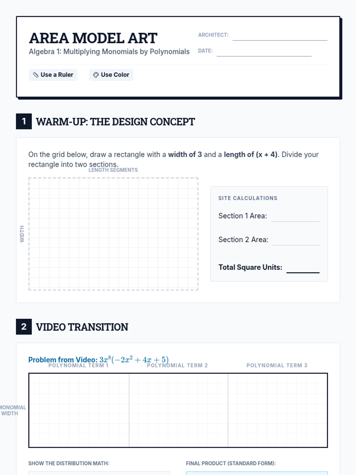 A lesson connecting geometric area models to the algebraic multiplication of monomials and polynomials, featuring a video-guided discussion and a creative 'Area Model Art' activity.
