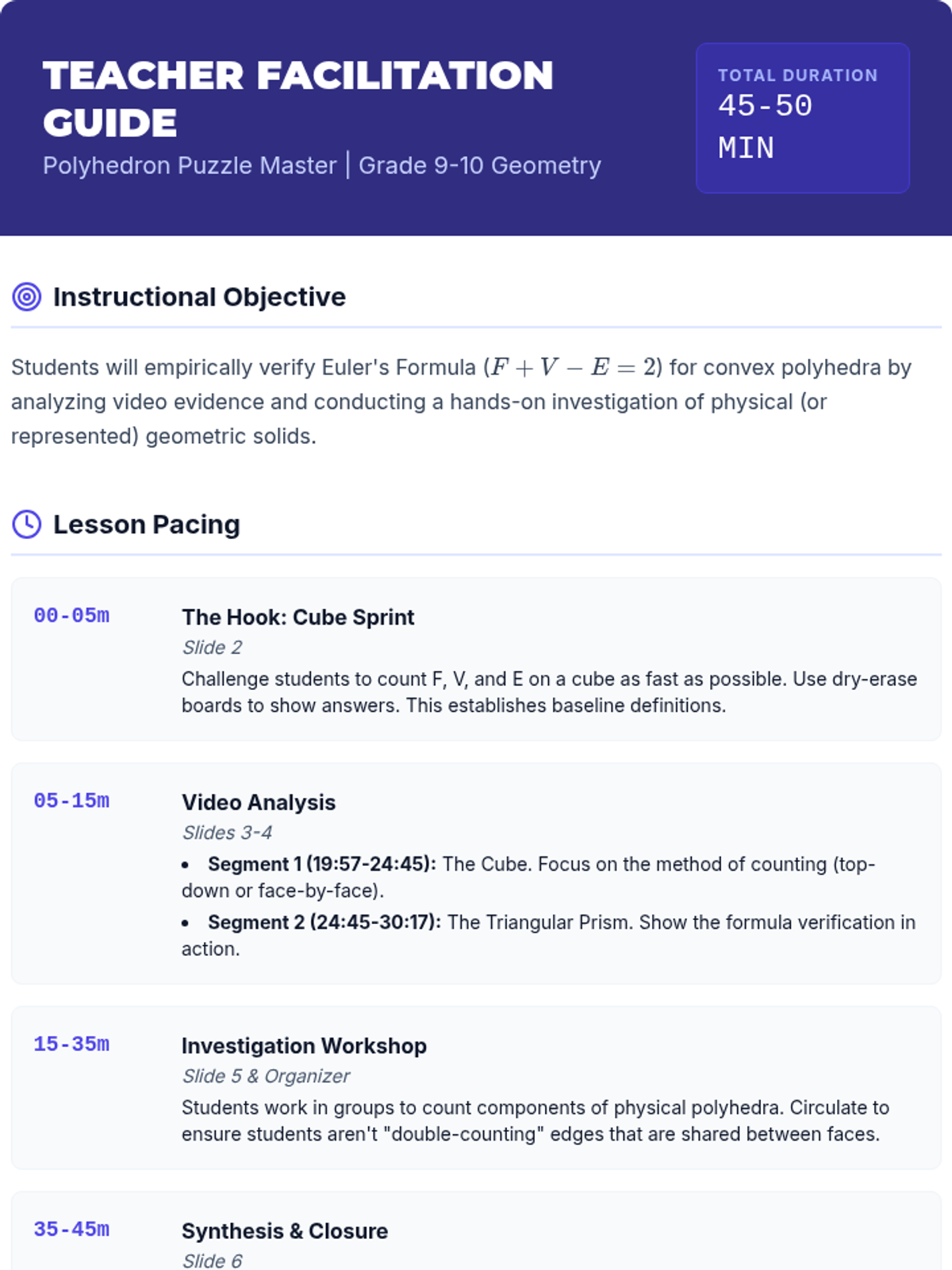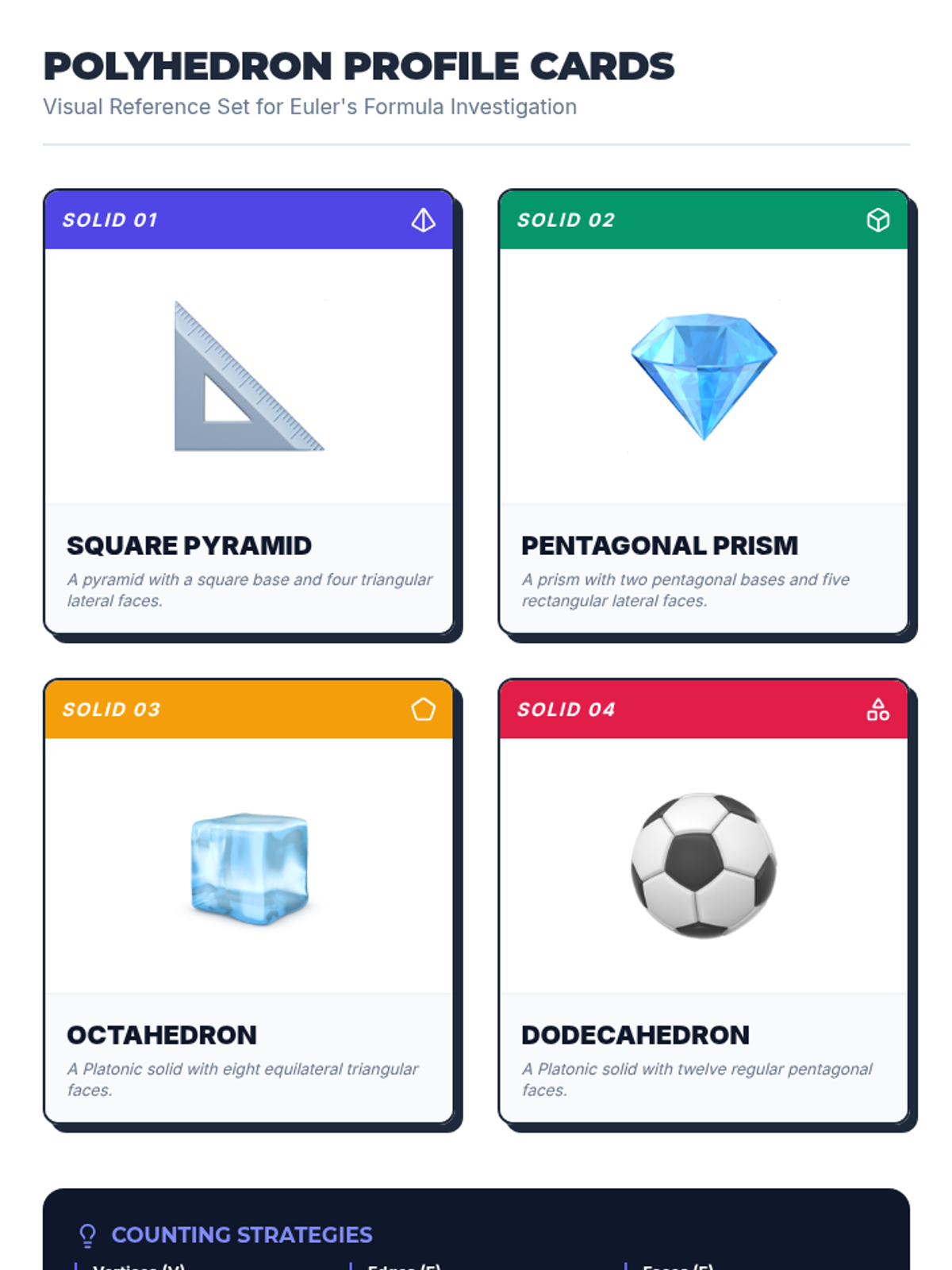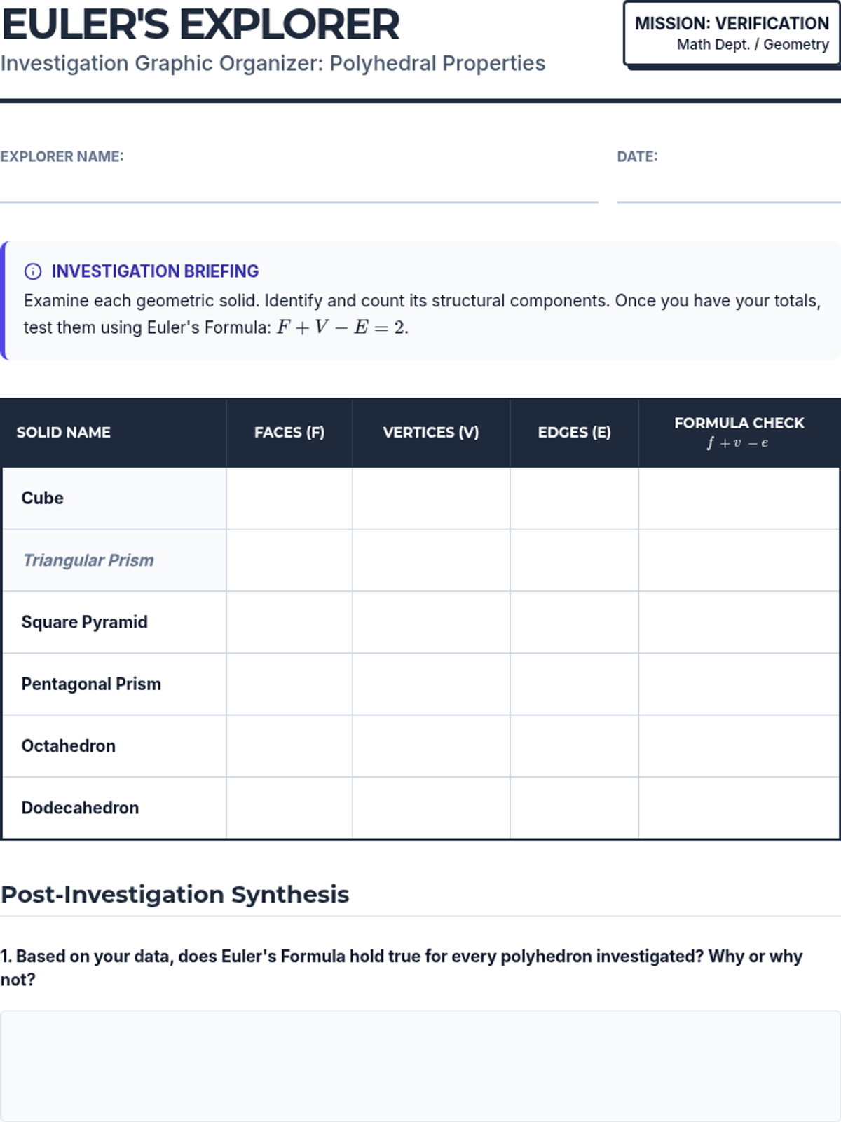 Students will investigate and verify Euler's Formula (F+V-E=2) for various polyhedra through video analysis and hands-on investigation of 3D geometric solids.