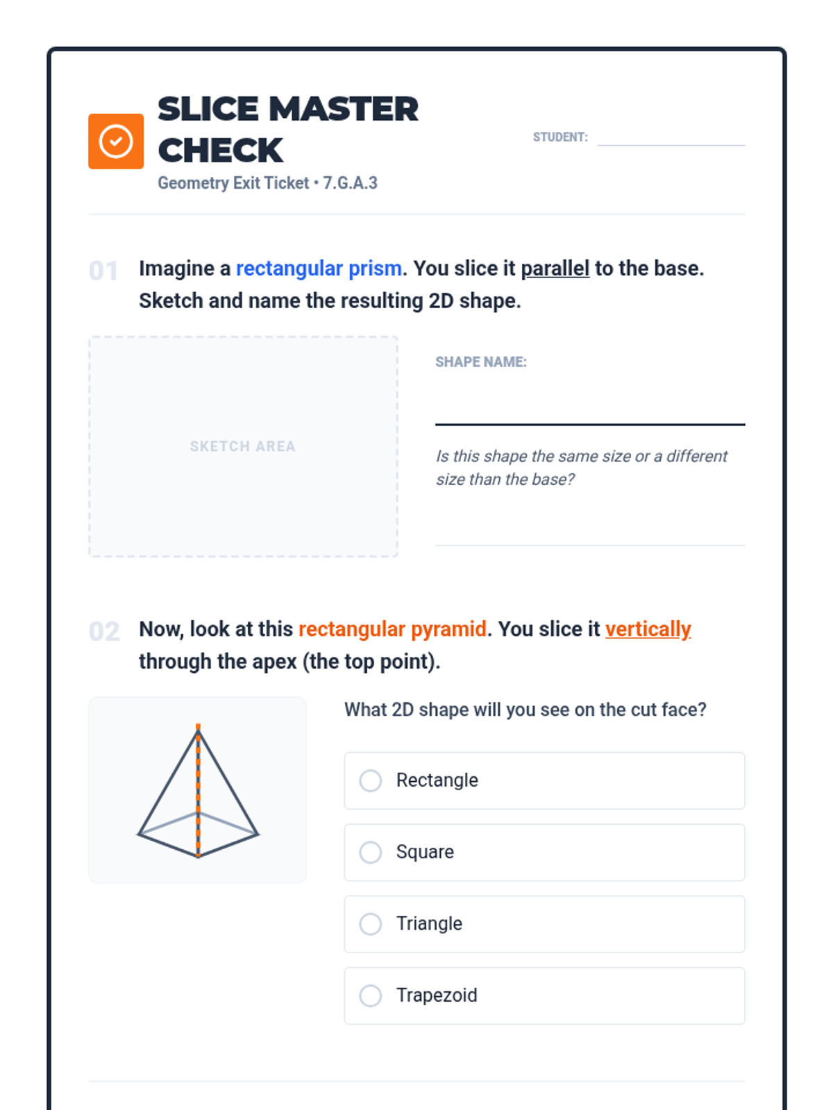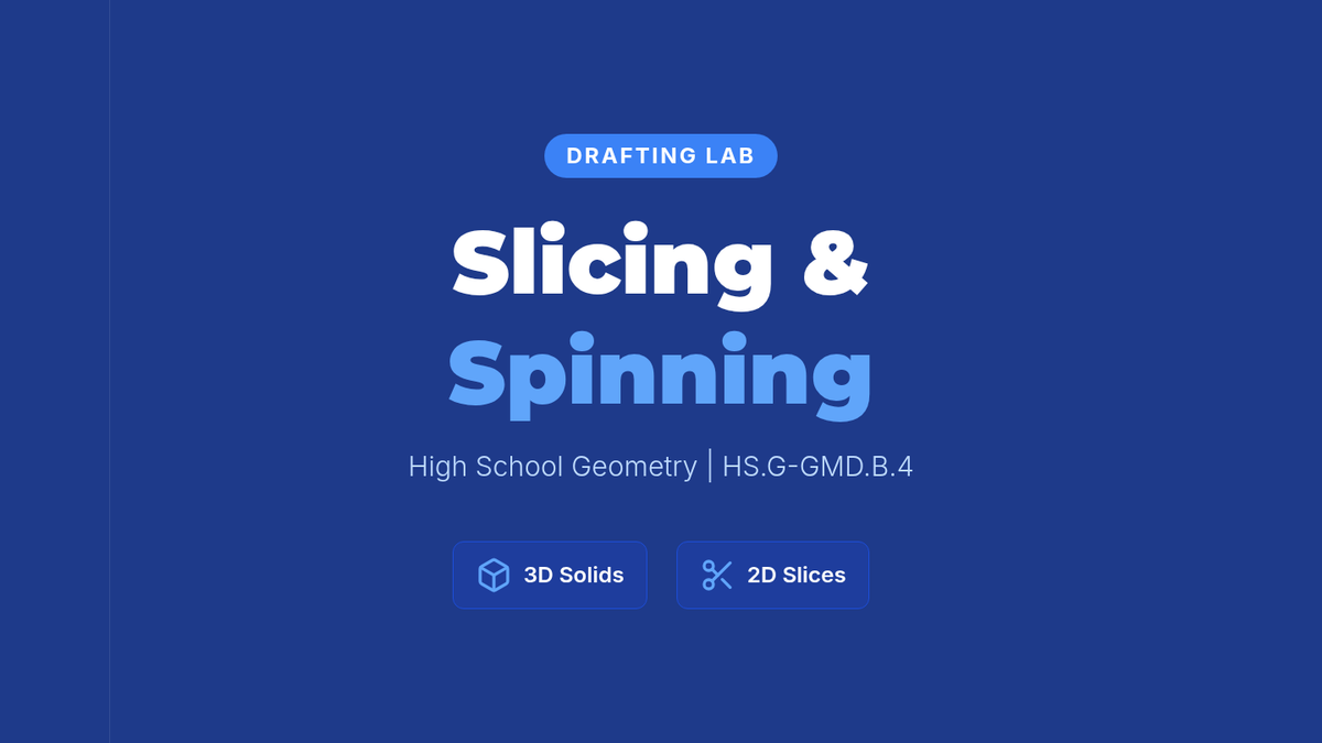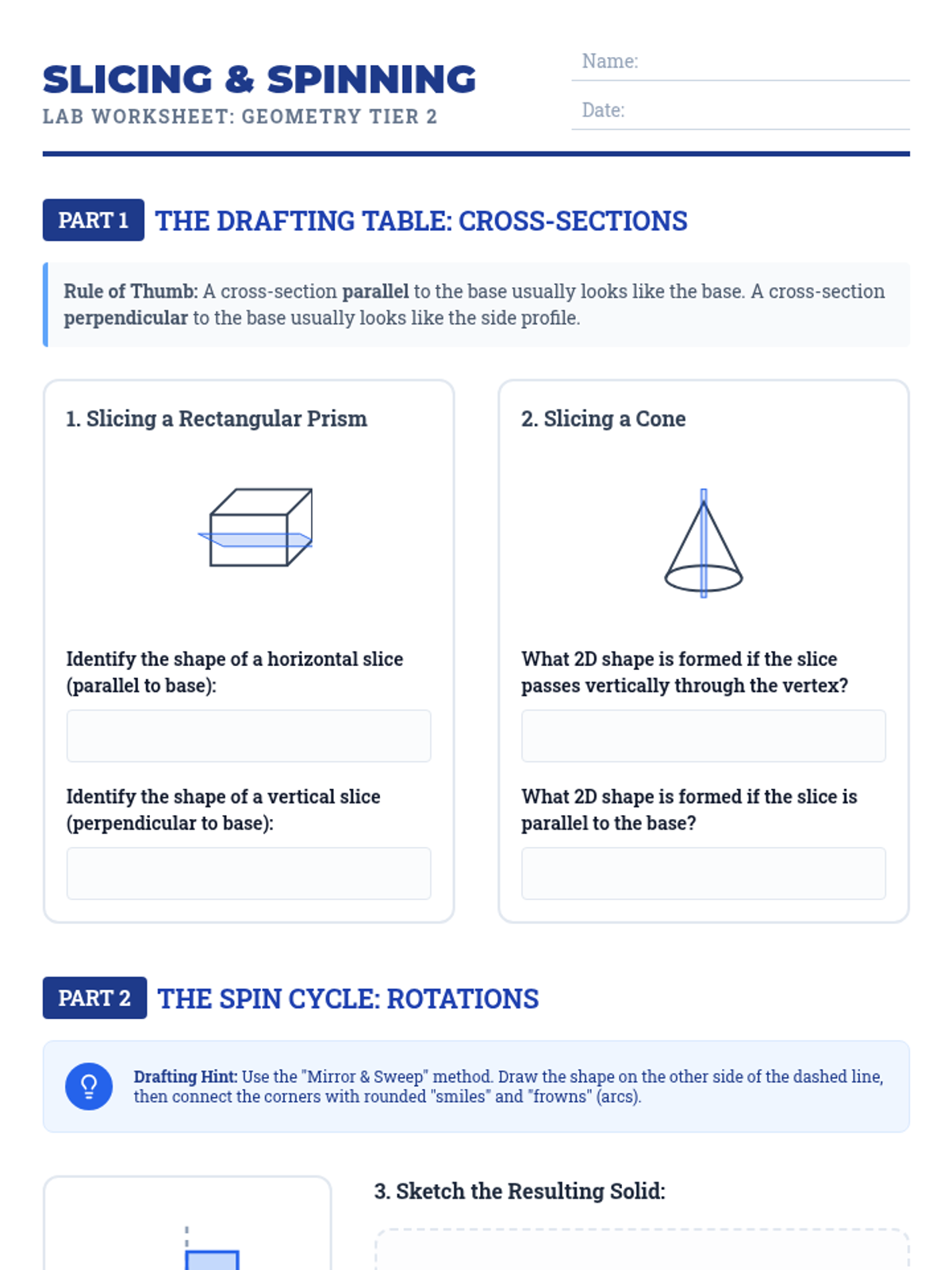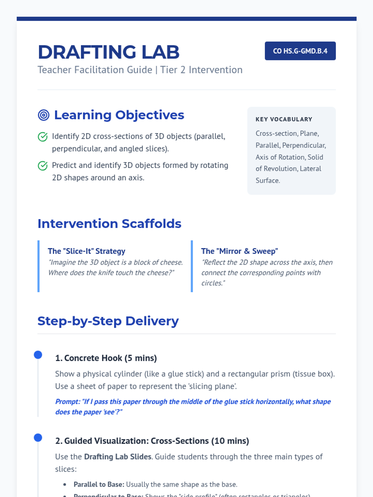 A targeted Tier 2 intervention lesson focusing on the visualization of cross-sections and solids of revolution. Students use a 'Drafting Lab' theme to master identifying 2D slices and 3D rotations through scaffolded practice and visual models.