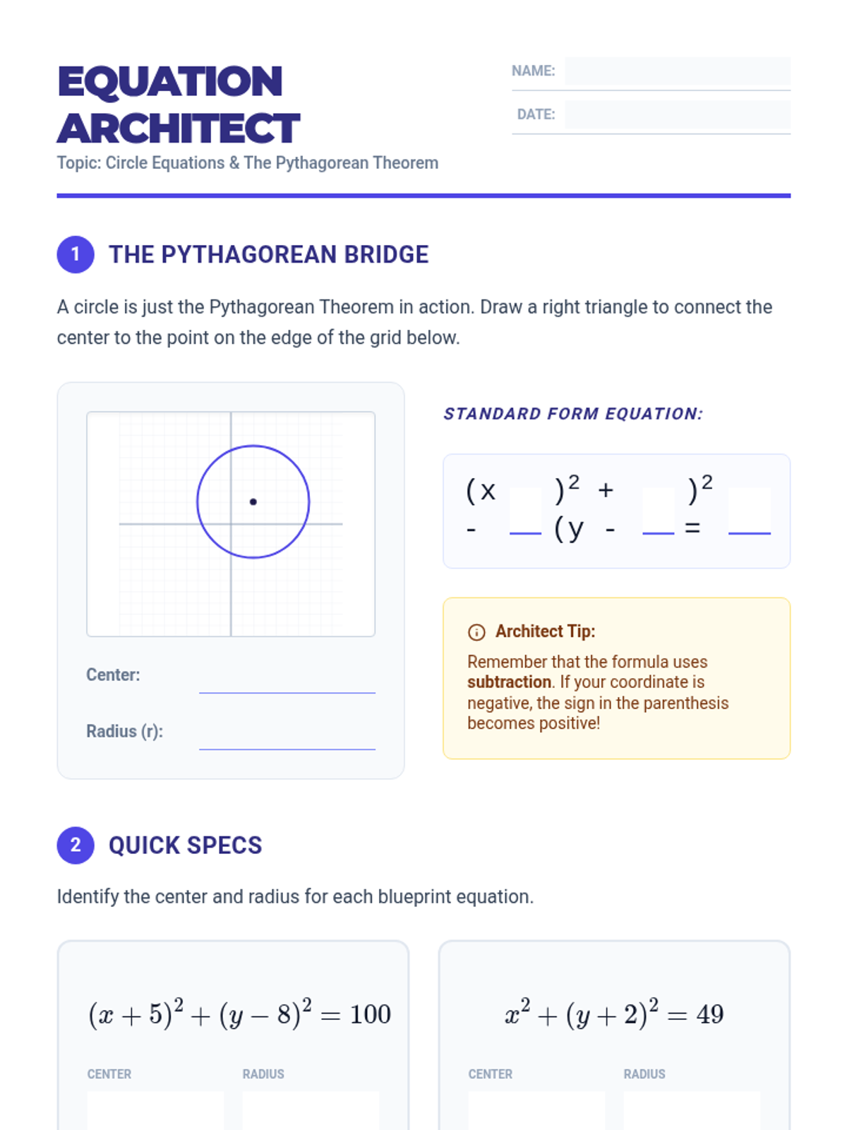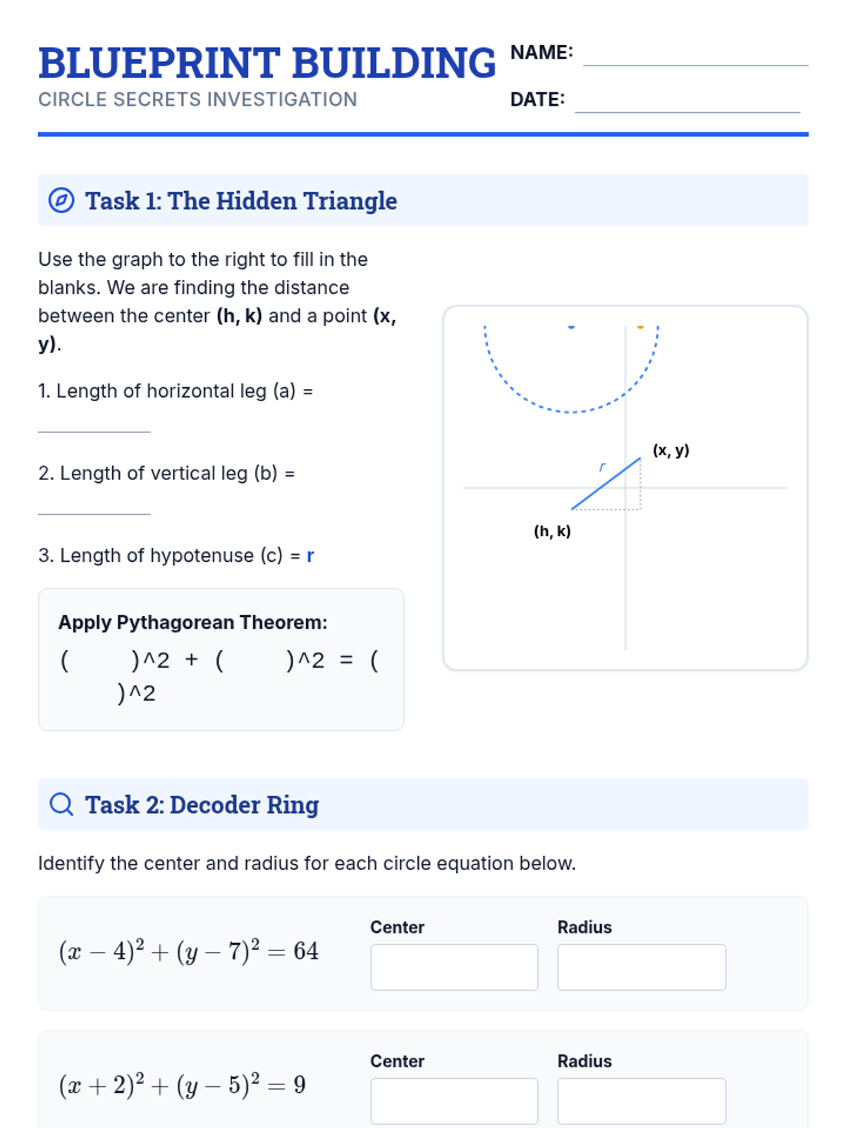 Students connect the Pythagorean Theorem to the distance formula and the equation of a circle, then master completing the square through guided algebraic scaffolds.