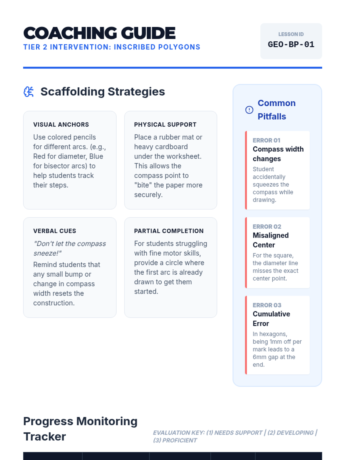 A Tier 2 intervention lesson focusing on the geometric logic and step-by-step construction of regular polygons inscribed in circles. Designed for small group support with visual scaffolding and collaborative inquiry.