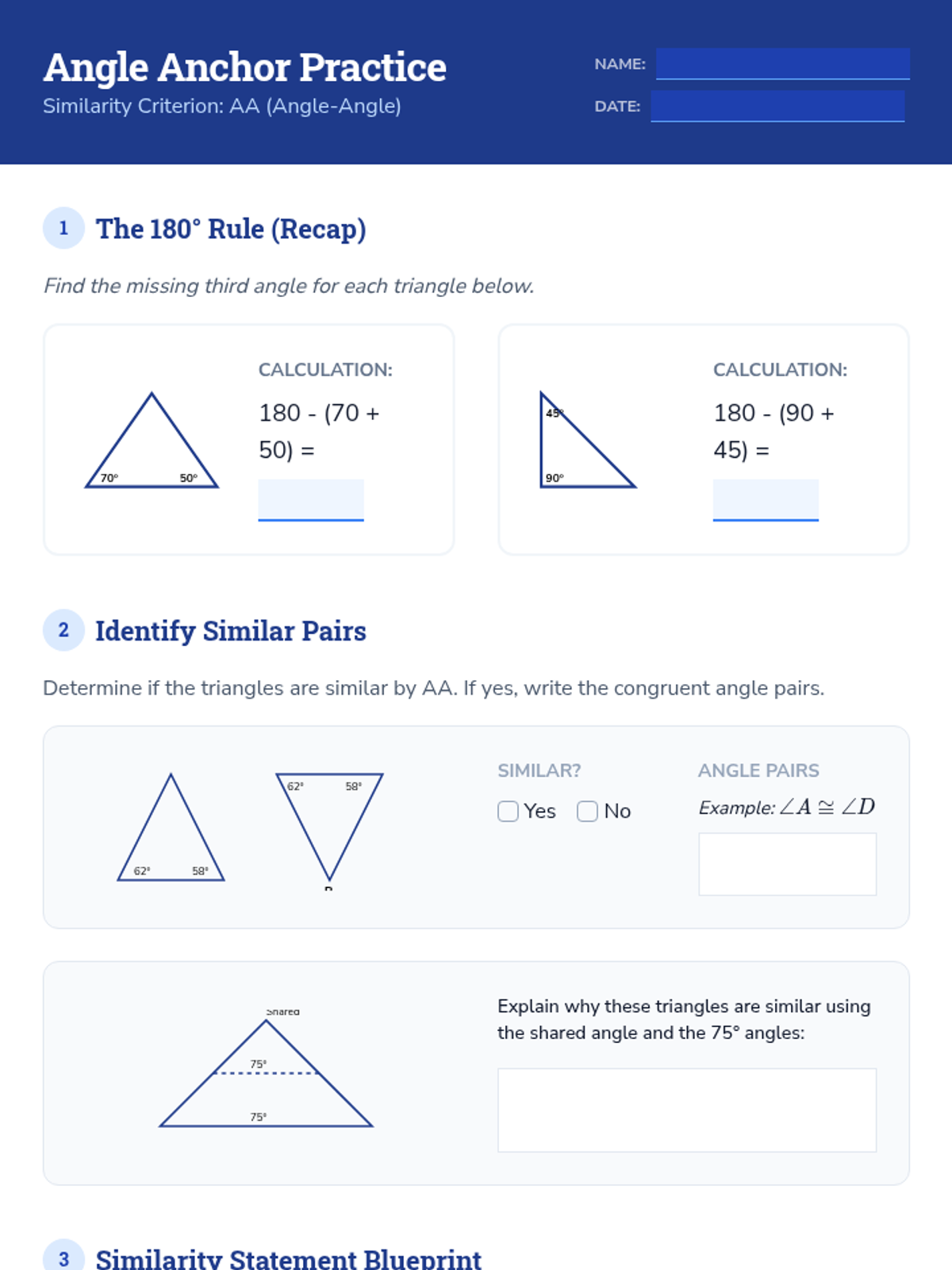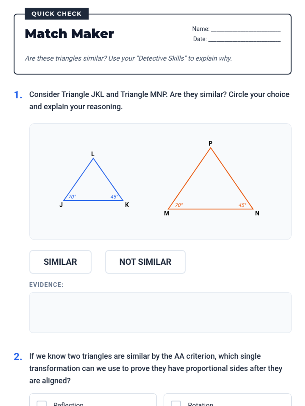 A targeted intervention lesson designed to help students bridge the gap between transformations and the AA similarity criterion through visual proofs and scaffolded practice.