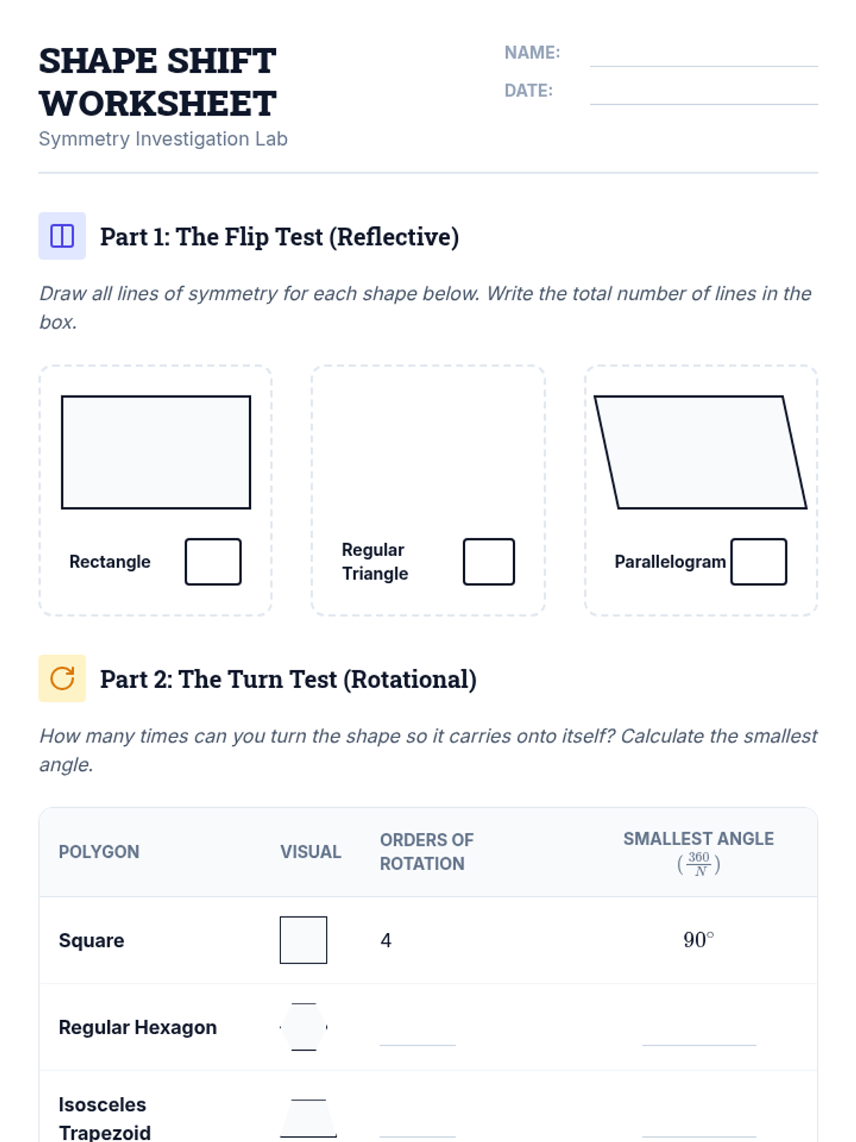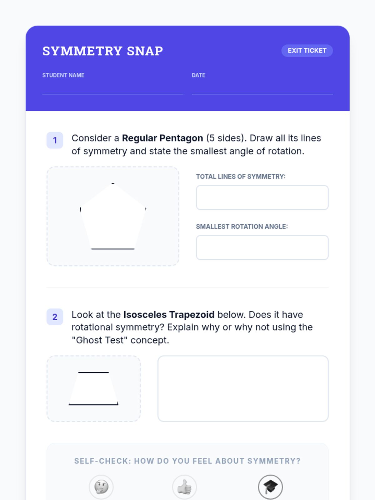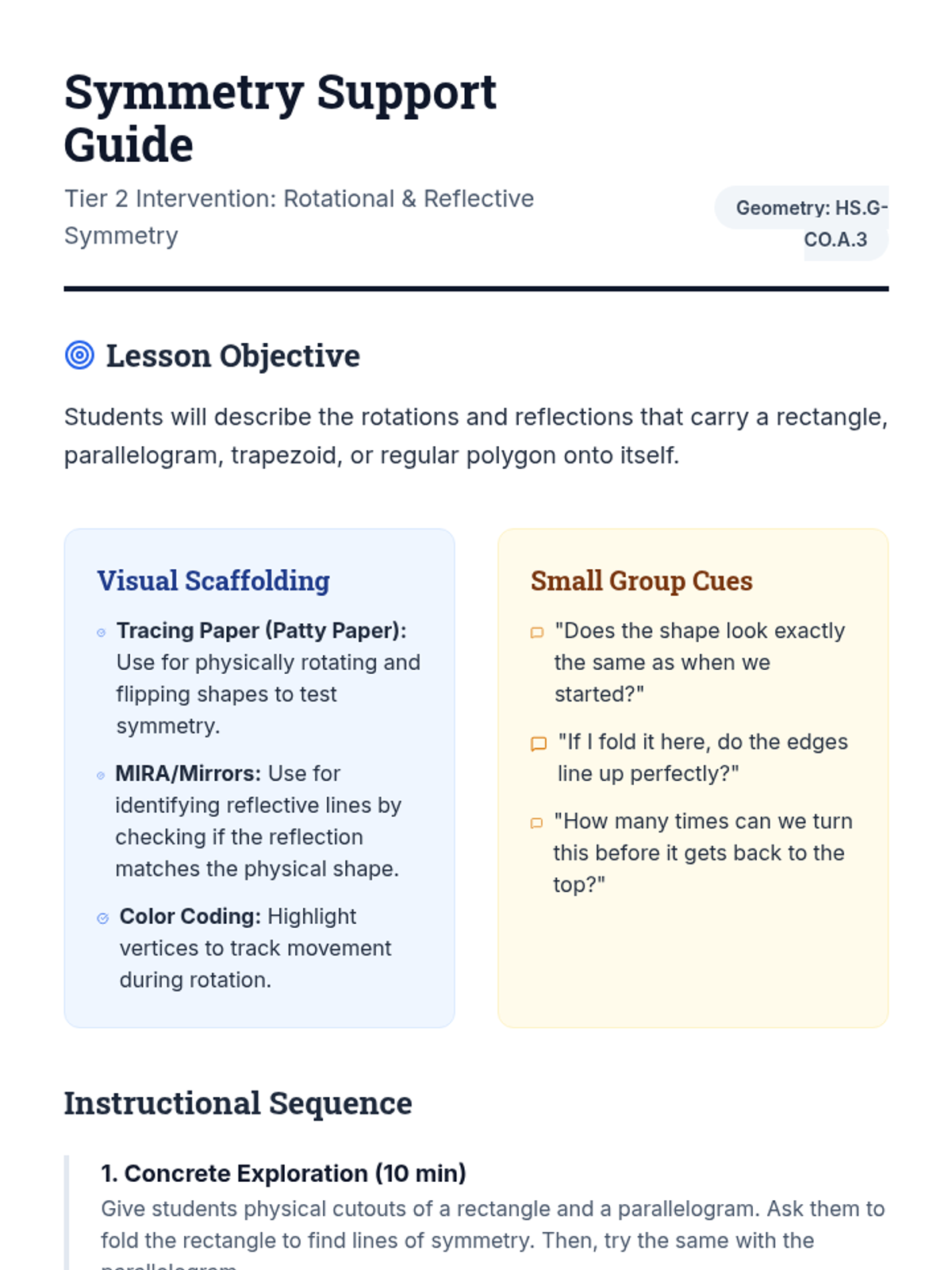 A Tier 2 intervention lesson focused on identifying reflective and rotational symmetry in polygons, helping students visualize how shapes carry onto themselves.