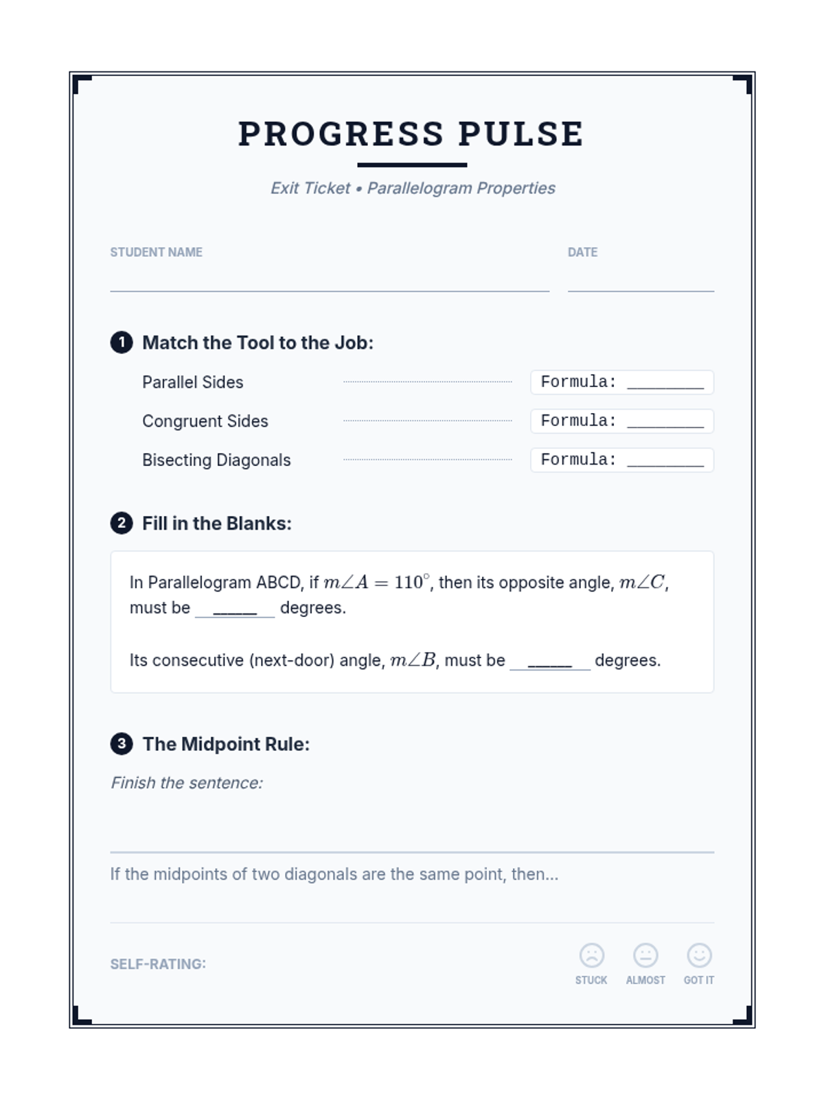A culminating lesson featuring a mixed review of all quadrilateral proofs and a formal assessment of unit mastery.