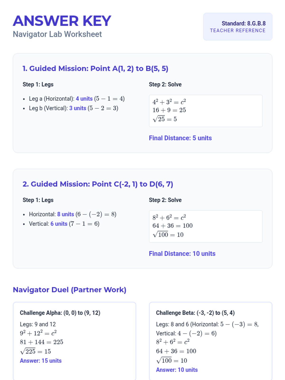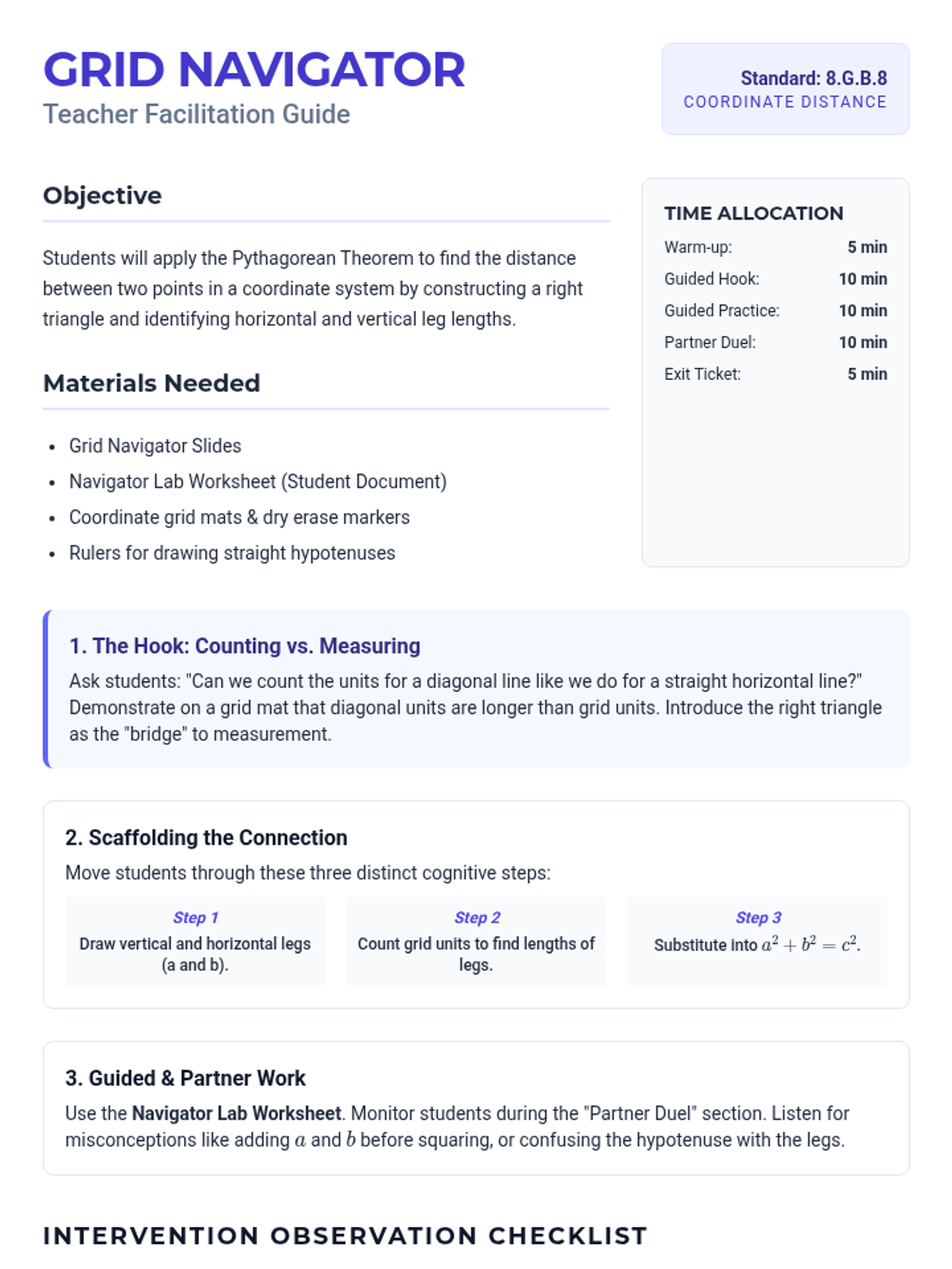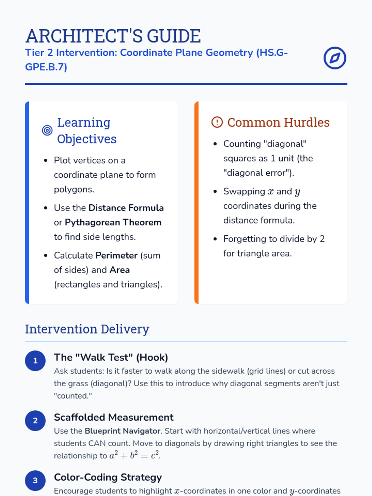 A Tier 2 intervention lesson focusing on using the Pythagorean Theorem to find the distance between two points on a coordinate plane. Students move from counting grid units to applying the formula through visual scaffolding.