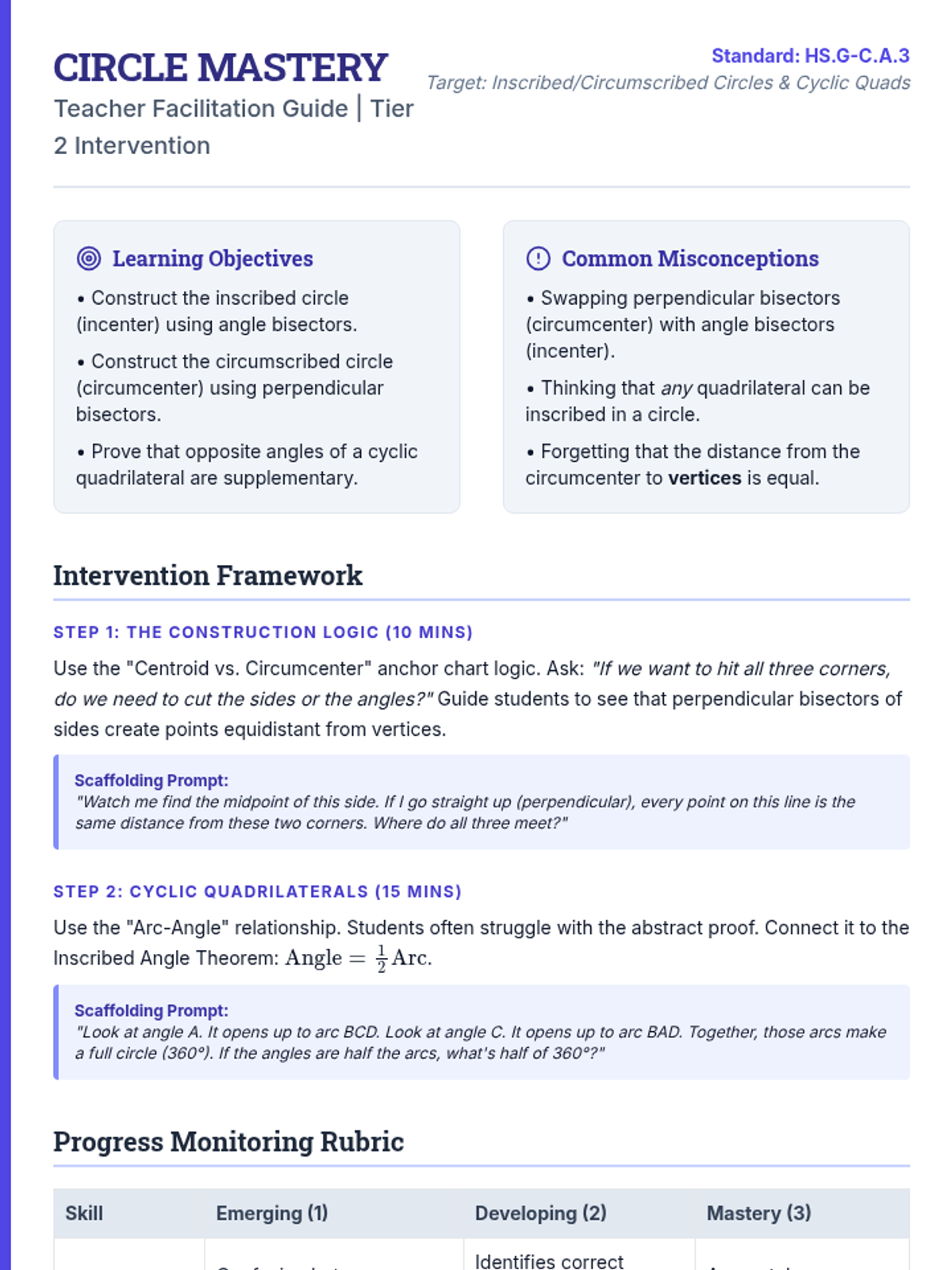 A Tier 2 intervention lesson focusing on geometric constructions (inscribed/circumscribed circles) and proving angle properties of cyclic quadrilaterals using scaffolded support.